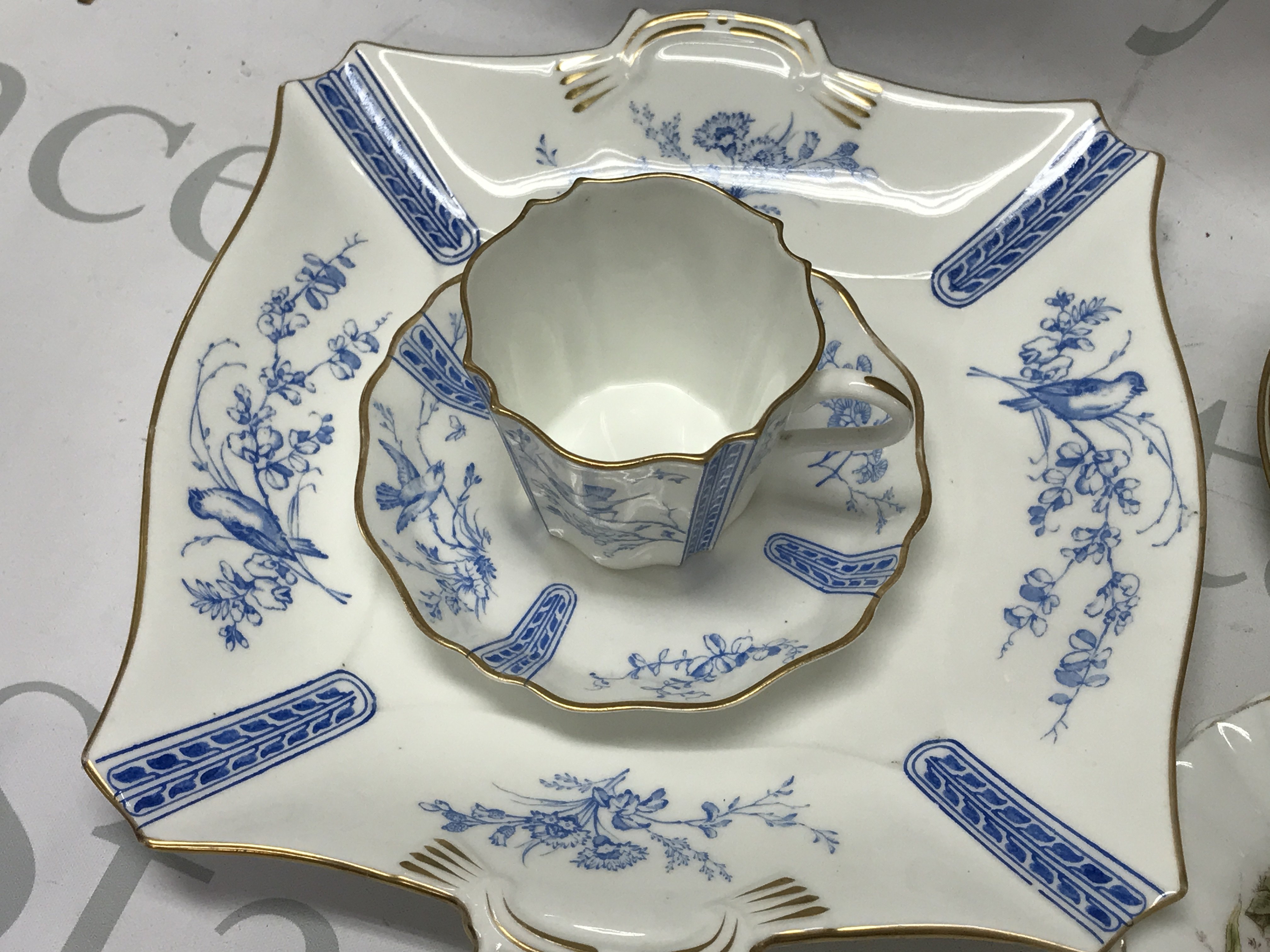 A collection of ceramics including Meissen second condition plate, cup and saucer, 19th century Wedgewood plate , cup and saucer, Damask biscuit barrel , blue glass Victorian enamel decorated jugs, James Kent marigold. This lot cannot be posted.- NO RESERVE