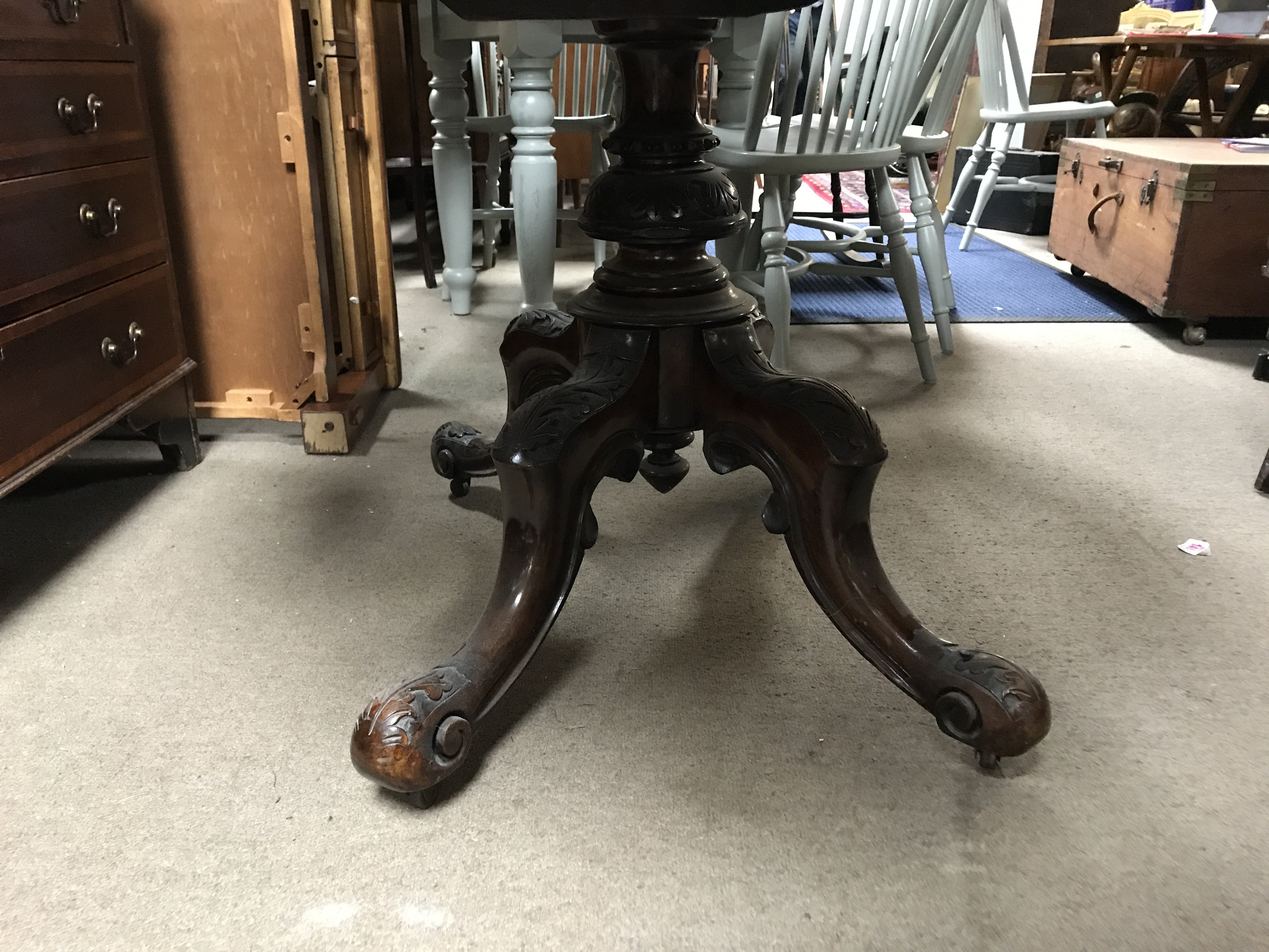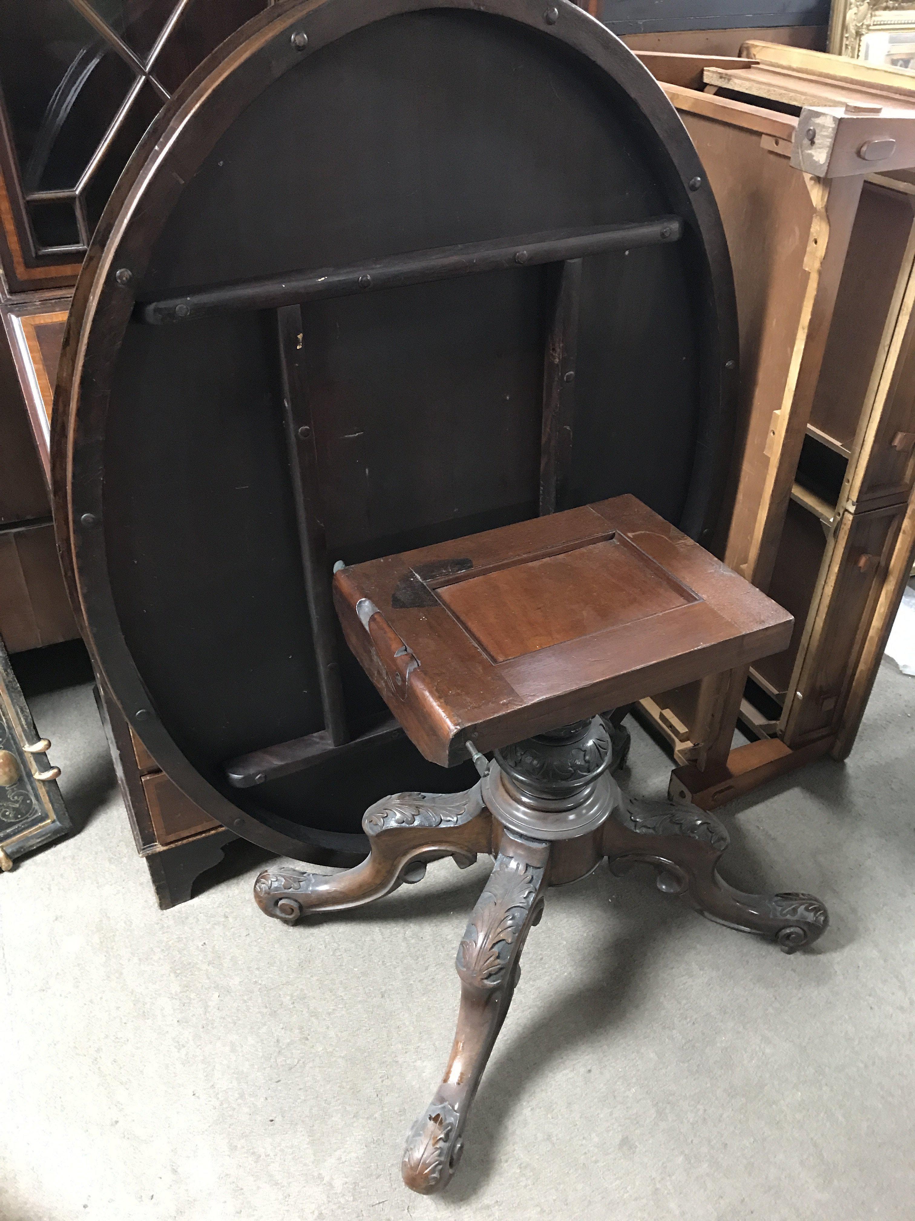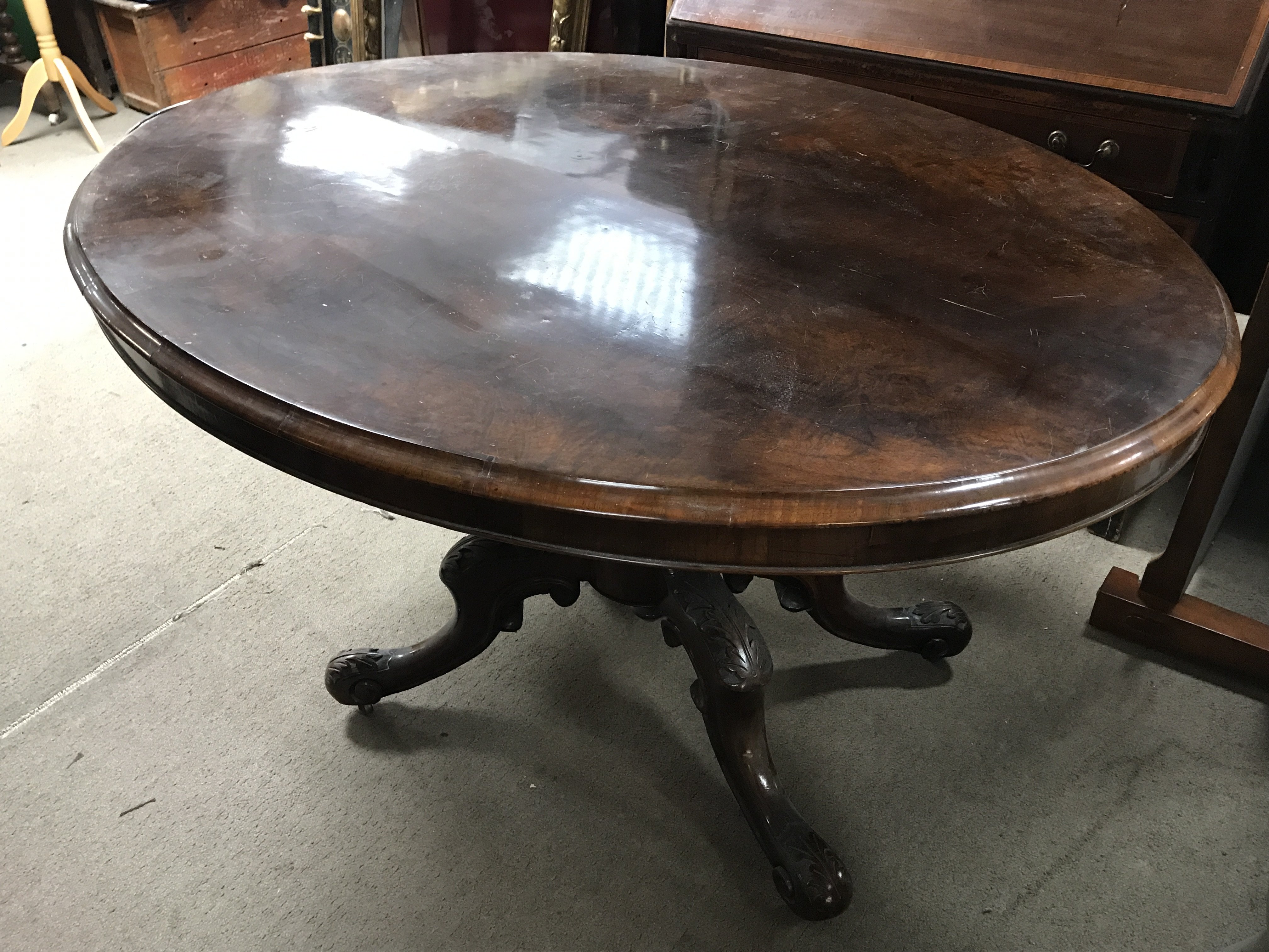 A Victorian walnut tip action table with a circular shape length 102cm x width 132cm x 75cm tall