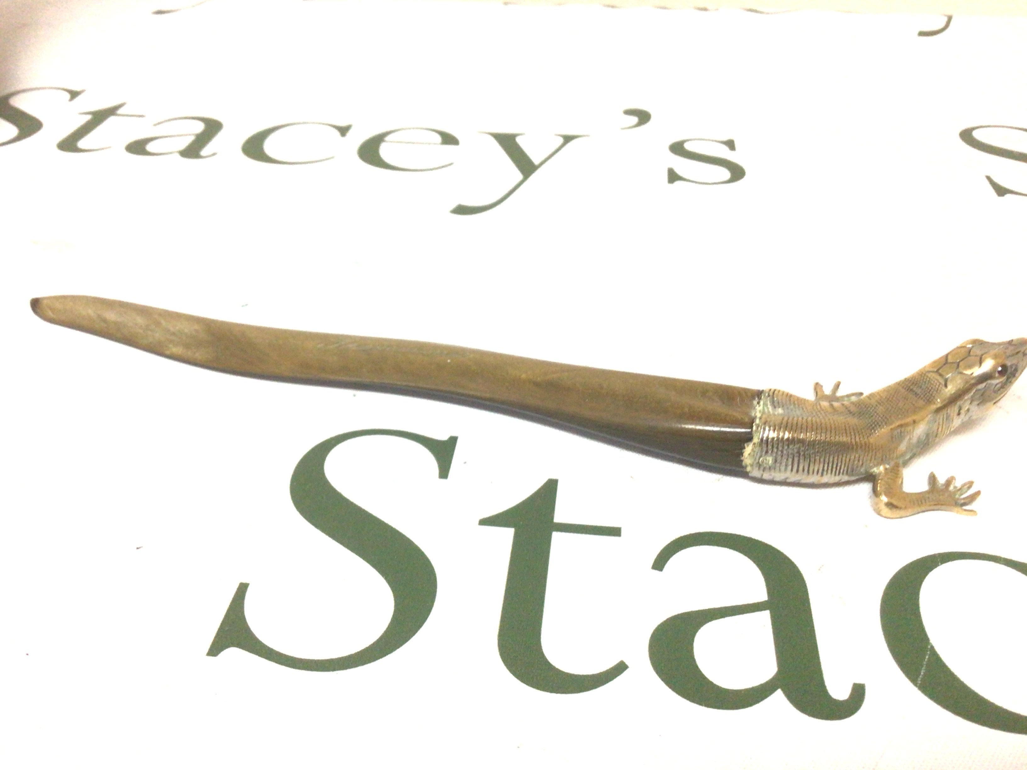 An Antique paper Knife with a shaped horn blade the end in the form of a lizard made in brass.- NO RESERVE