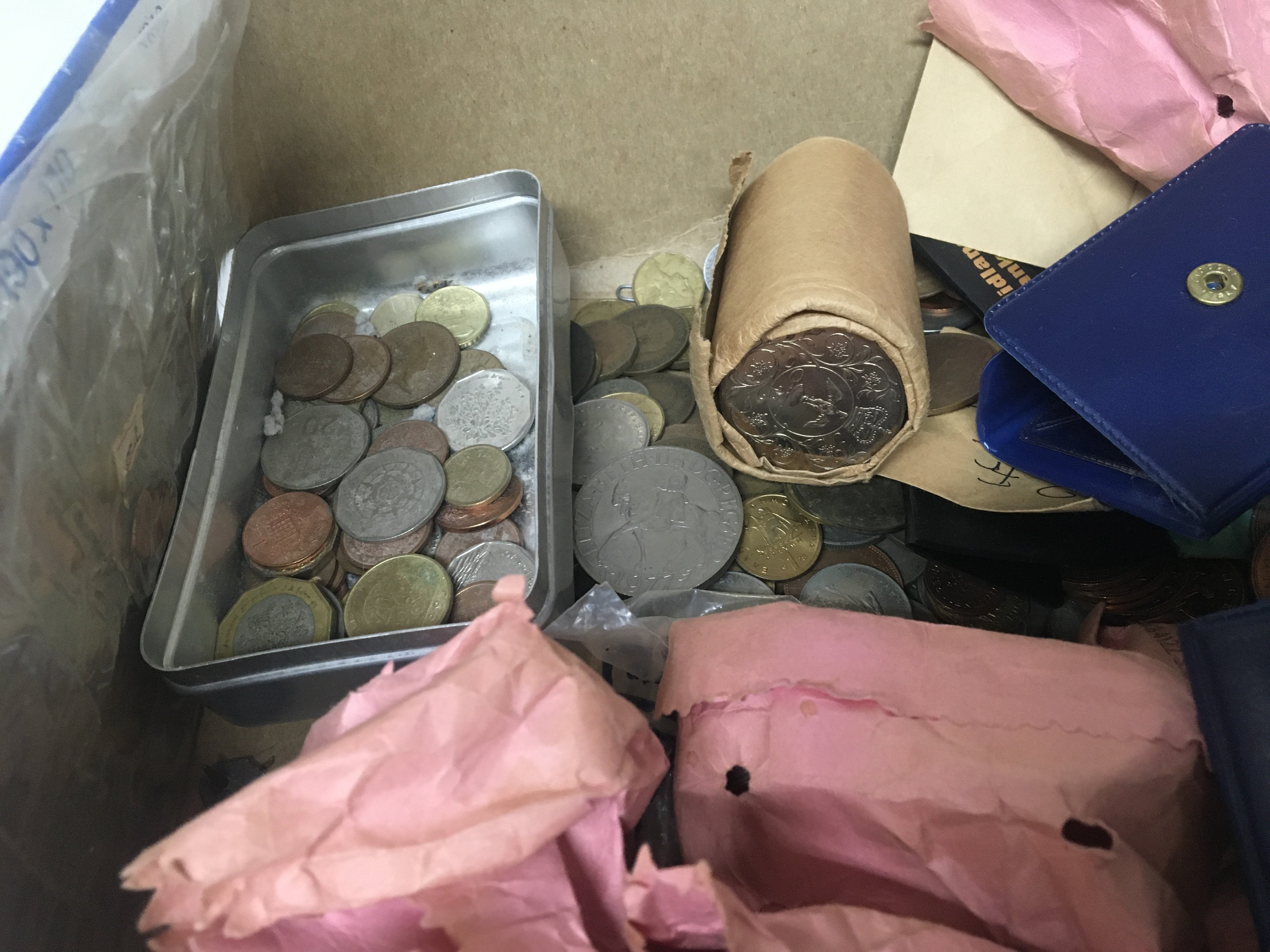 A box containing a collection of British pre and post decimal coinage commemorative crowns and some Italian 1974 commemorative coinage in presentation packs.
