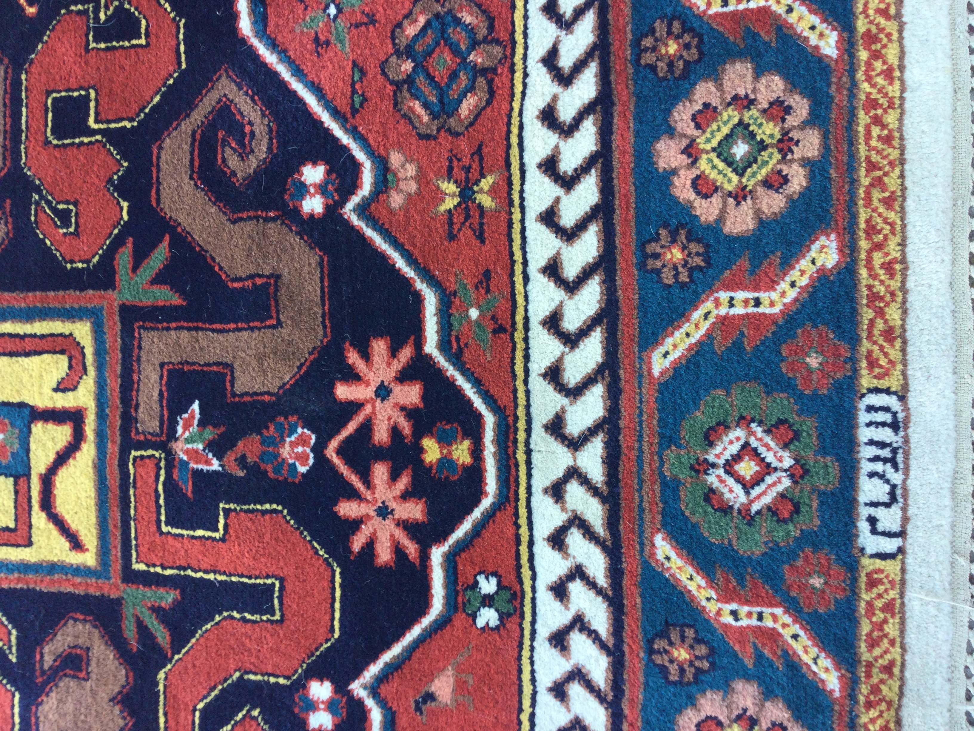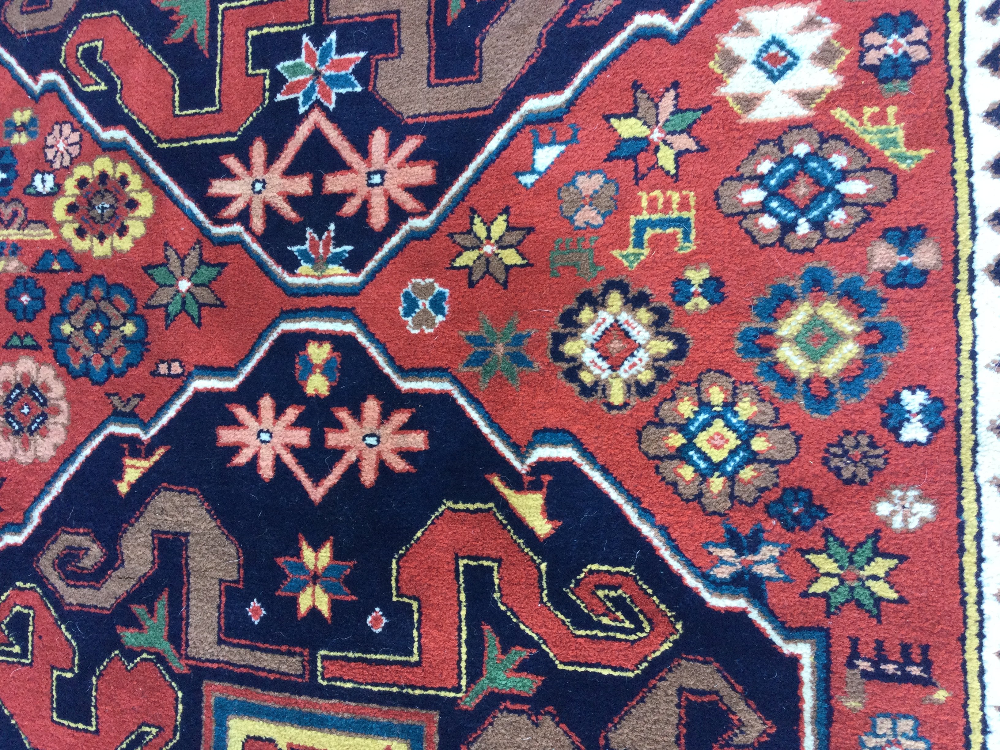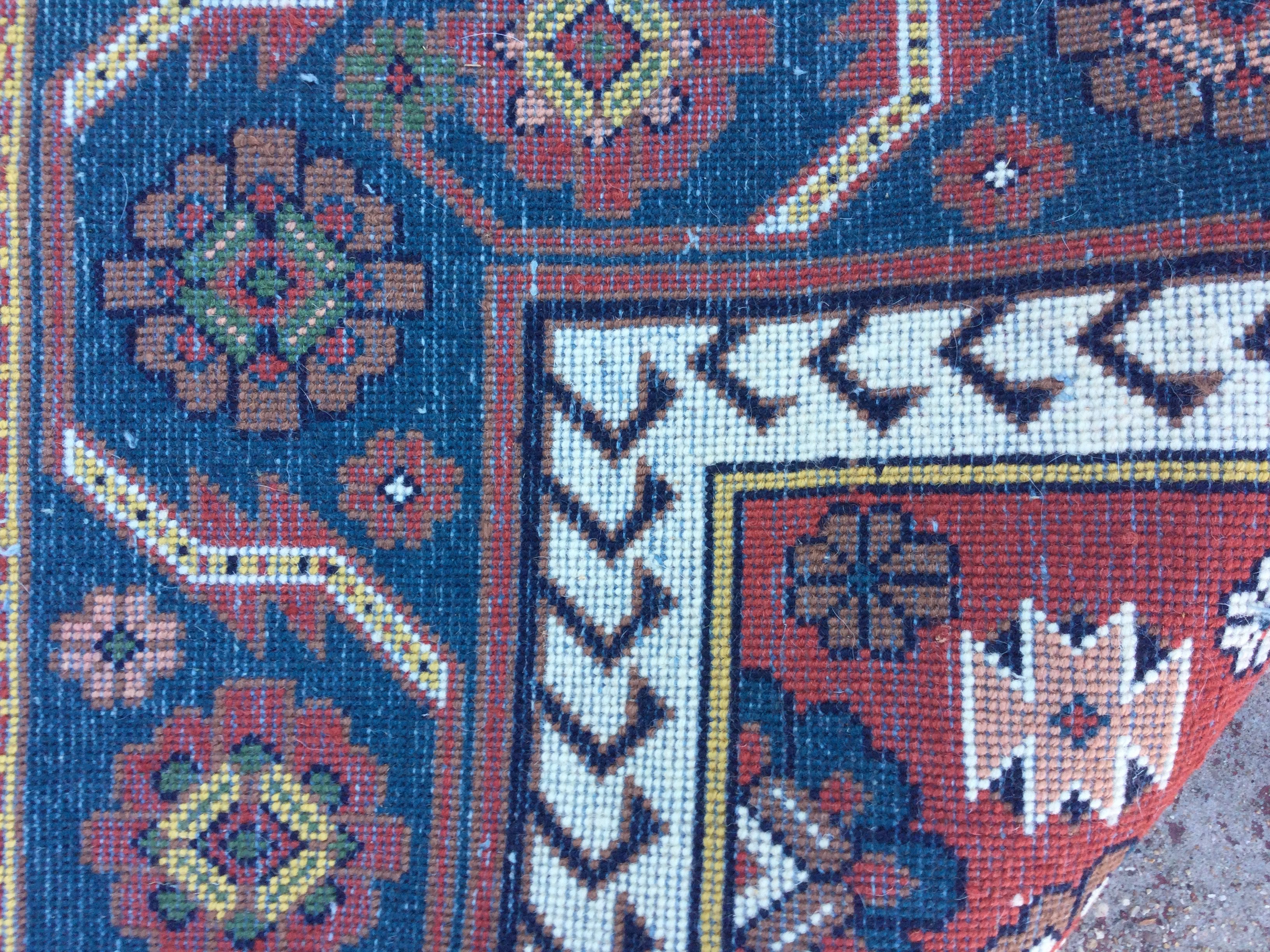 A Kazak Rug with central geometric design and floral boarders . 212 x 142 cm .