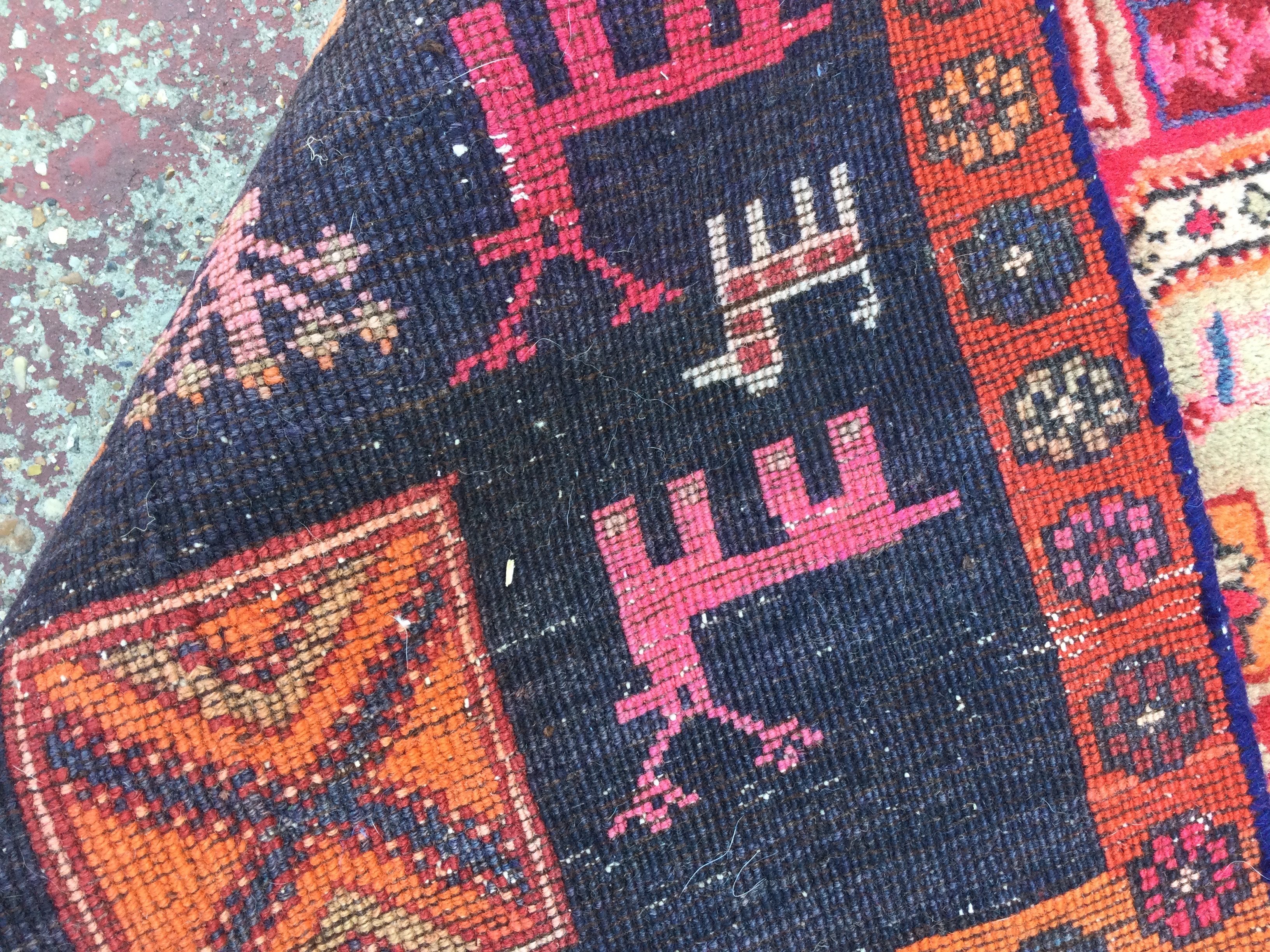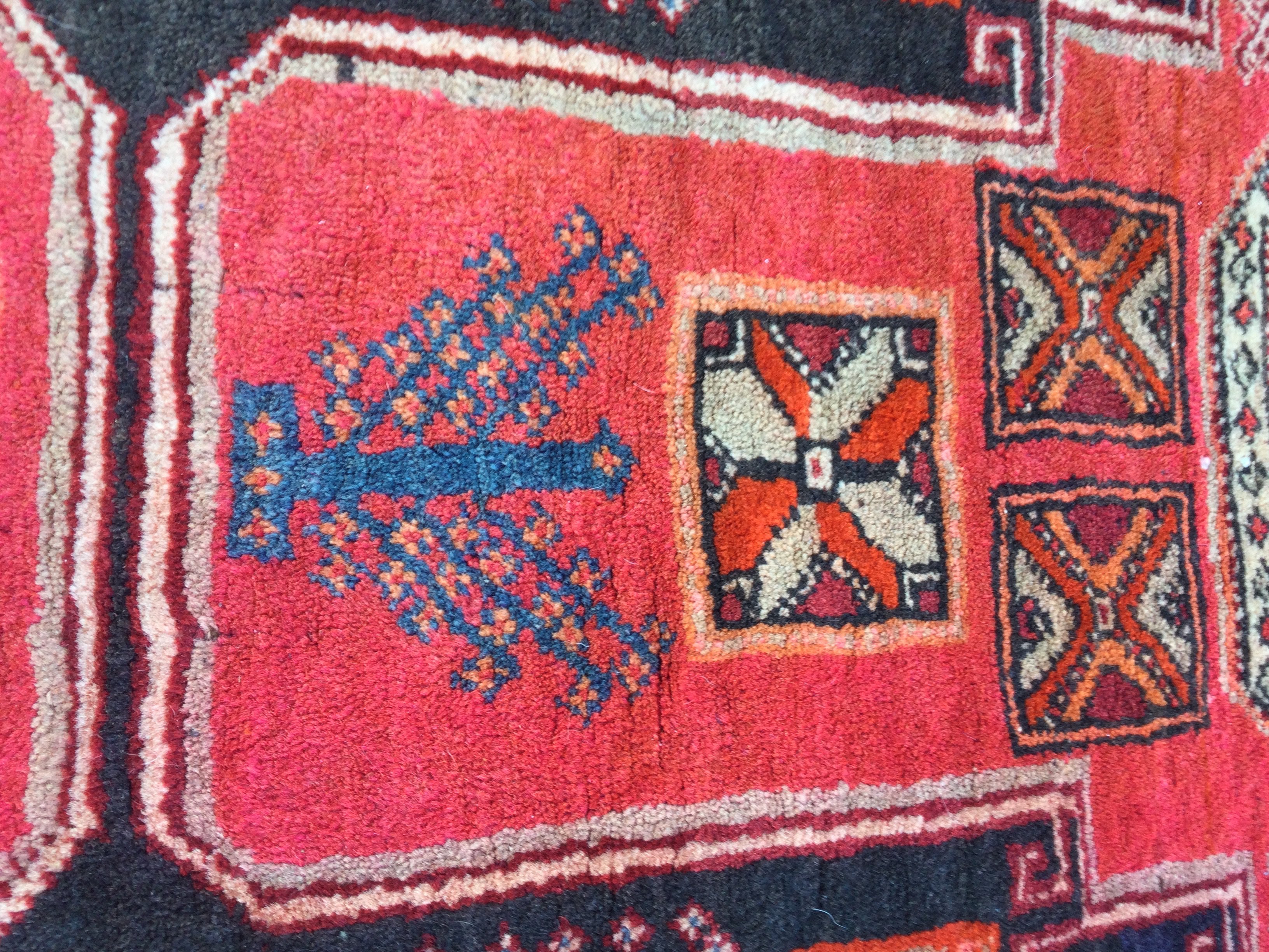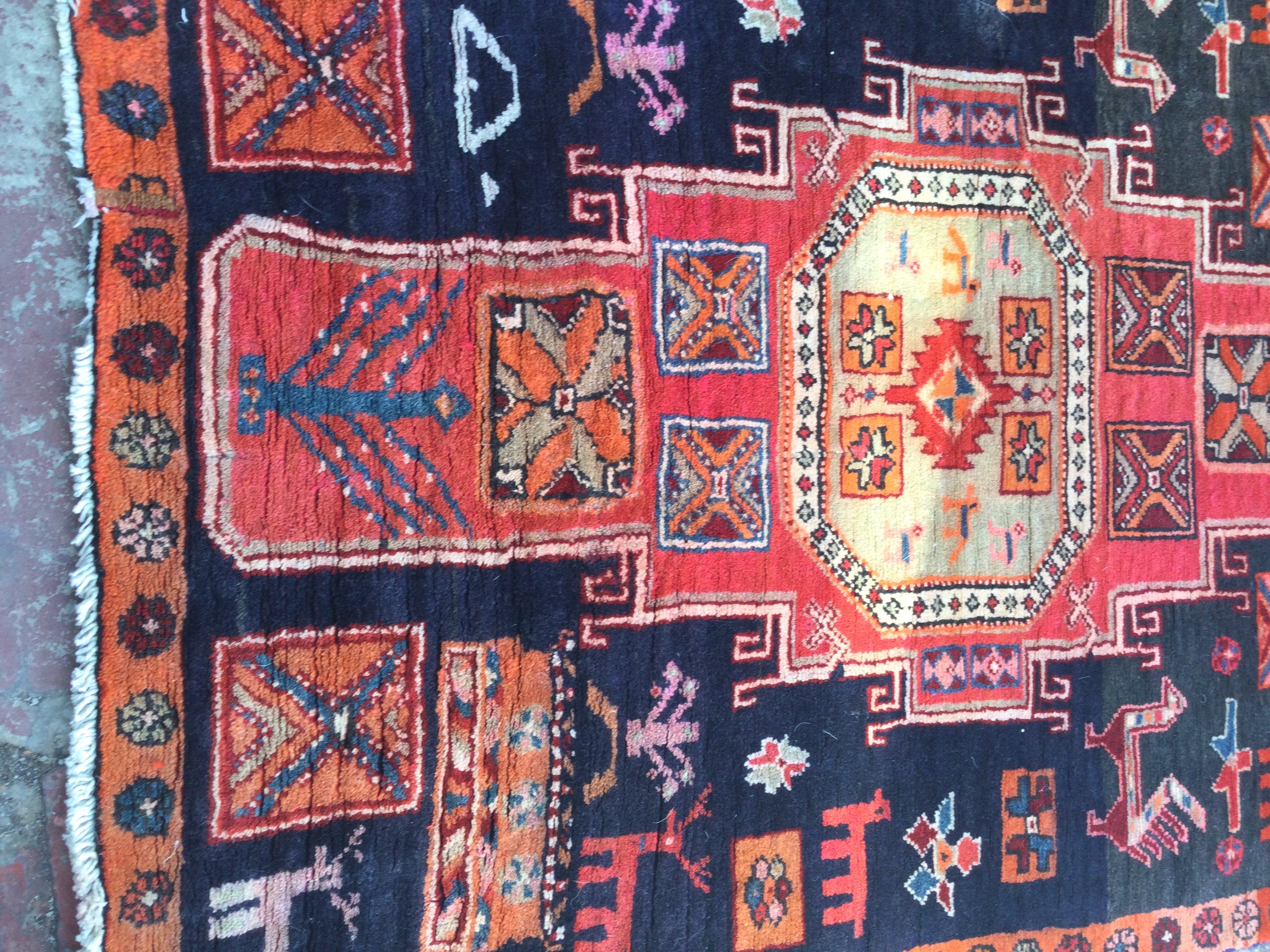 A Persian geometric and animal design runner if a red an blue field. 215 x 118 cm .