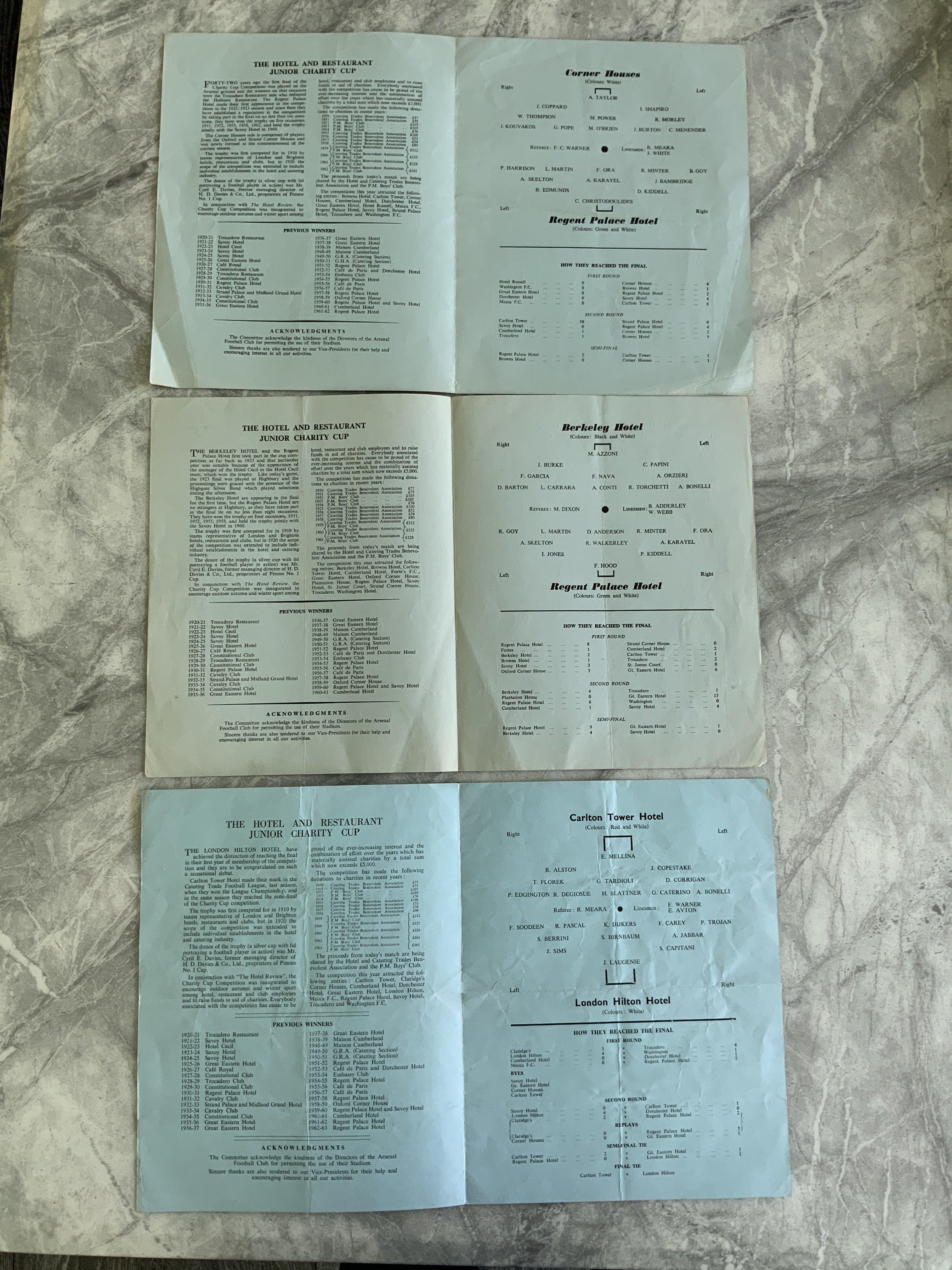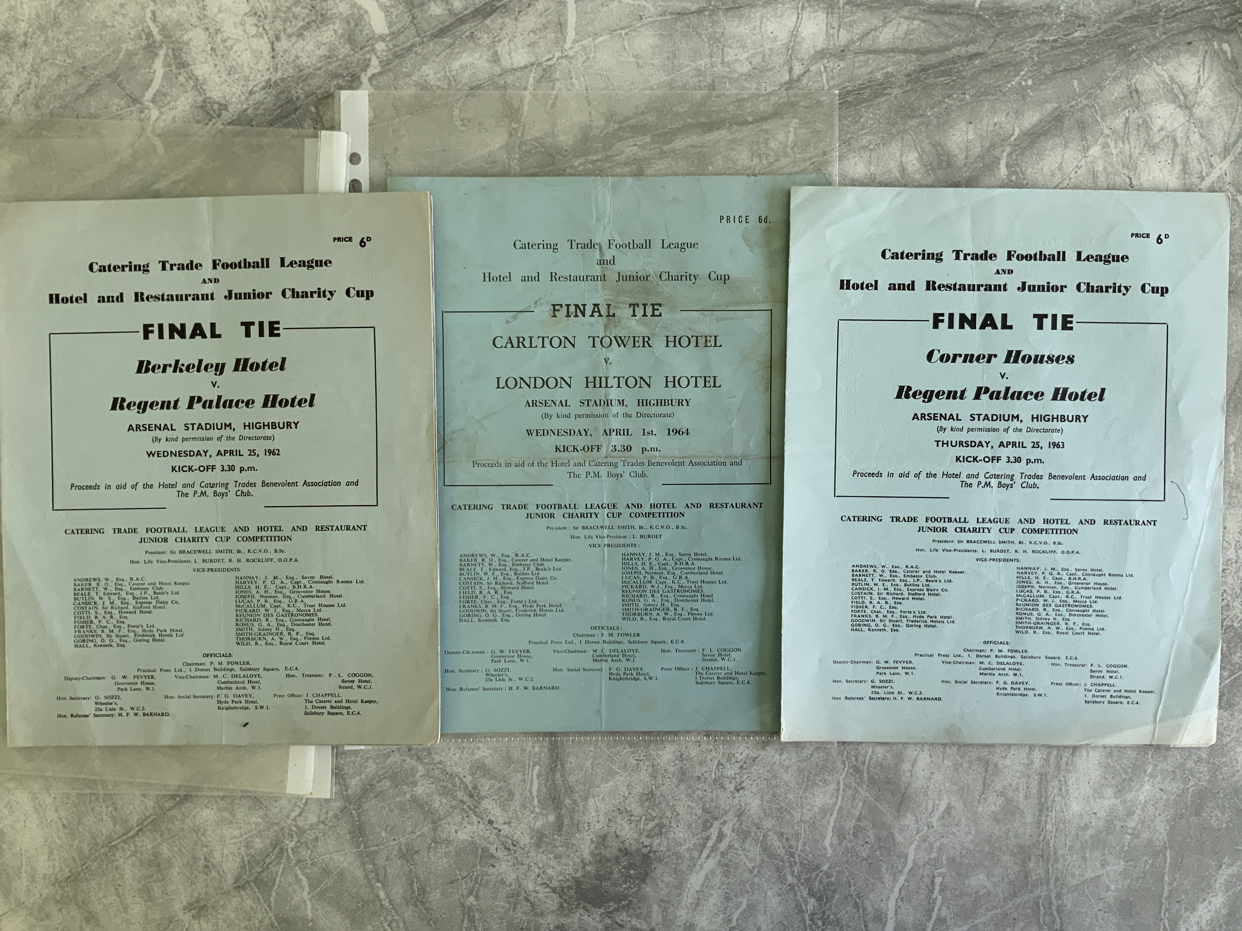 1960s Catering Trade Cup Final Football Programmes: Very rare programmes for matches played at Highbury. Officially named the Catering Trade Football League + Hotel and Restaurant Junior Charity Cup. Large blue programmes for 61/62 Berkeley Hotel v Regent Palace Hotel, 62/63 Corner Houses v Regent Palace Hotel and 63/64 Carlton Tower Hotel v London Hilton Hotel with slight marks. Good. (3)