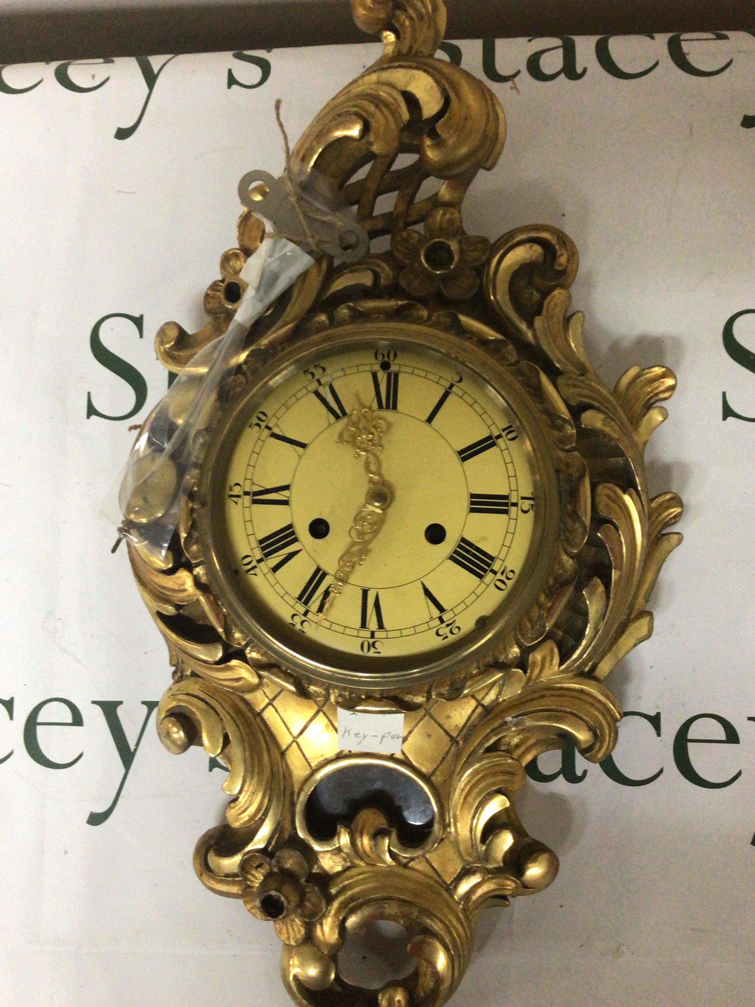 A Gilt wood Gesso wall clock of Rocco design with folate scrolls. With pendulum and key. 58cm