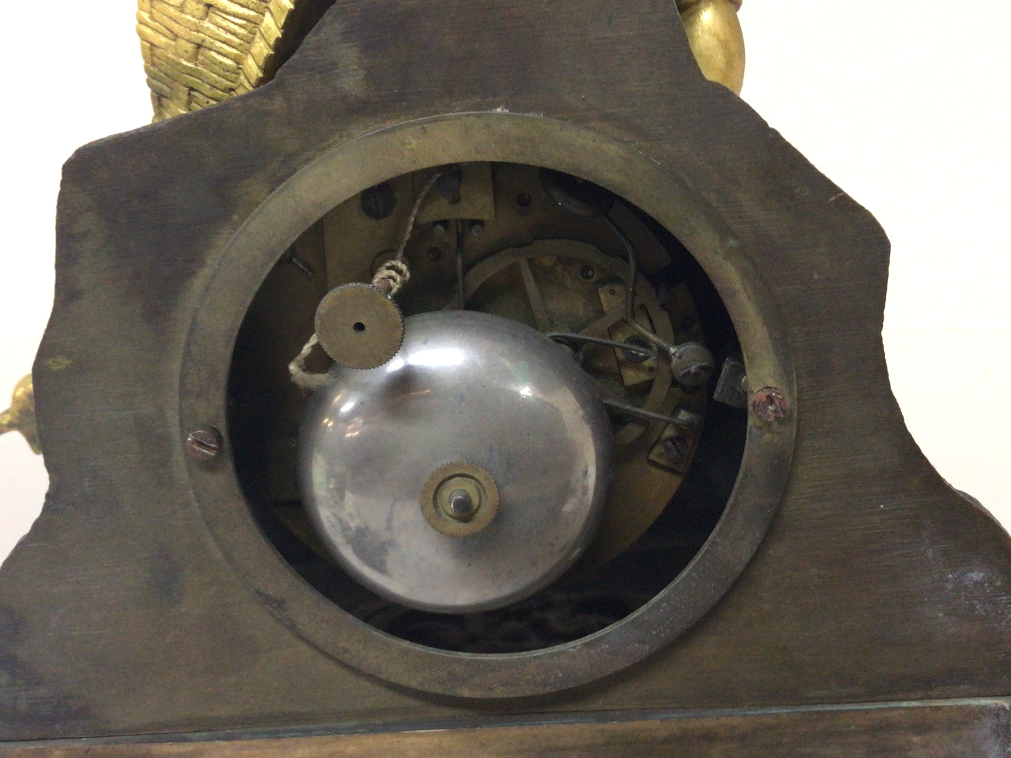 A French late 19th century gilt metal mantel clock the case surmounted with a figure with a basket of grapes the lower section with folate scrolls. Silk suspension movement with pendulum. Height 35cm