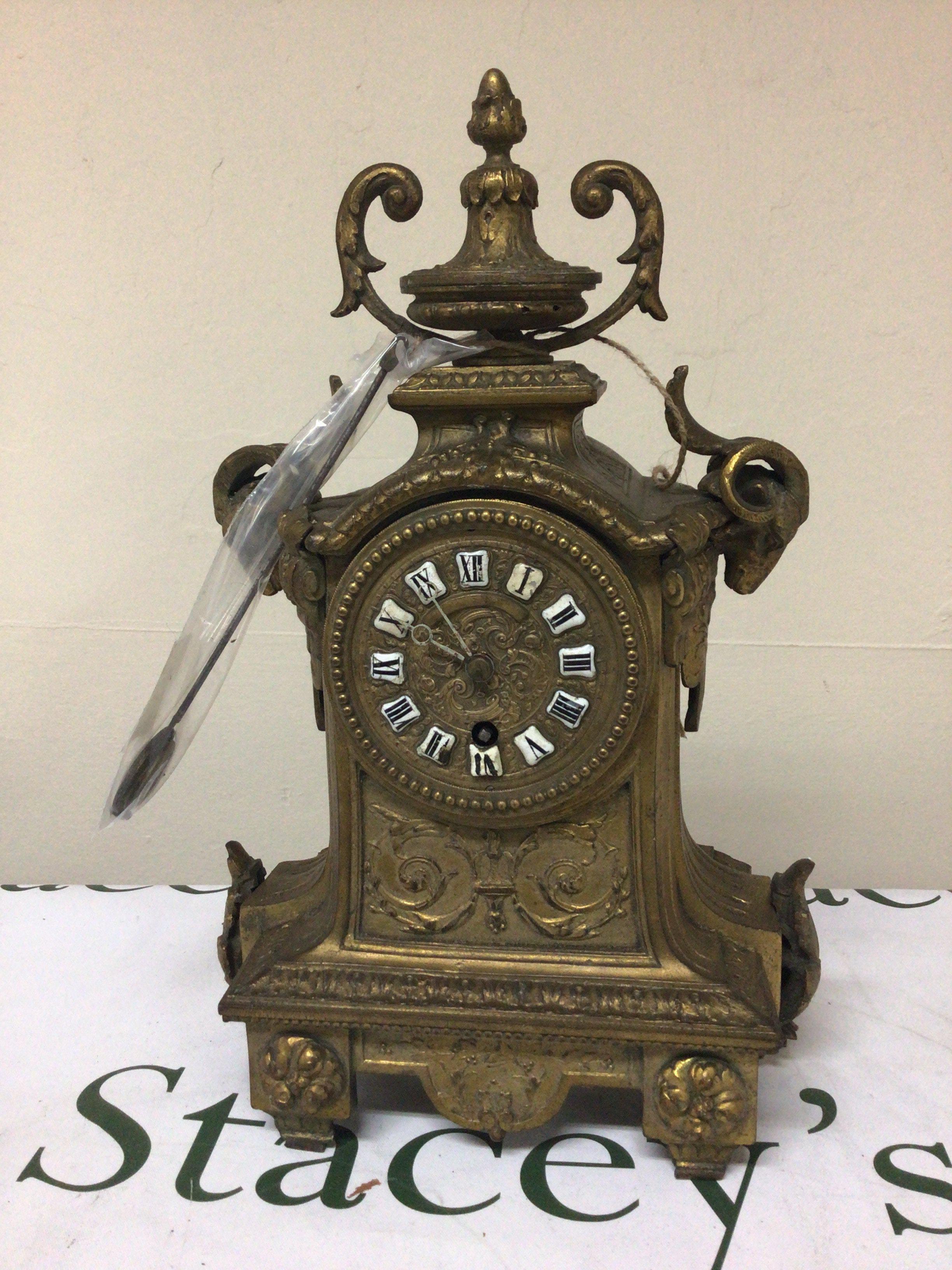 A brass cased French clock late 19th century the sides with rams heads and surmounted with an ornate finial with pendulum height 34cm