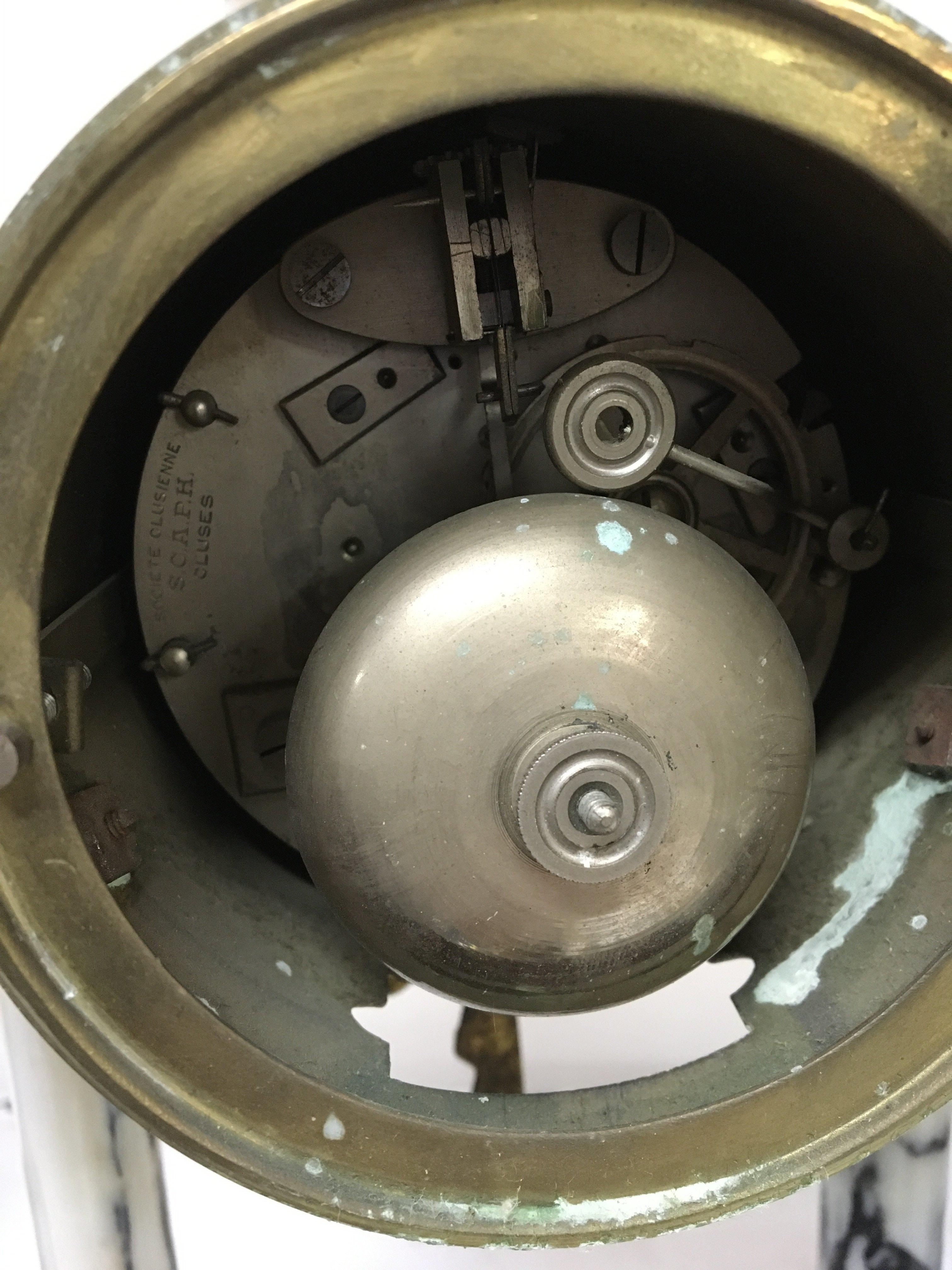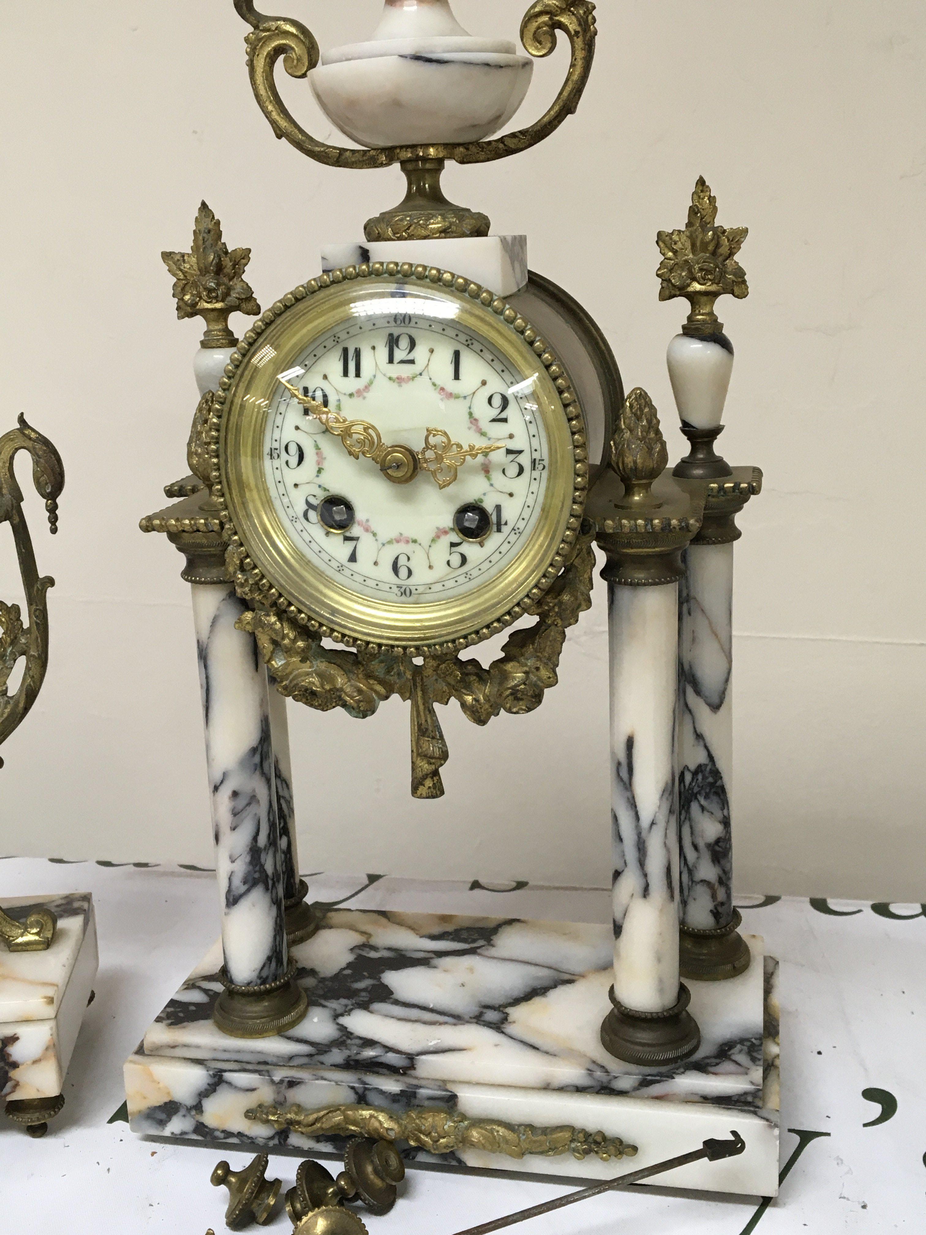A French late 19th century marble clock garniture of Neo classical design with gilt metal mounts the four pillar clock with an enamel dial with key and pendulum and small feet. 40cm height.