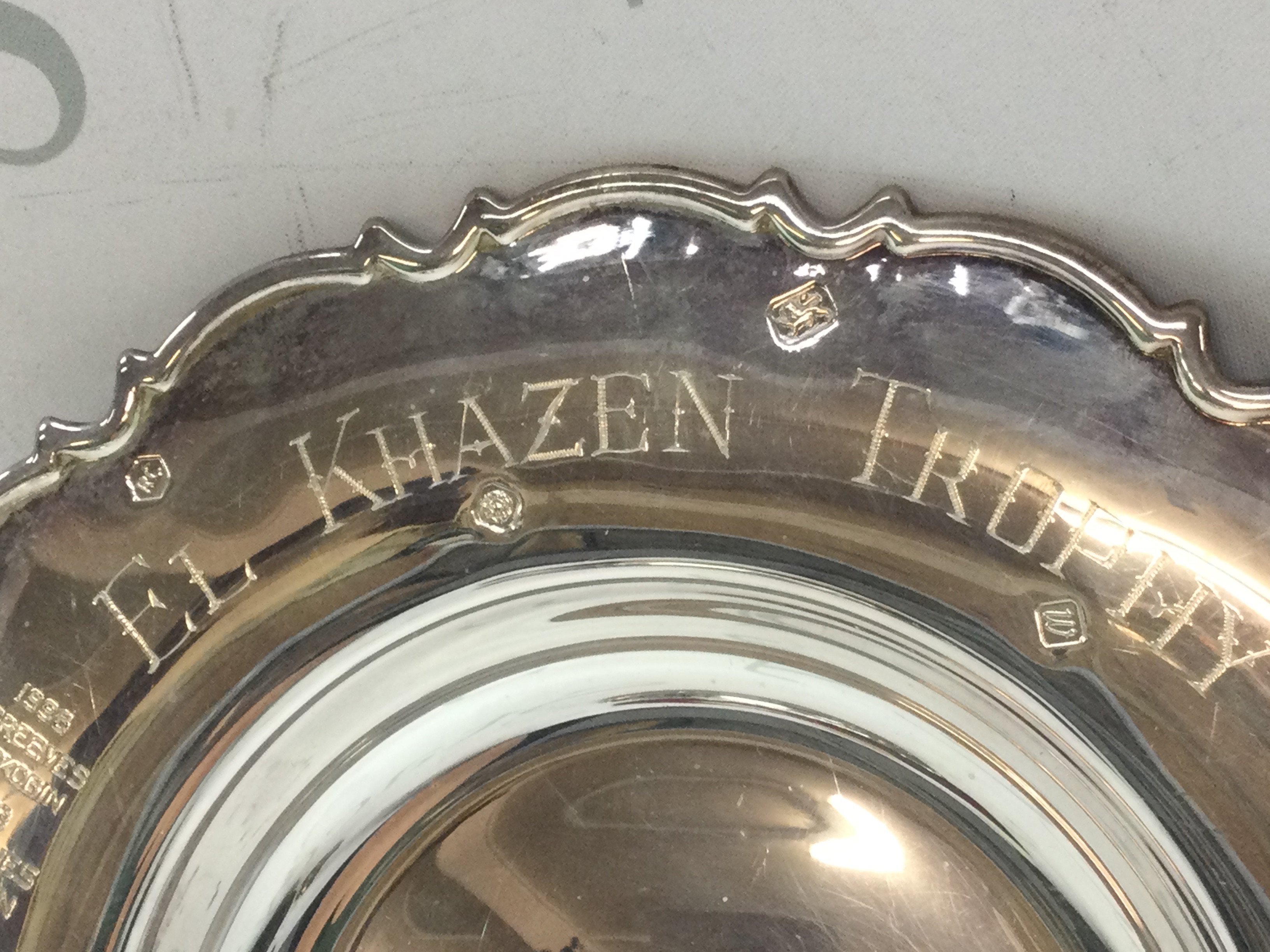A silver hallmarked Trophy dish , El Khazen Trophy Shell Club London and Essex. 25cm wide. Postage category B