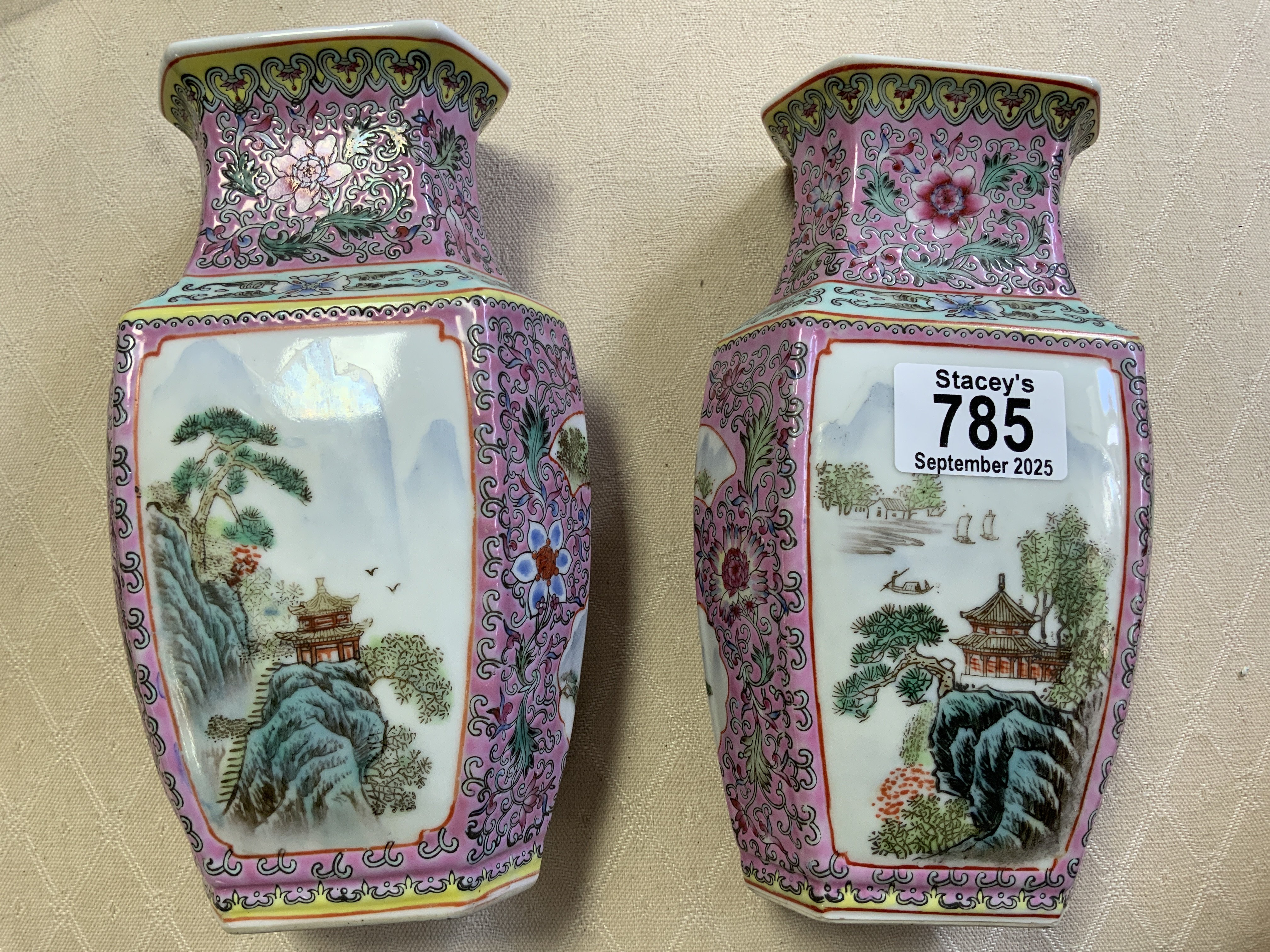 A pair of 20th Century Cantonese porcelain vases with landscape scenes. 20cm.