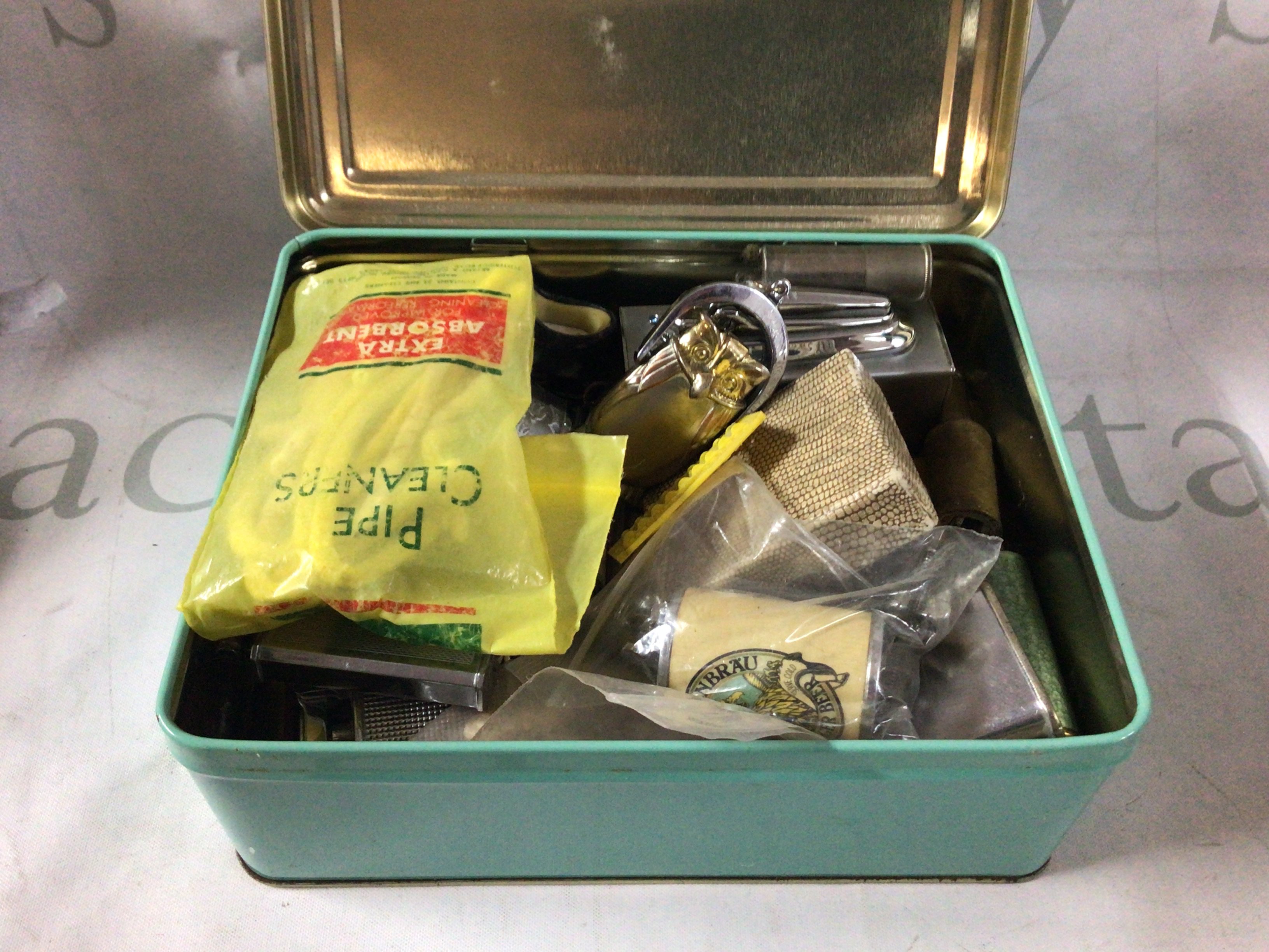 A vintage fortnum and mason tin filled with antique lighters and some accessories.