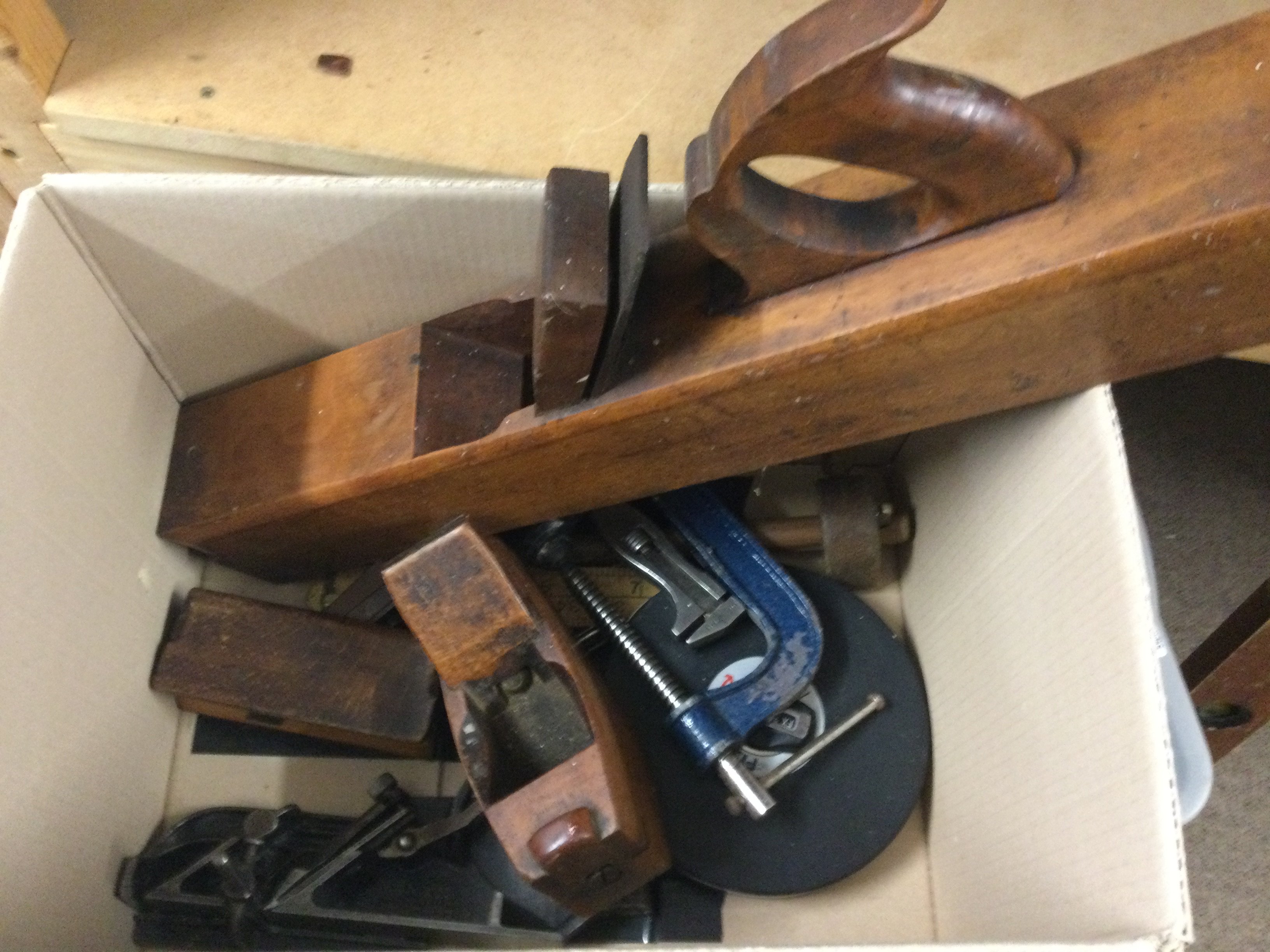 A collection of tools including wooden planes, Stanley steel plane, etc