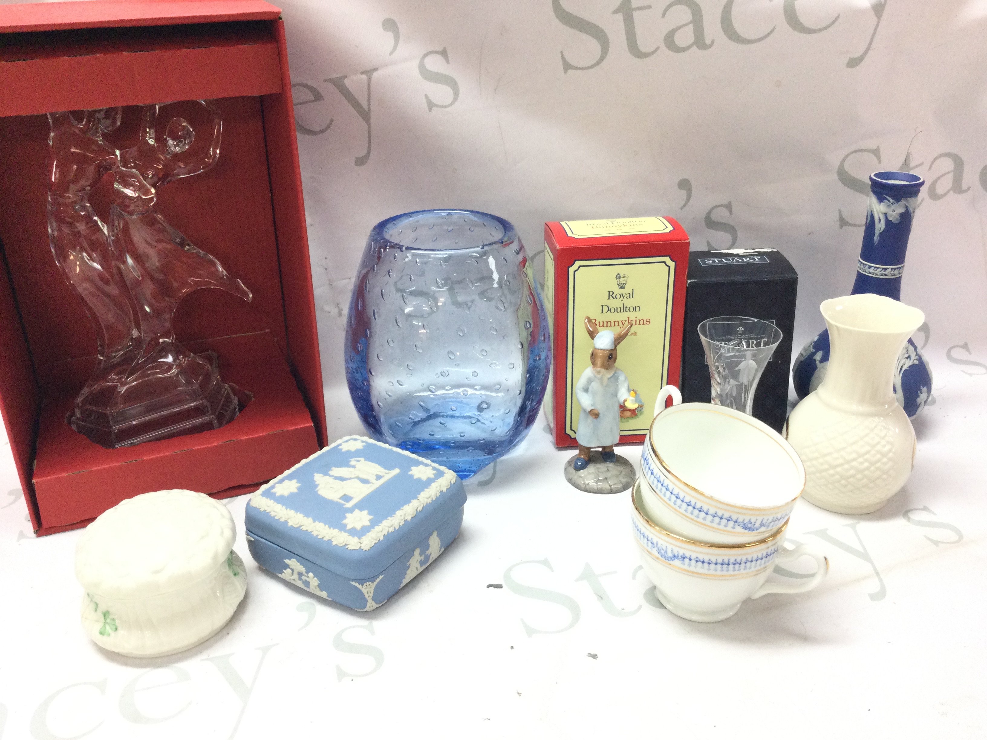A collection of boxed glass including Baleek china, Wedgwood, Three tier cake stand and decorative tea set etc. this lot cannot be posted