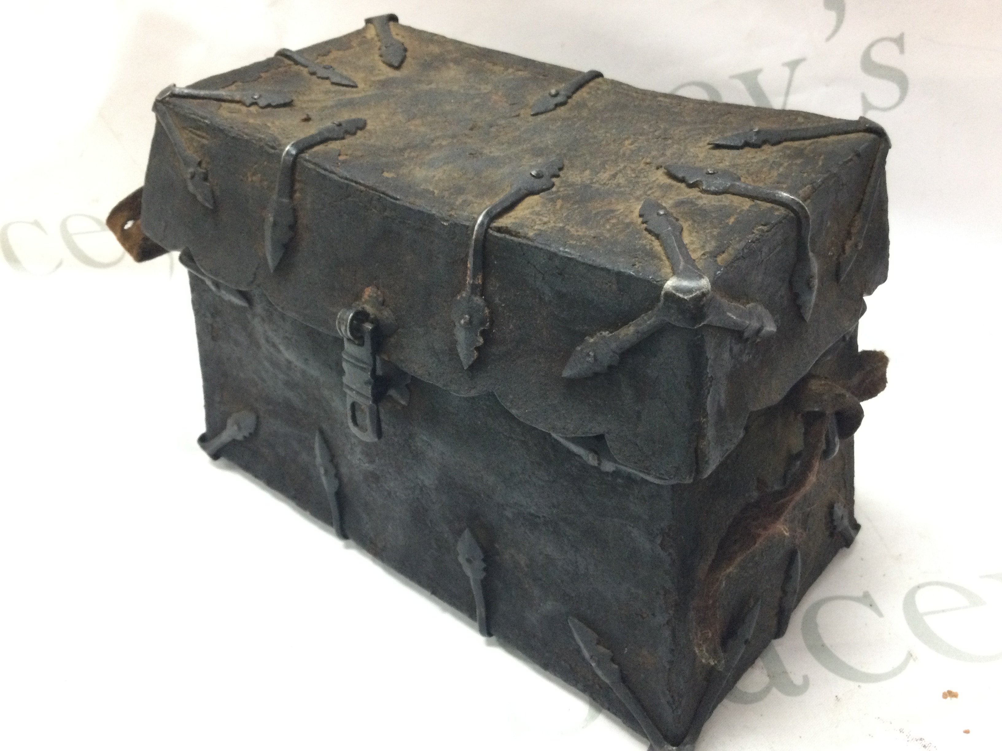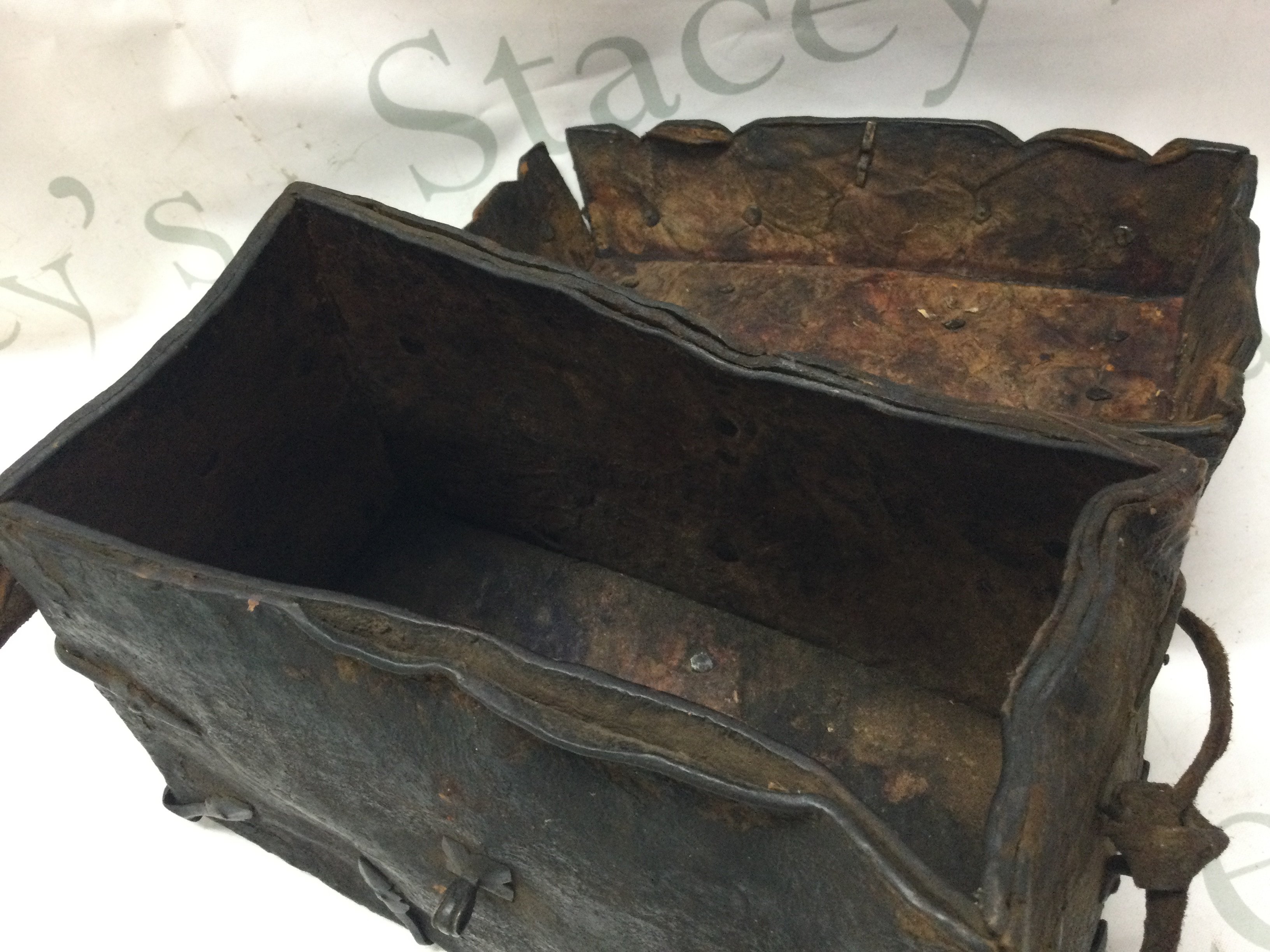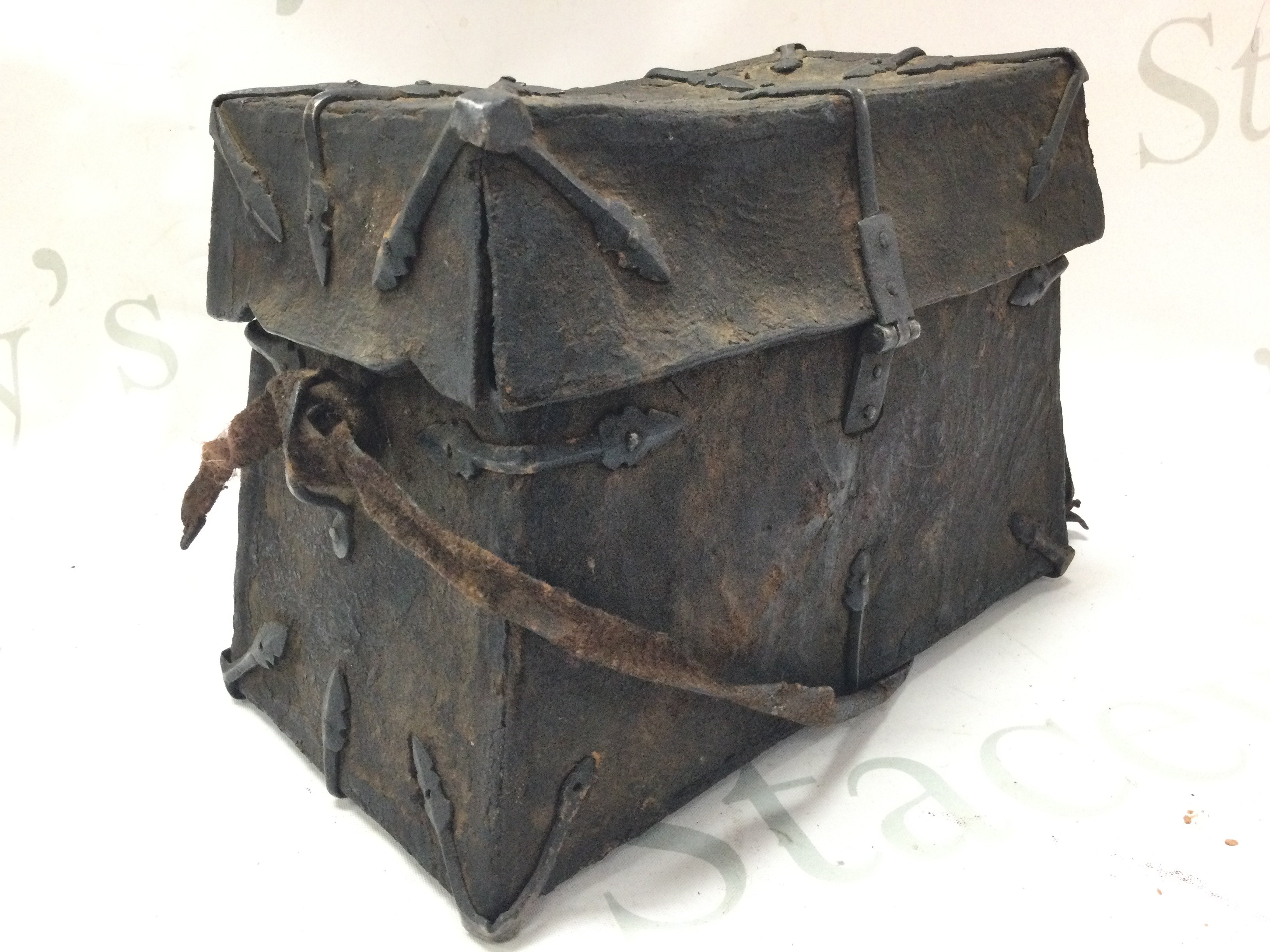 A Tibetan Yak Skin and iron bound saddle box . 17cm tall 25cm wide 13cm long approximately. Postage category C