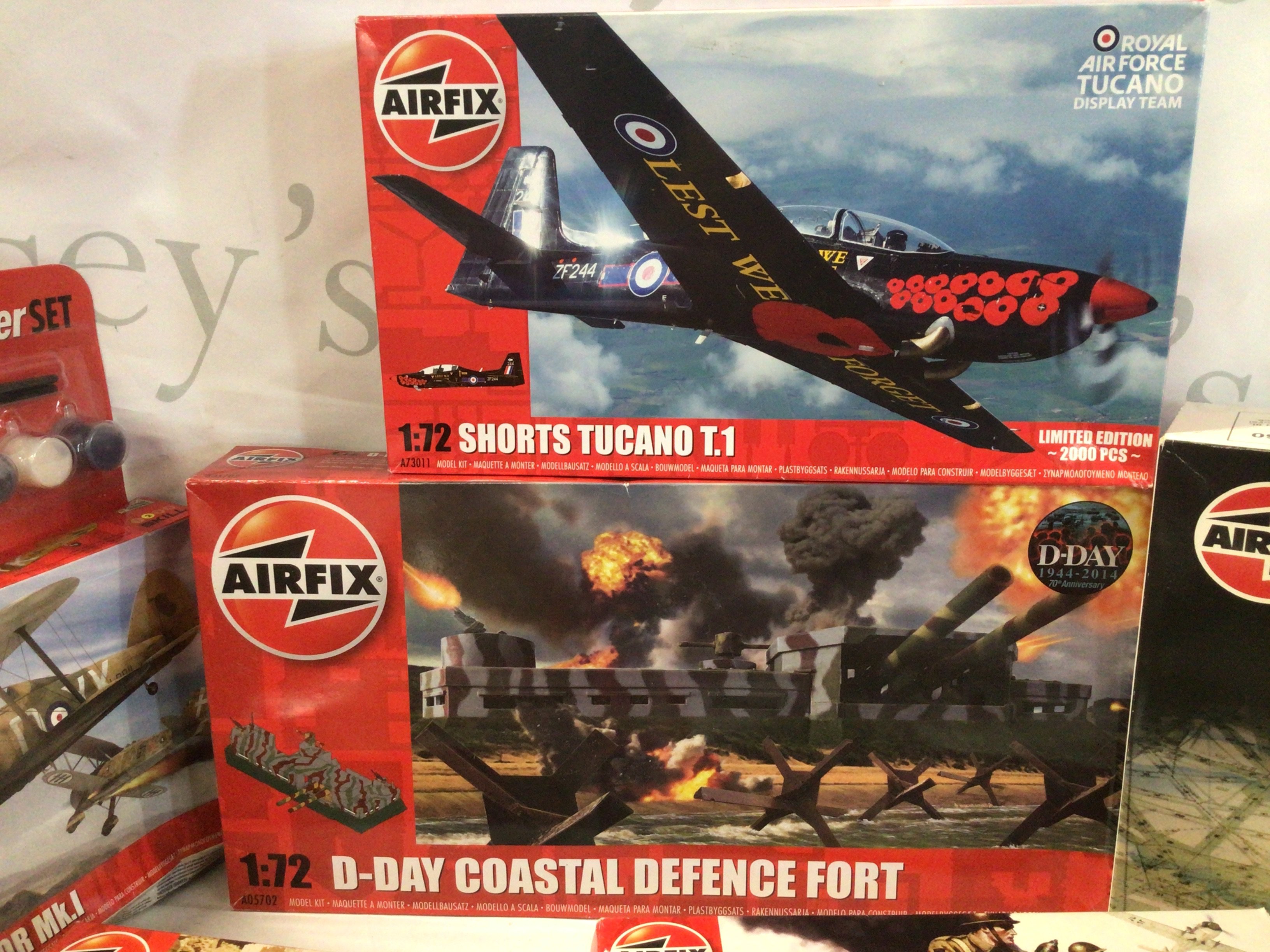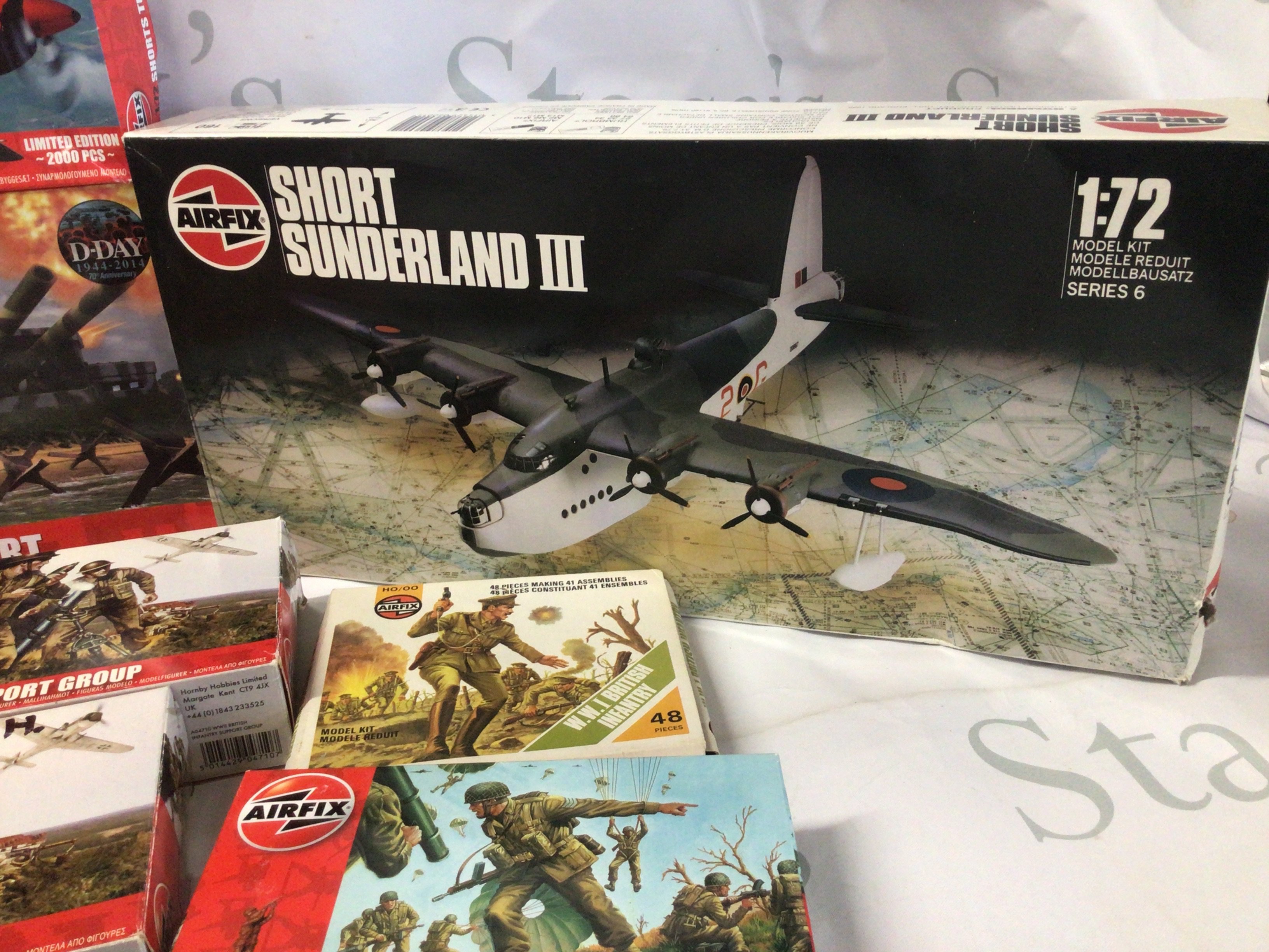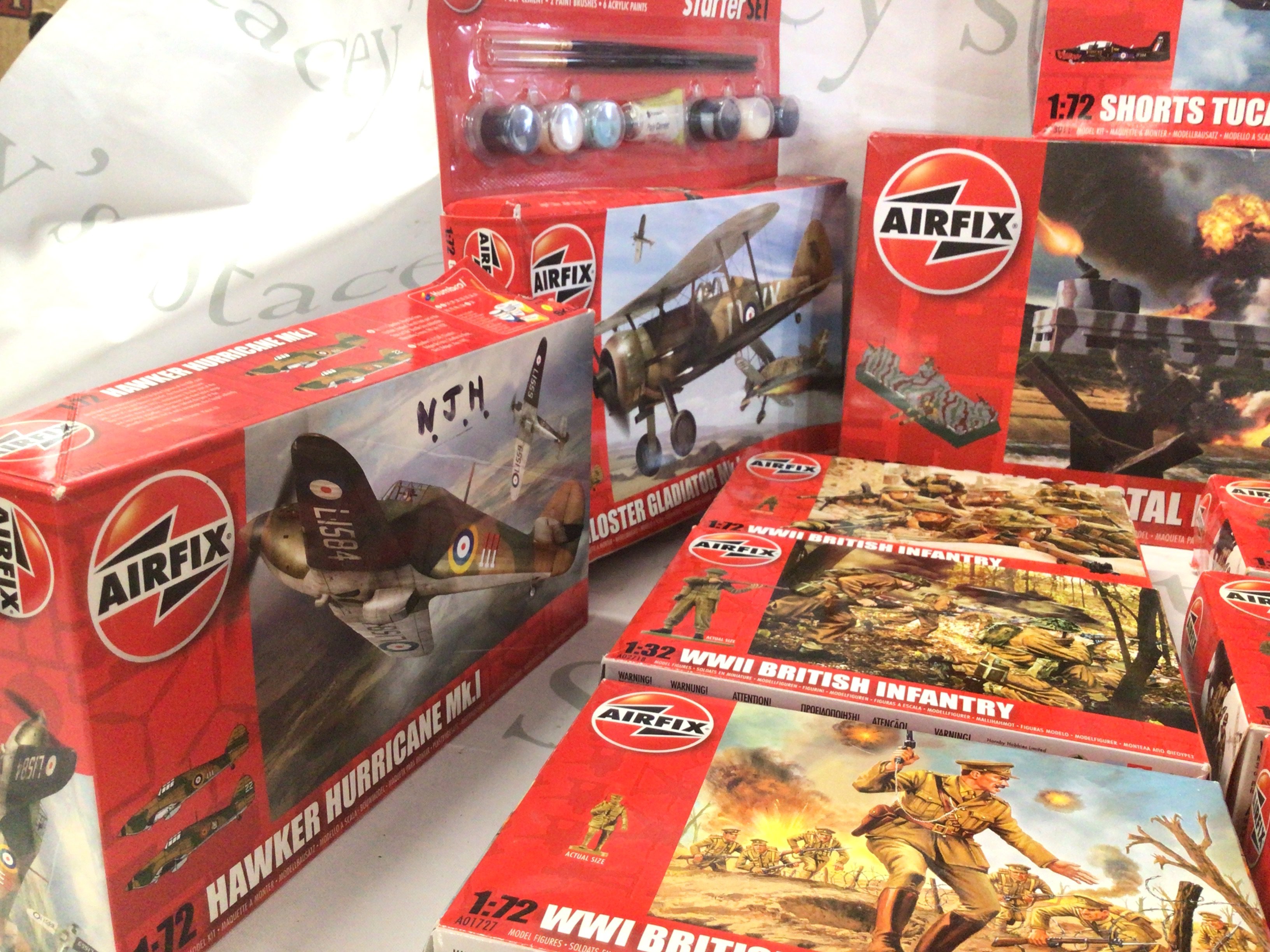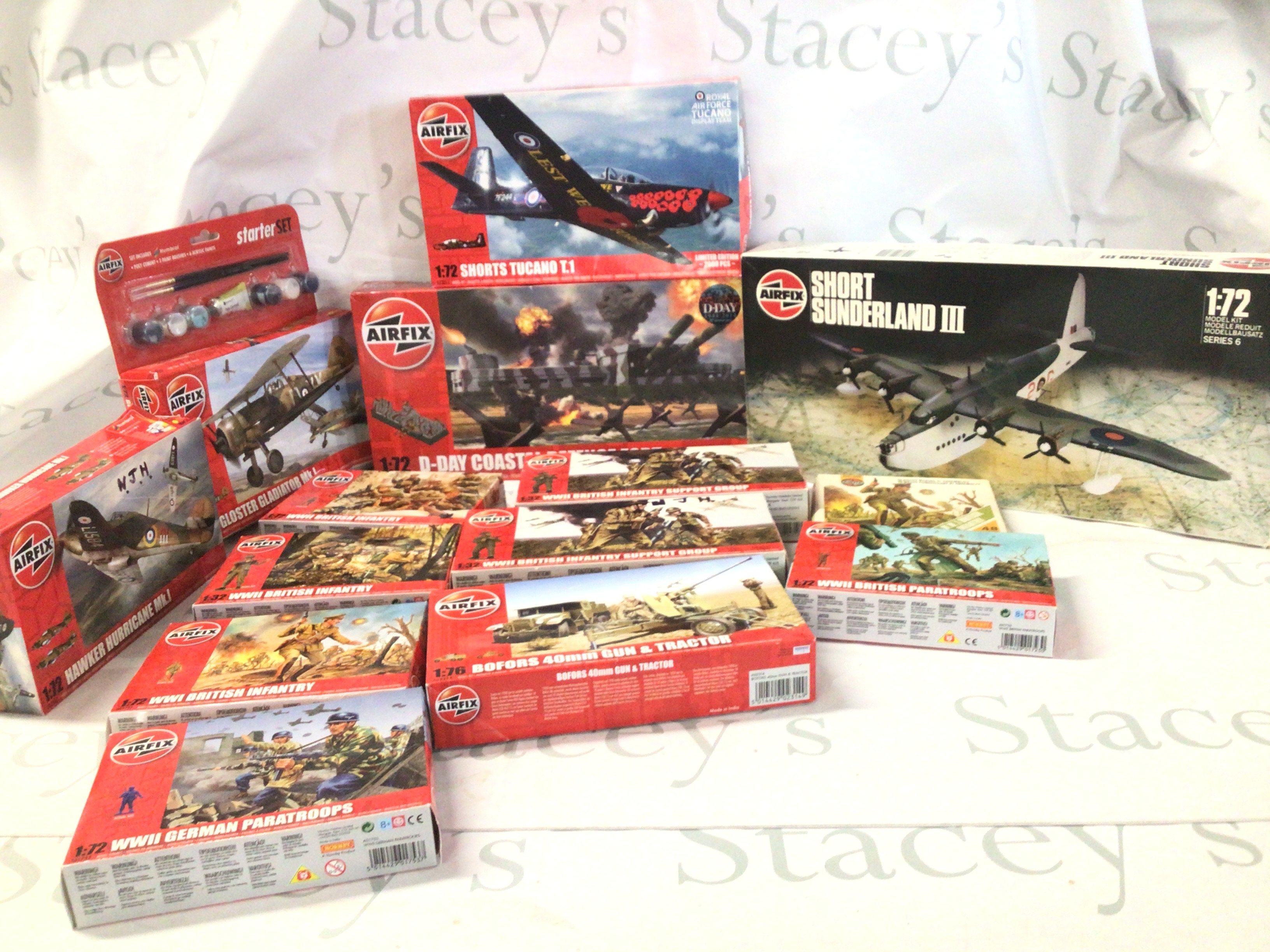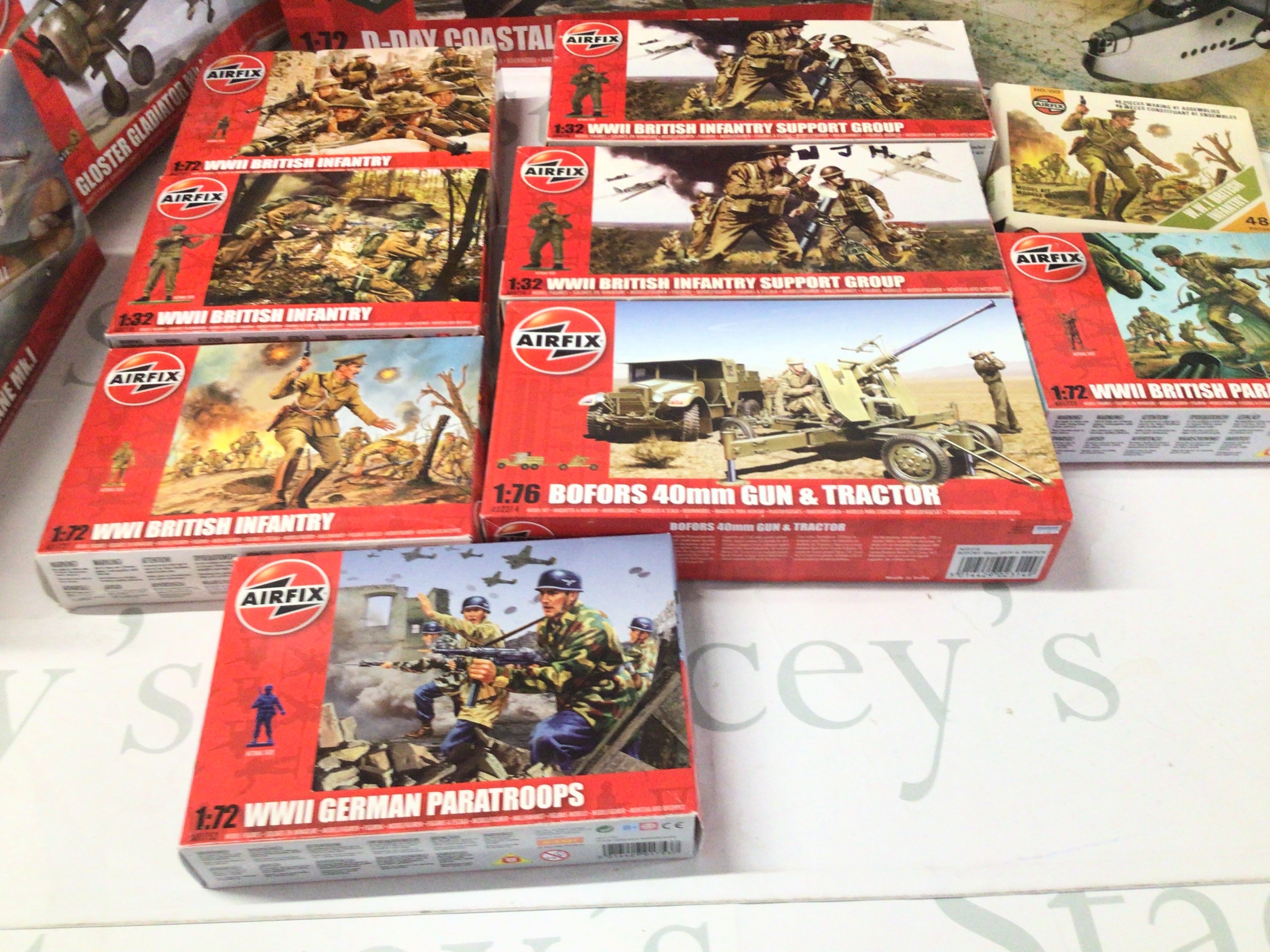 A collection in excess of 12 boxed Airfix kits with military theme. Includes model aircraft ..soldiers both British and German.. plus artillery gun. No reserve