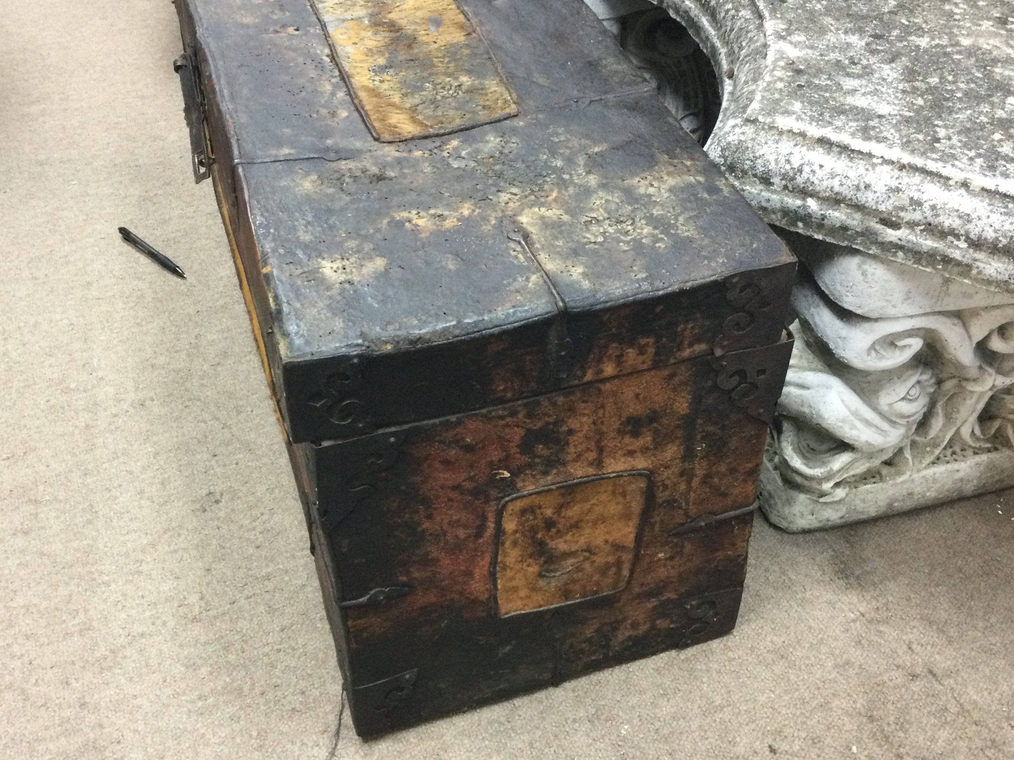 An early 19th century chest banded in leather and tiger skin . Dimensions 35cm long 85cm wide 42Cm tall