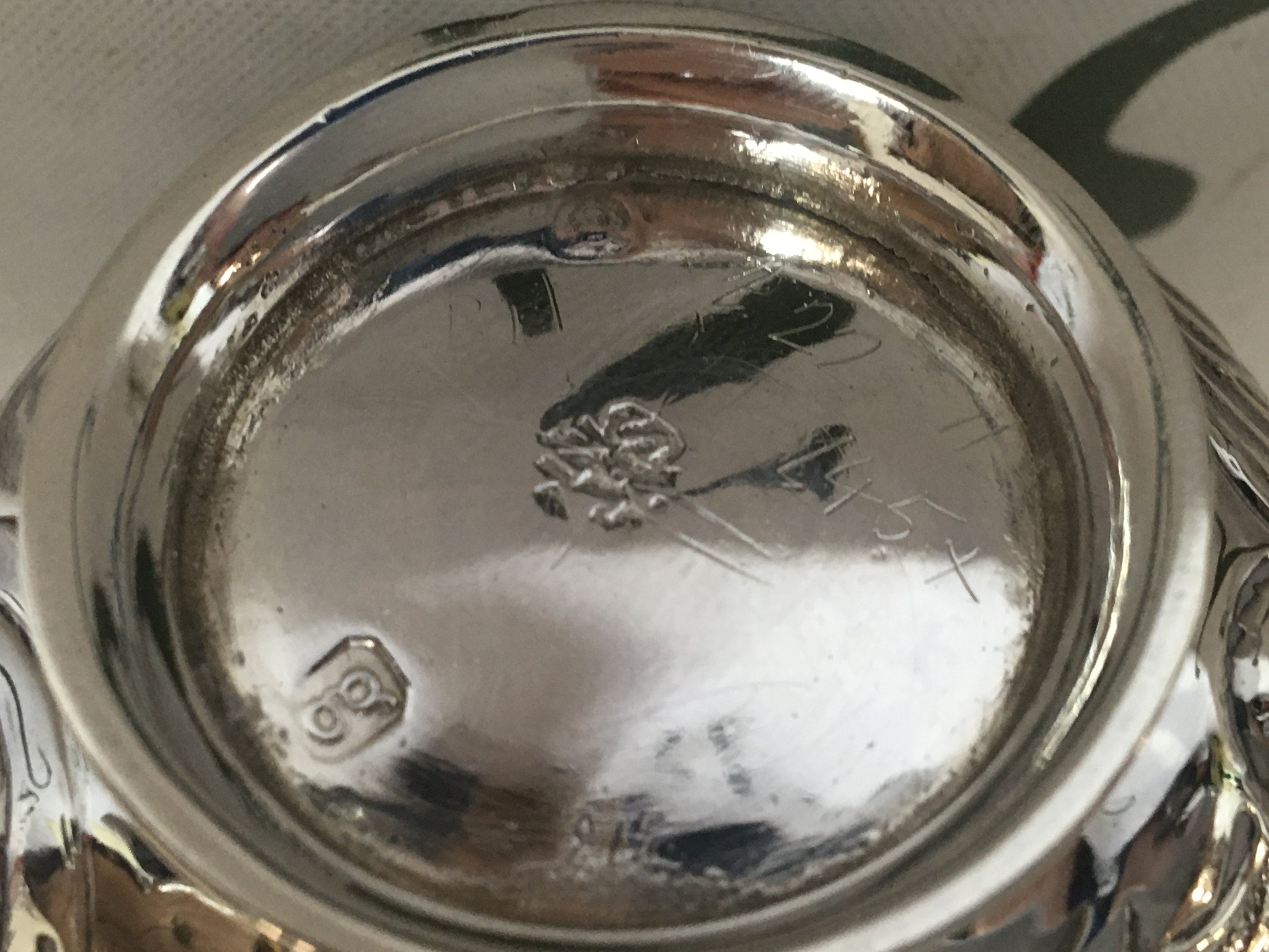 A small silver Porringer and cover with scroll handles repousse chased marks the base height 7cm weight 108g
