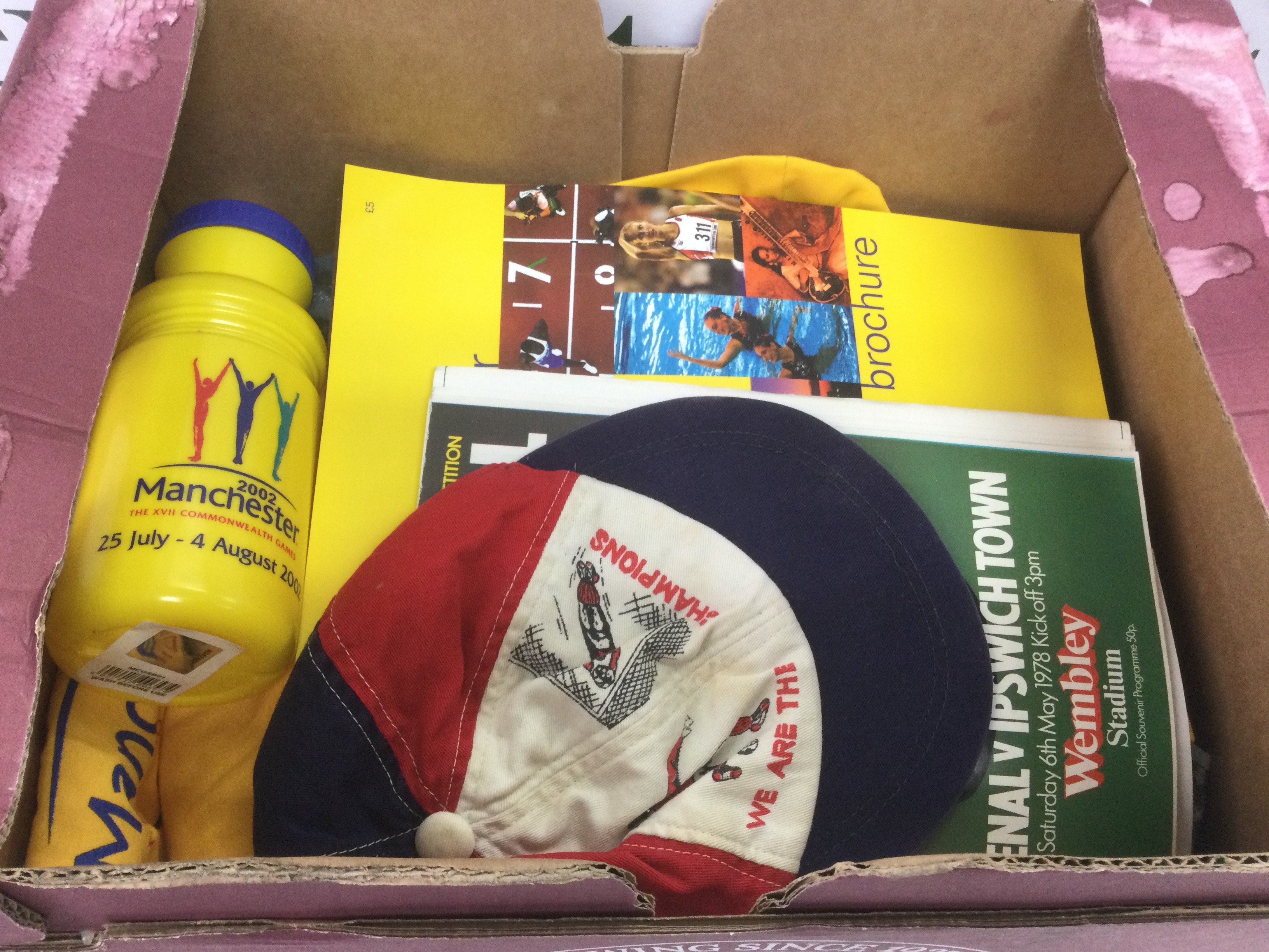 Two boxes of 2012 London Olympics and 2002 Manchester Commonwealth games memorabilia and ceramics. Shipping category D.