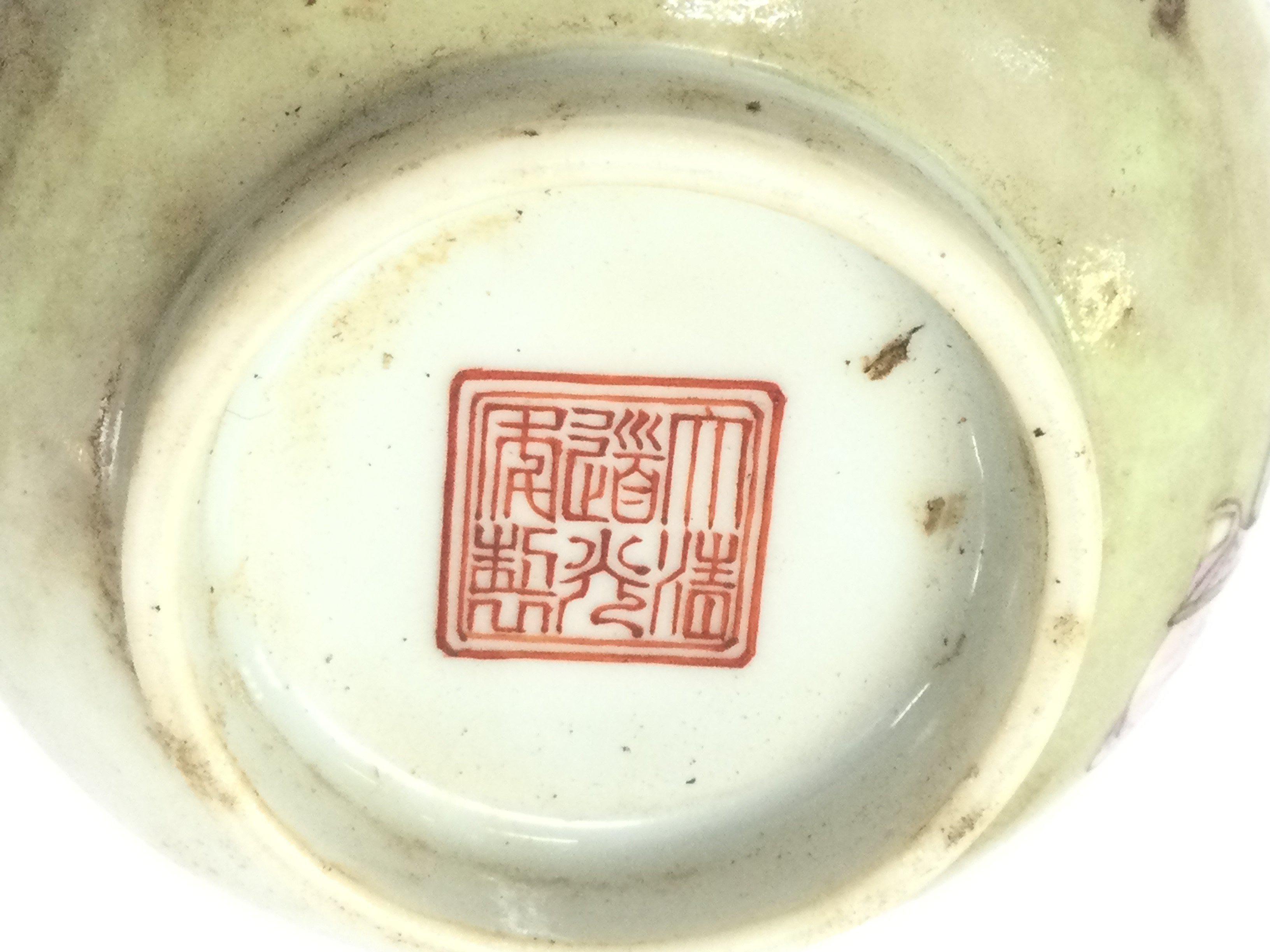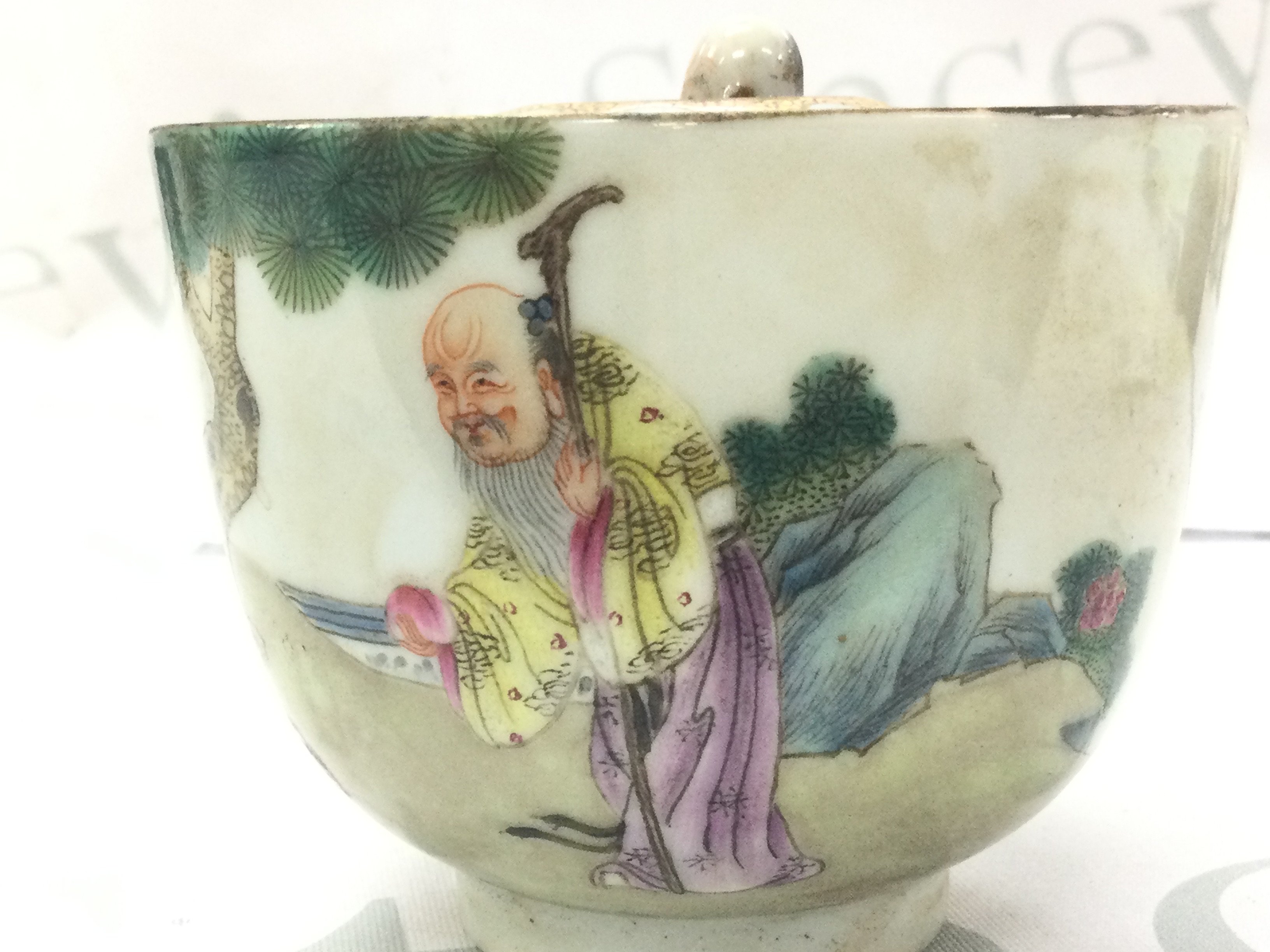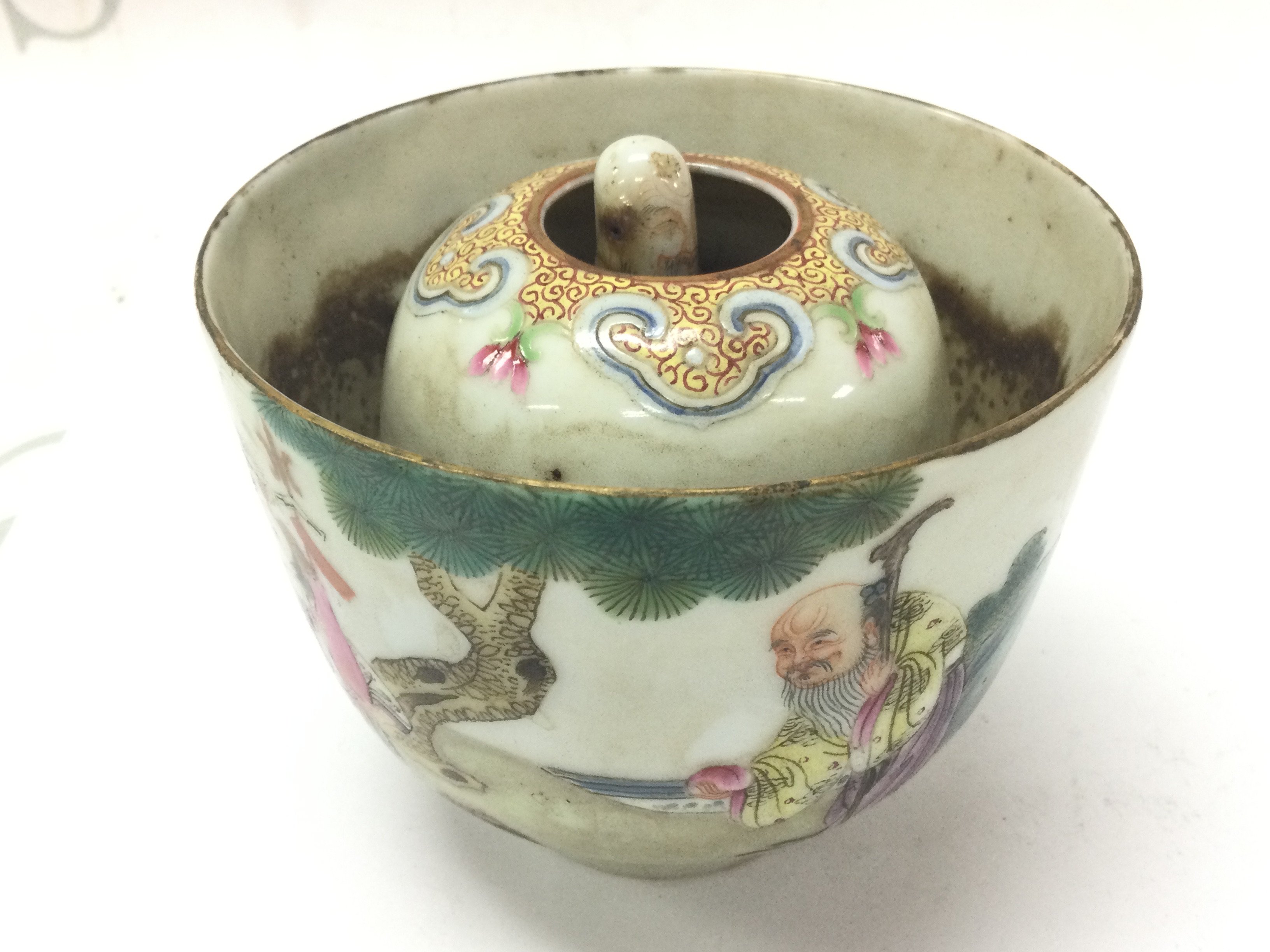 A Chinese Famille Justice cup containing a small figure of the Immortal of Longevity holding a peach stuck inside that rises when water is poured in the cup. Sides of the cup decorated with figures. 6.5cm tall 8cm wide . This lot cannot be posted