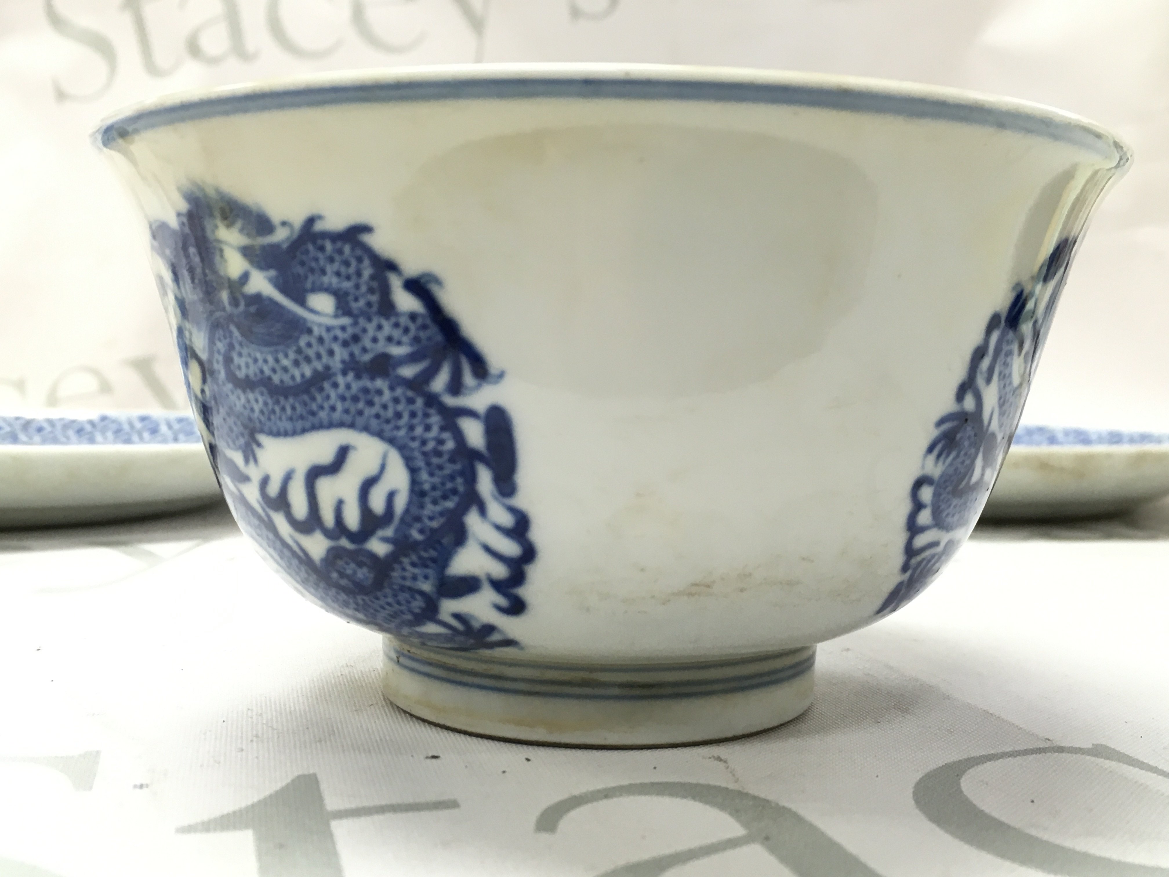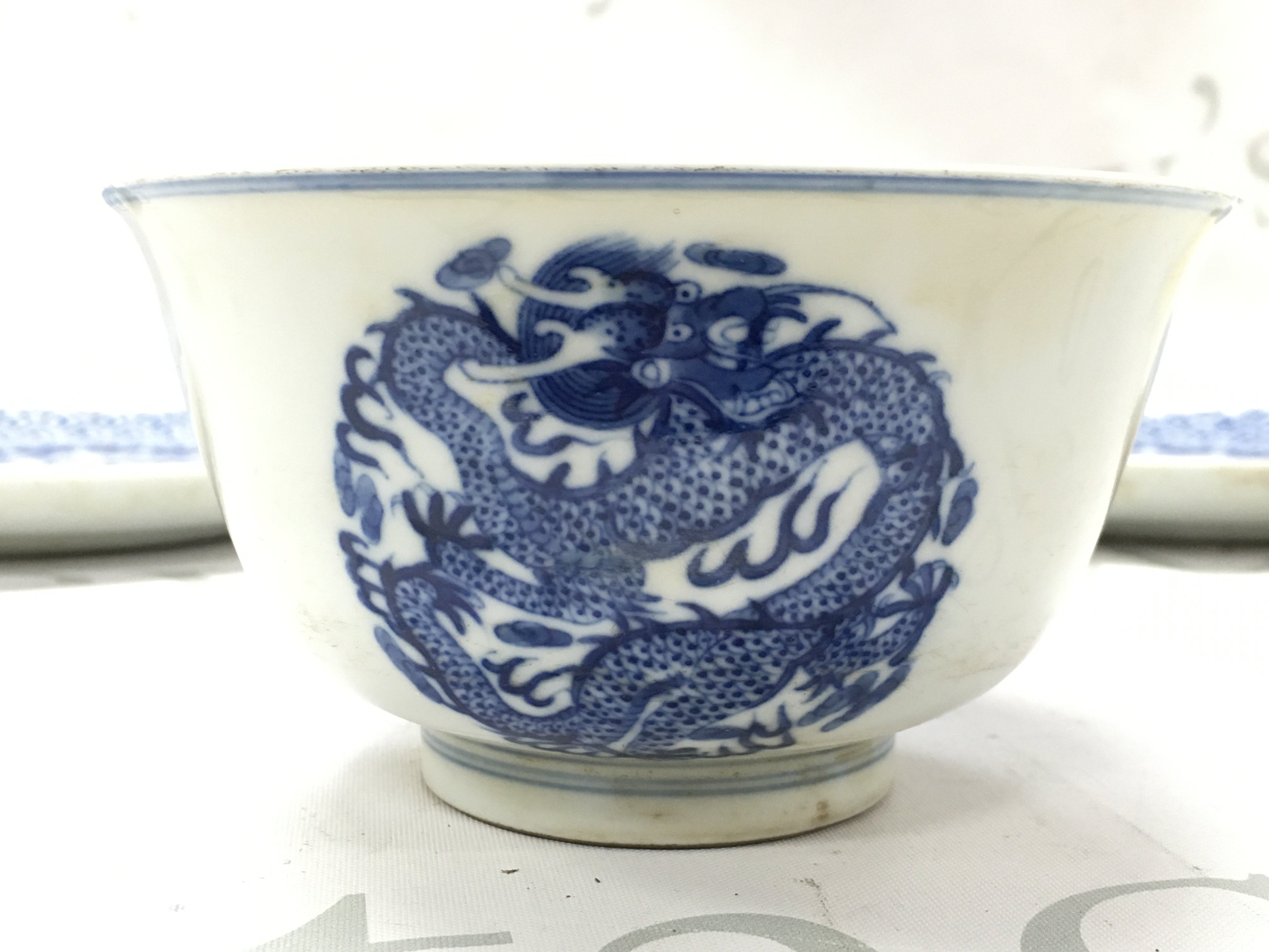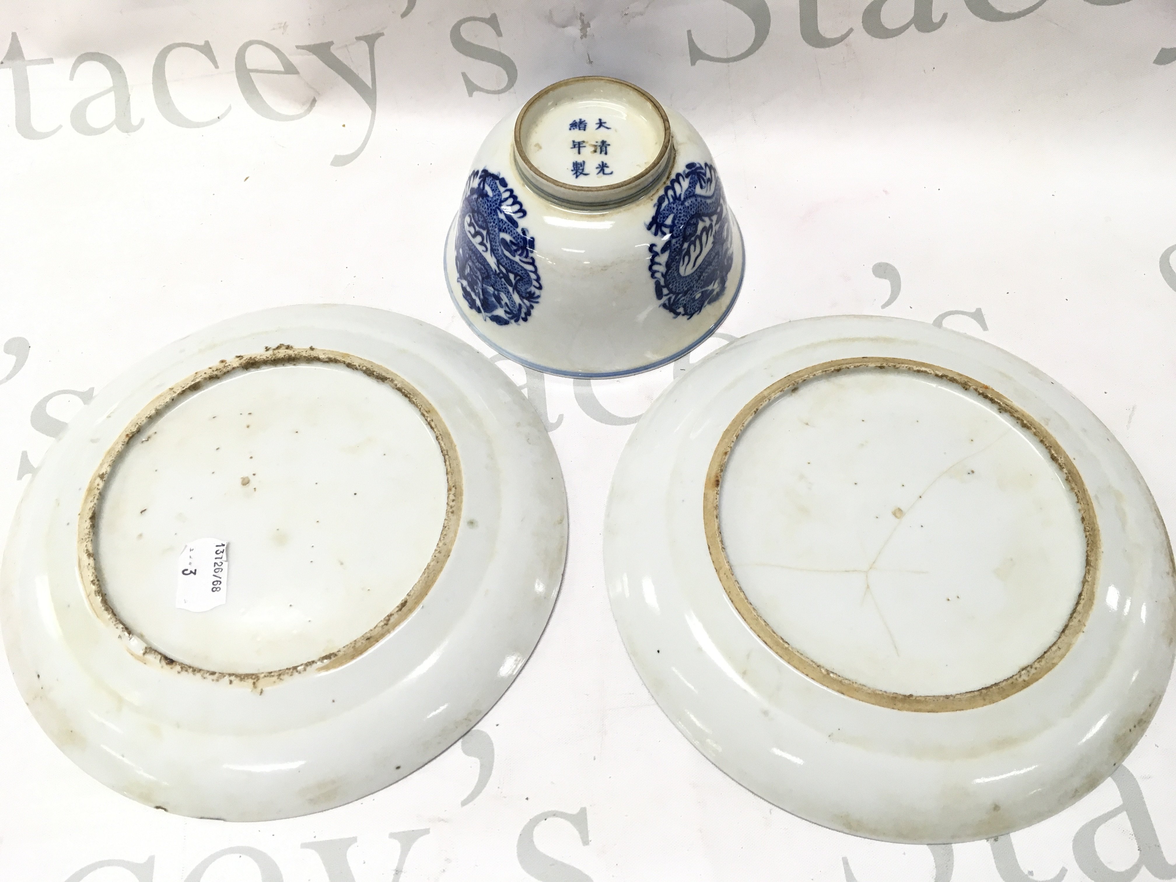 19th century export Chinese blue and white dragon bowl (with six character marks at the base) and two plates (chips and hairline cracks seen) . This lot cannot be posted