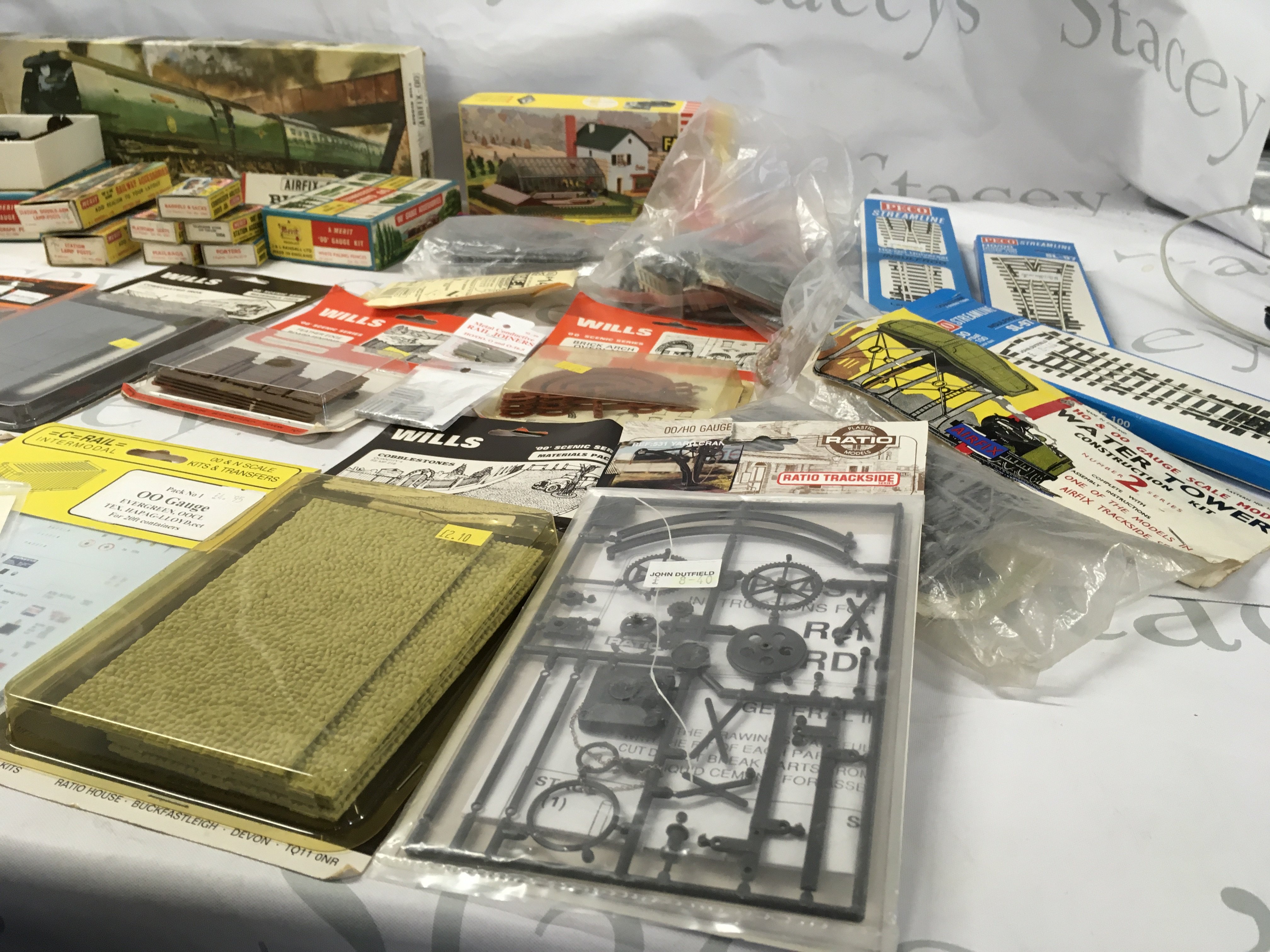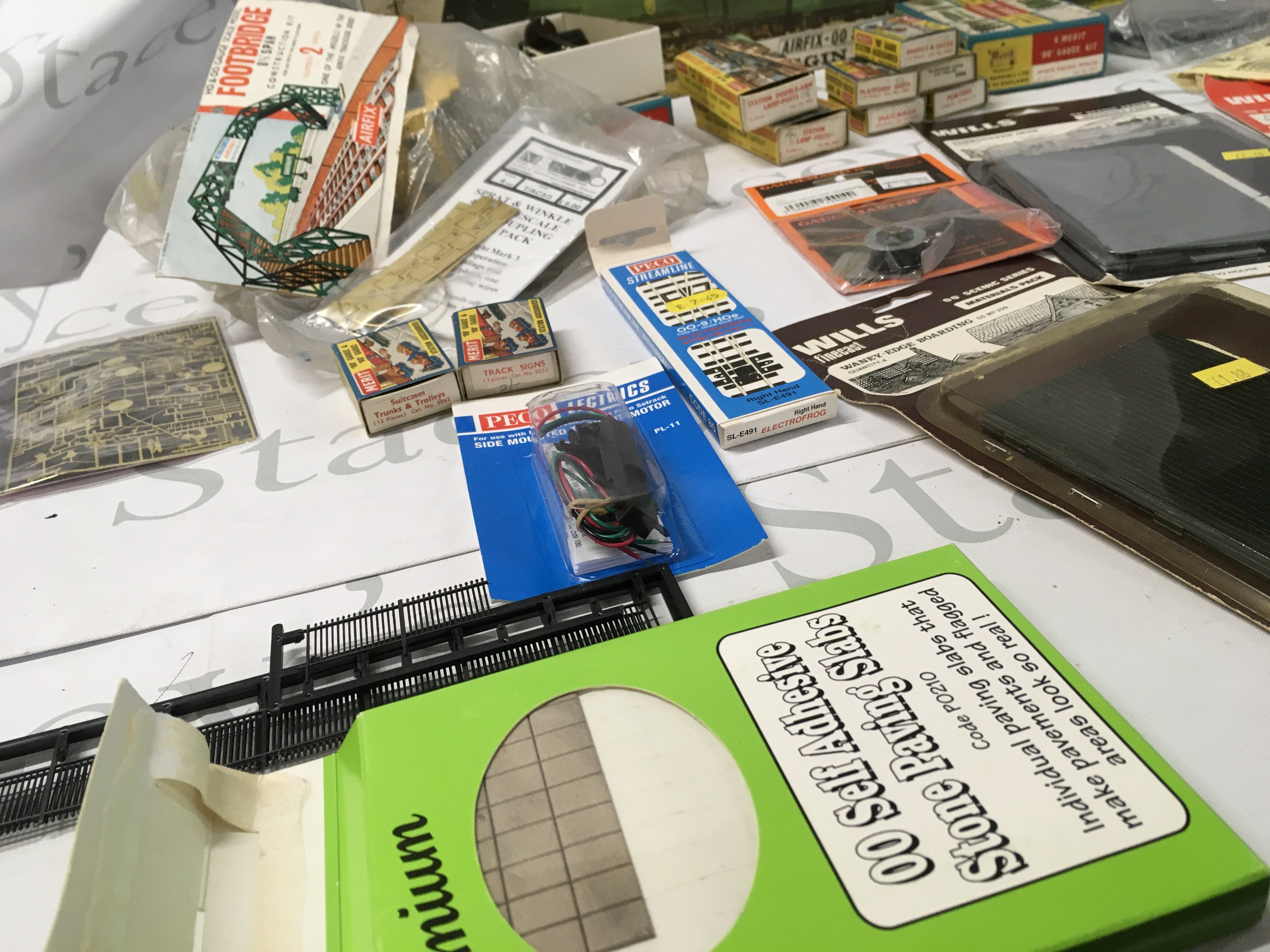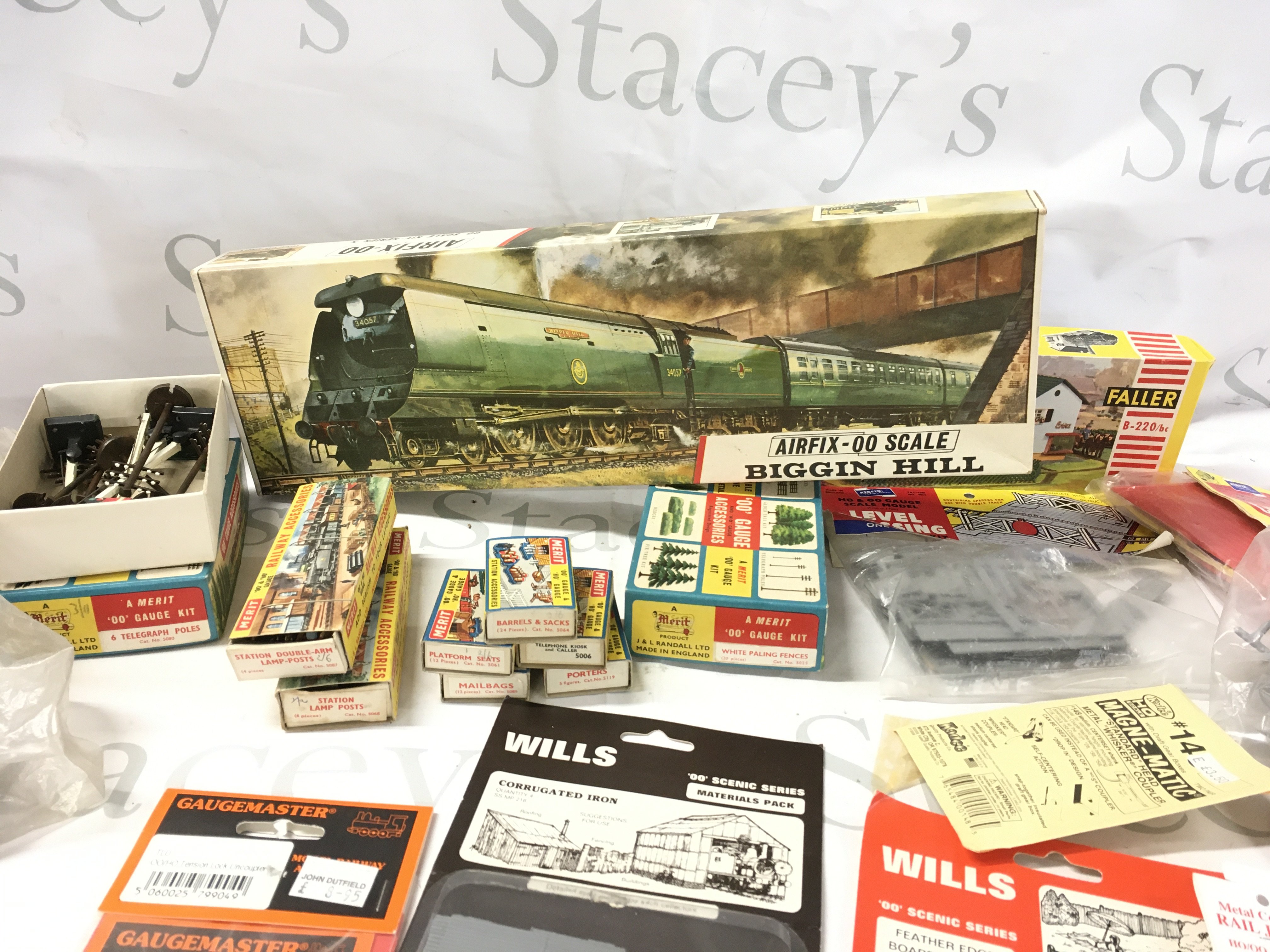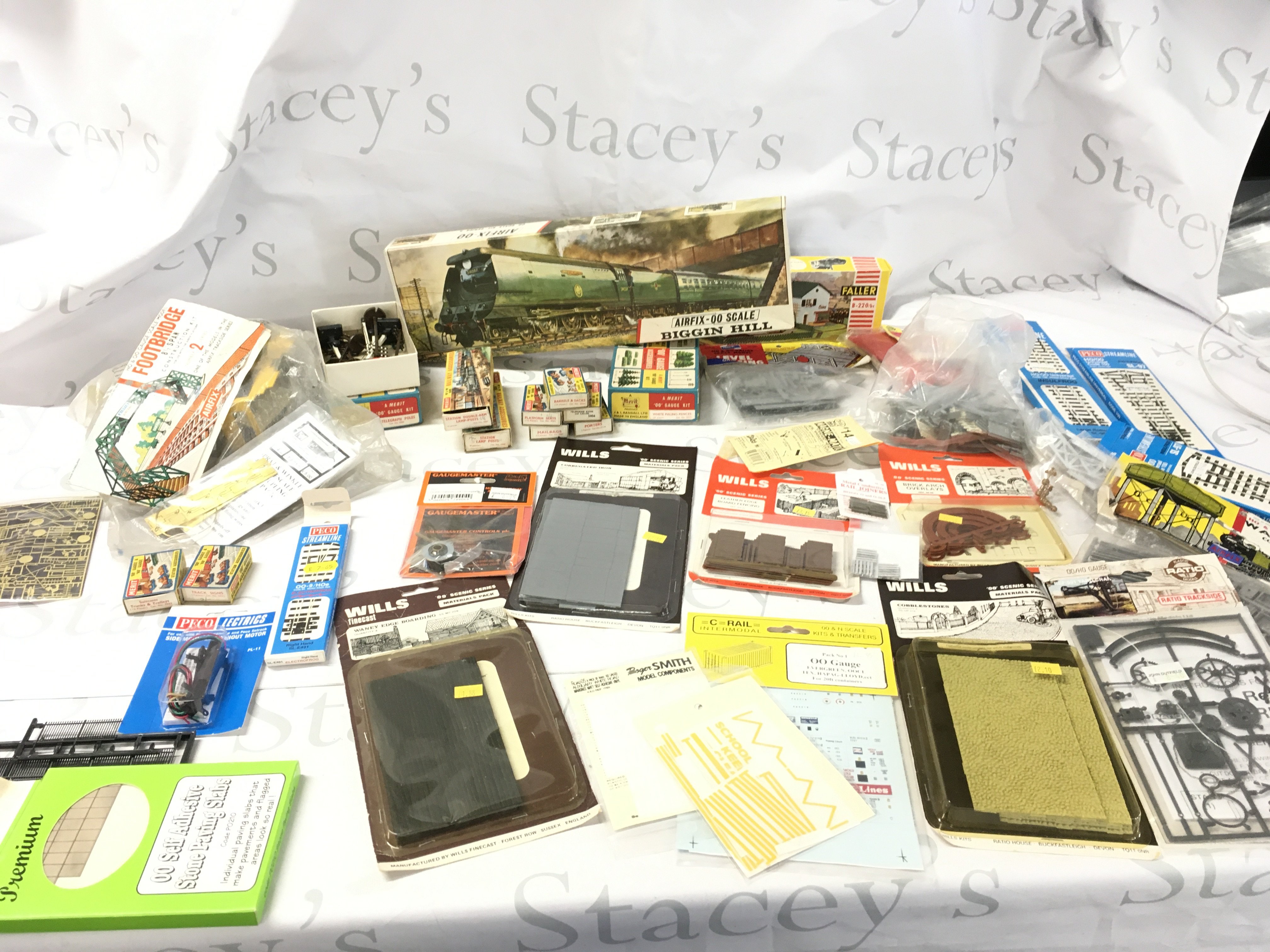 A mixed selection of 00 gauge minature railway accessories mostly sealed by various manufacturers . Comprises scenery..buildings..track etc. Also includes an unstarted Airfix kit model locomotive Biggin Hill. No reserve