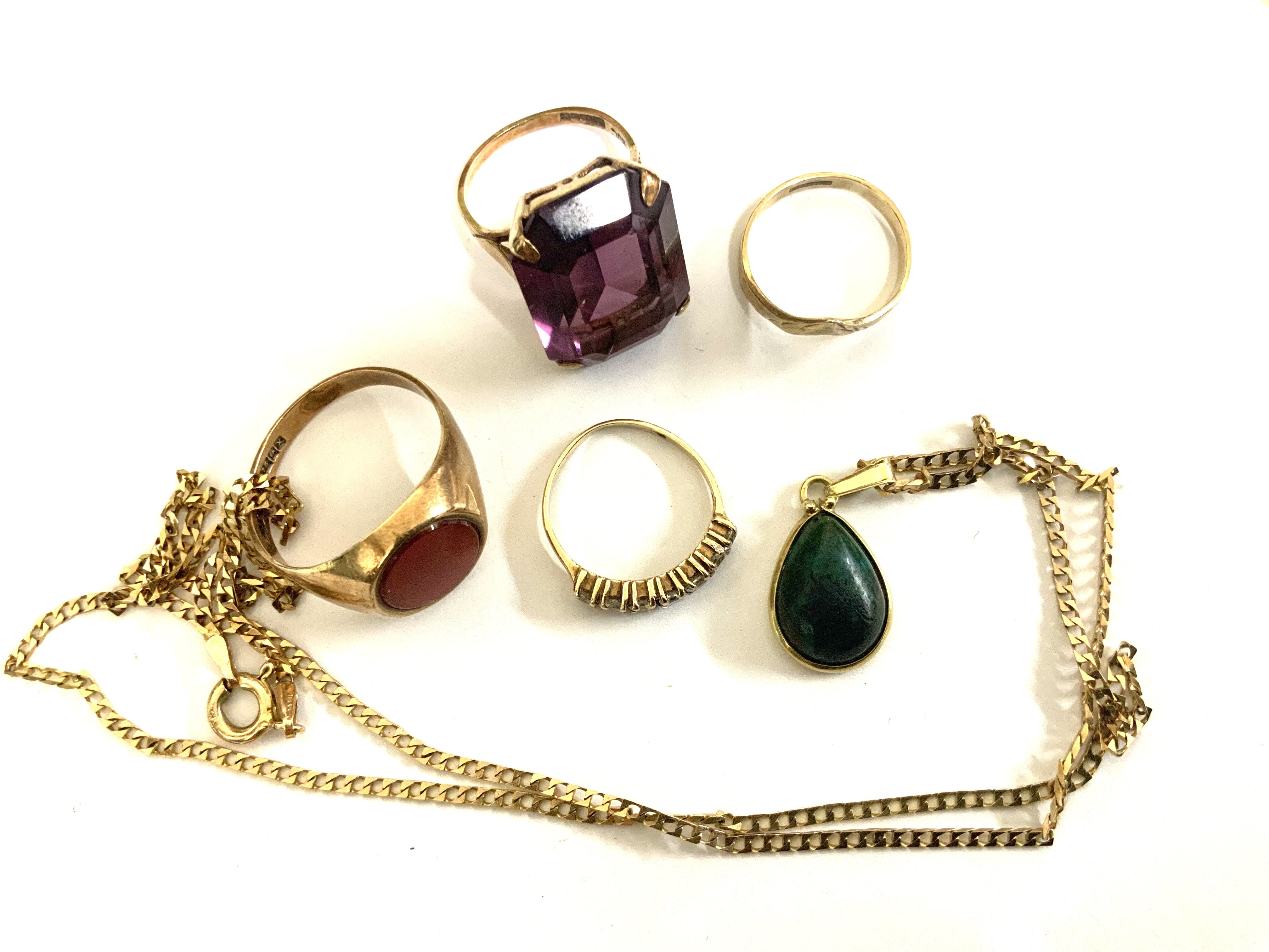 Mixed lot of gold jewellery to include. Amethyst dress ring, chain and stone set pendant, agate signet ring, wishbone ring, small half eternity ring. (A)