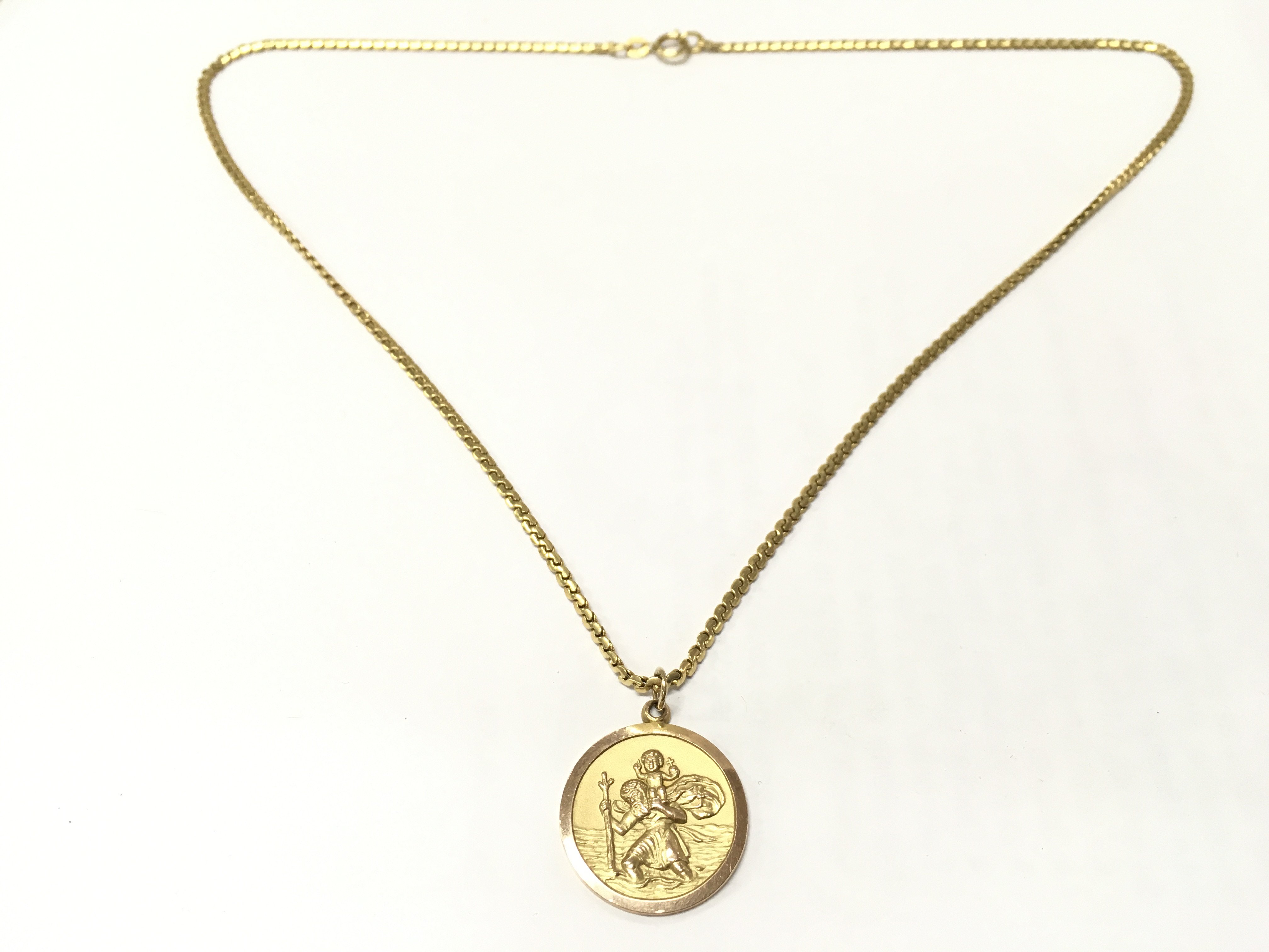 An 18ct gold closed link necklace with a 9ct gold St Christopher pendant, total weight 20.2g. postage category A