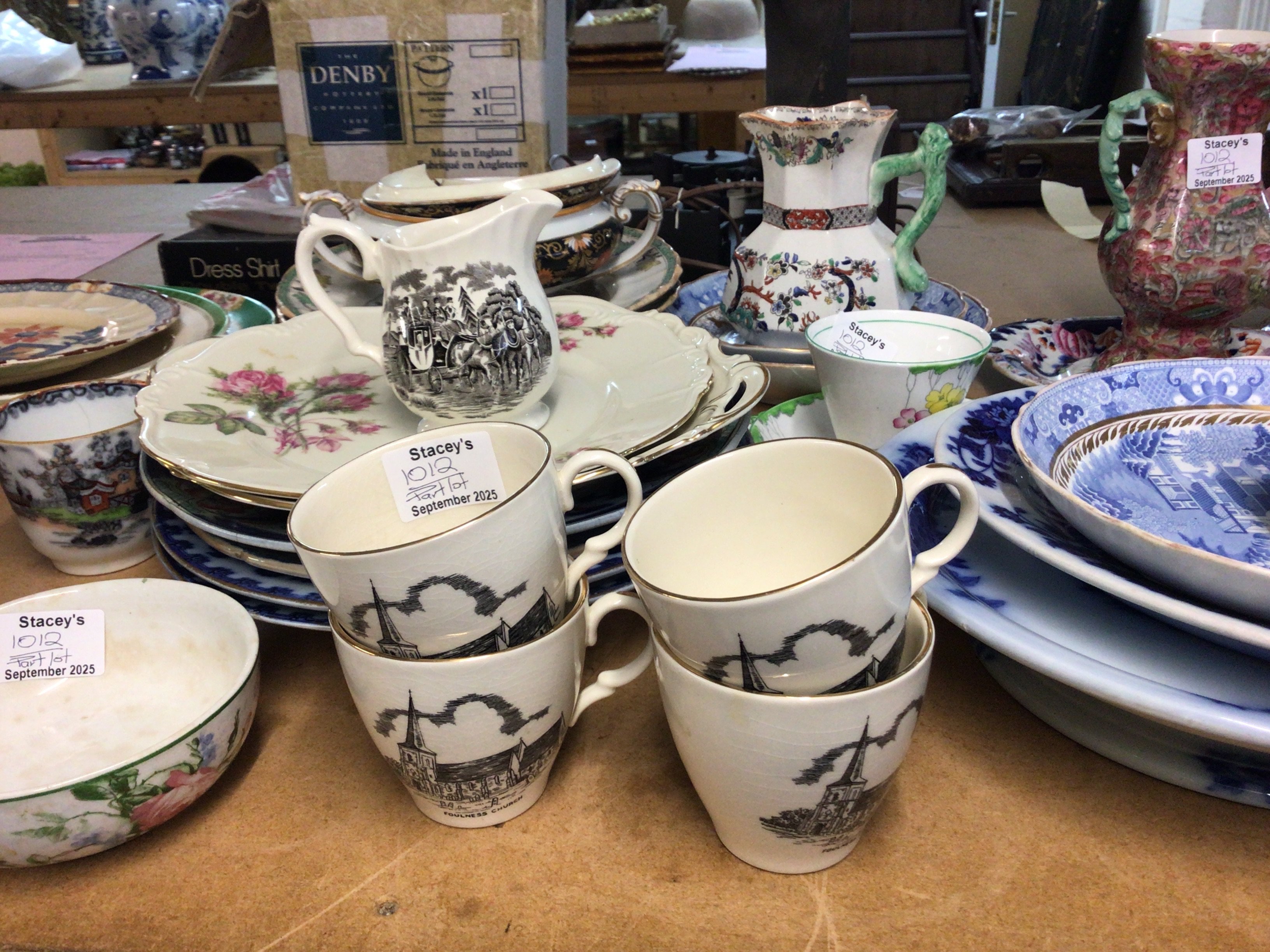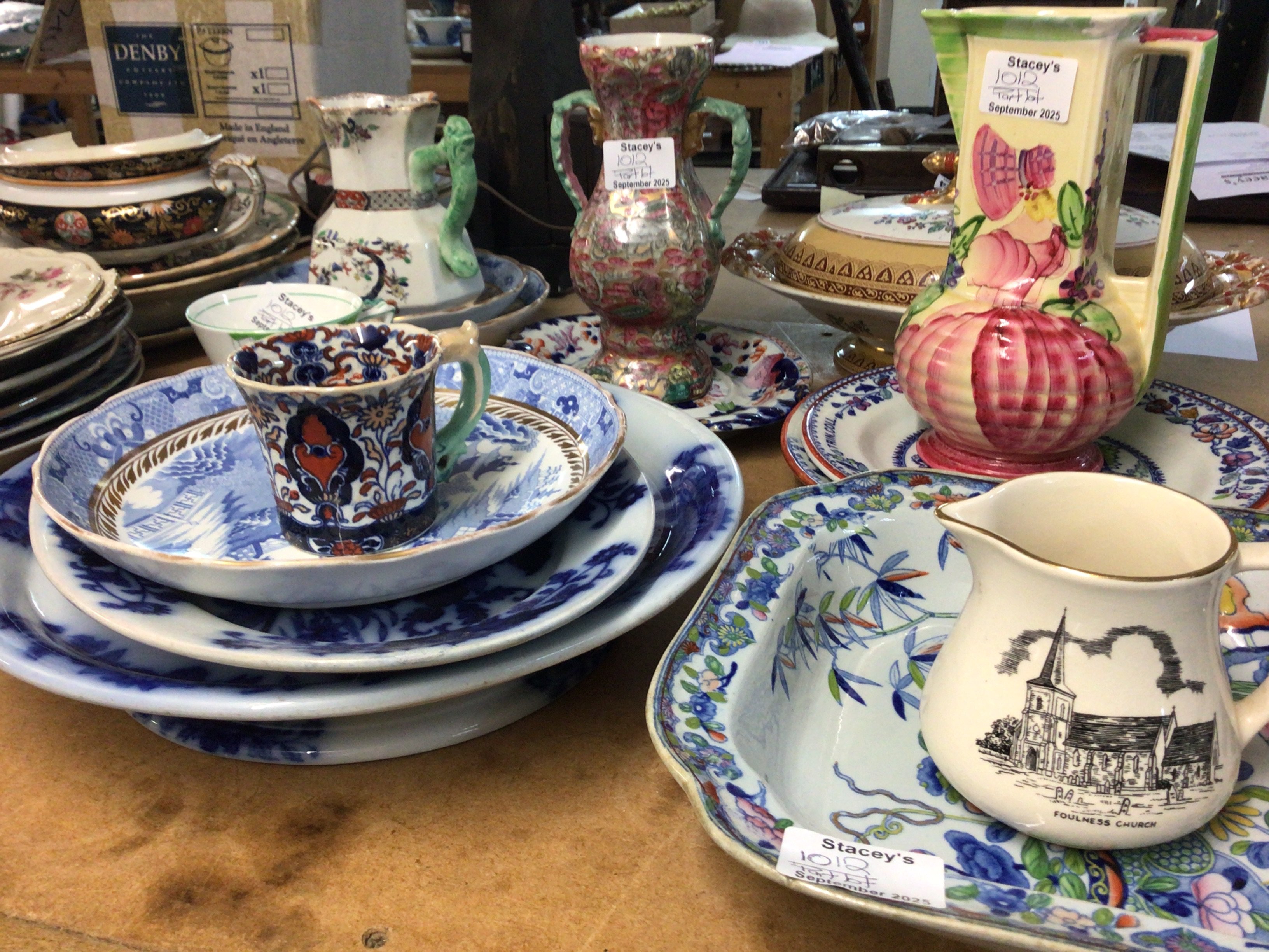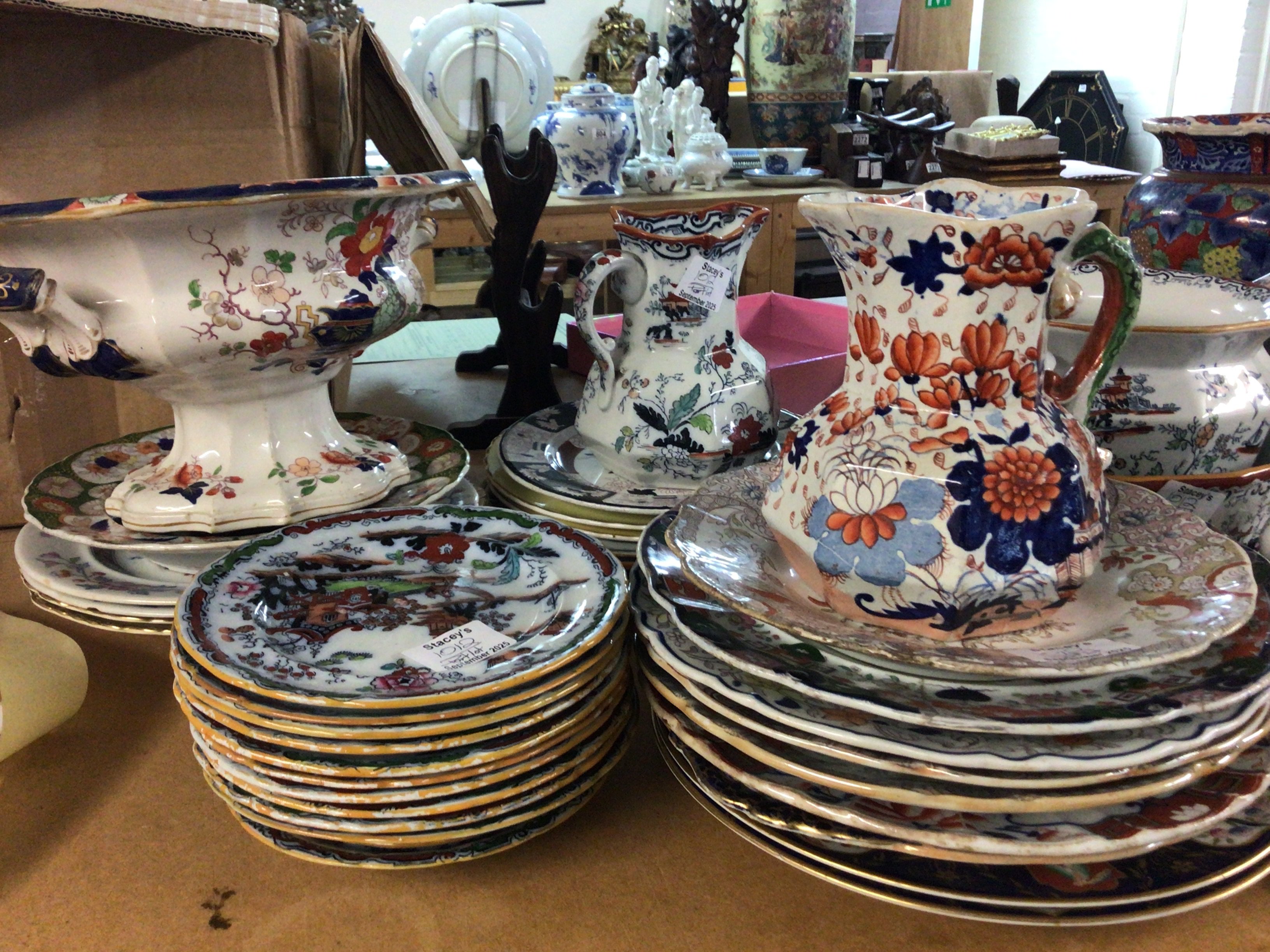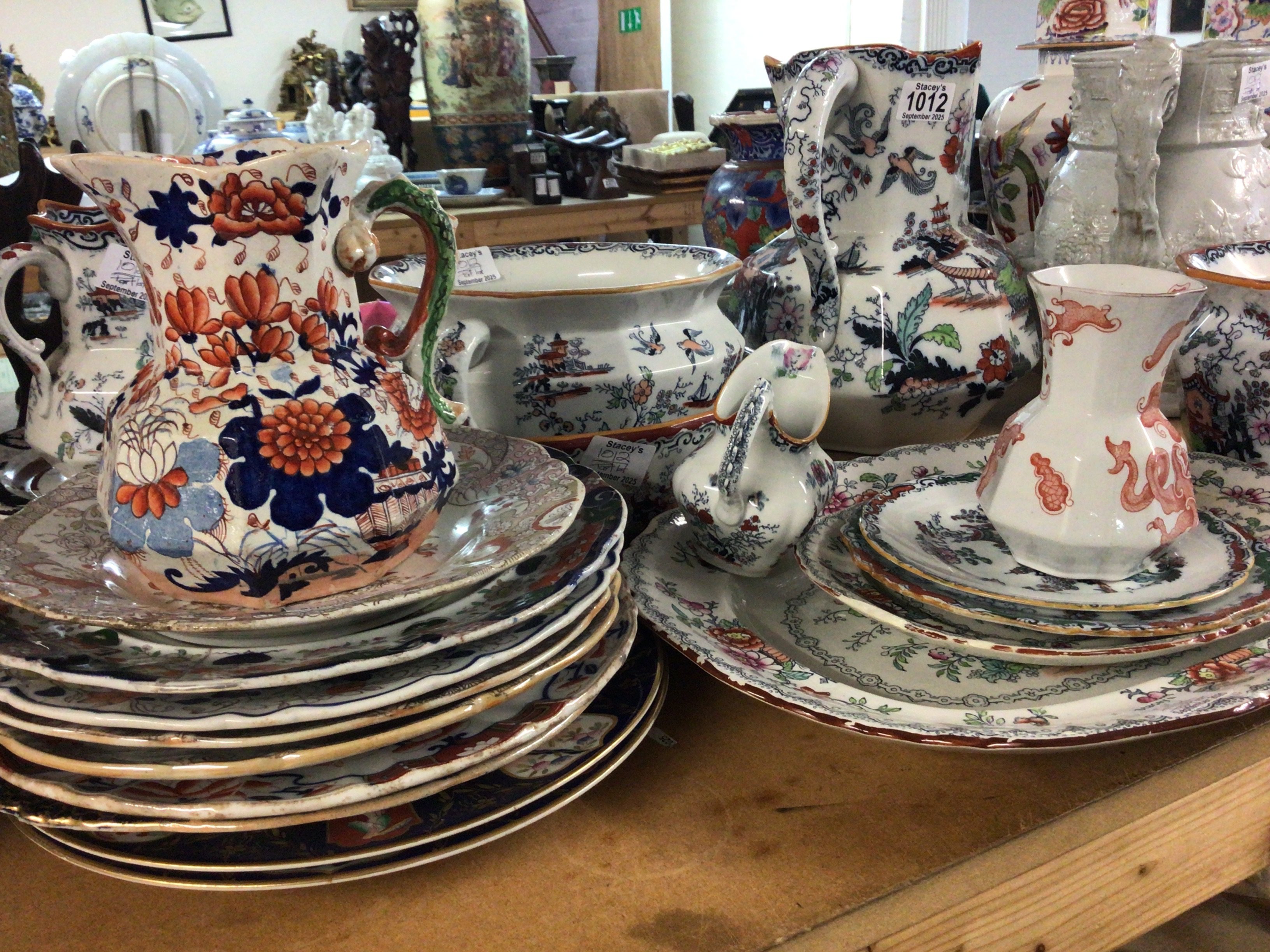 A large collection of Victorian and later Ironstone china including a Masons hunting jug with raised relief plates vases jugs chamber pots. No Reserve.
