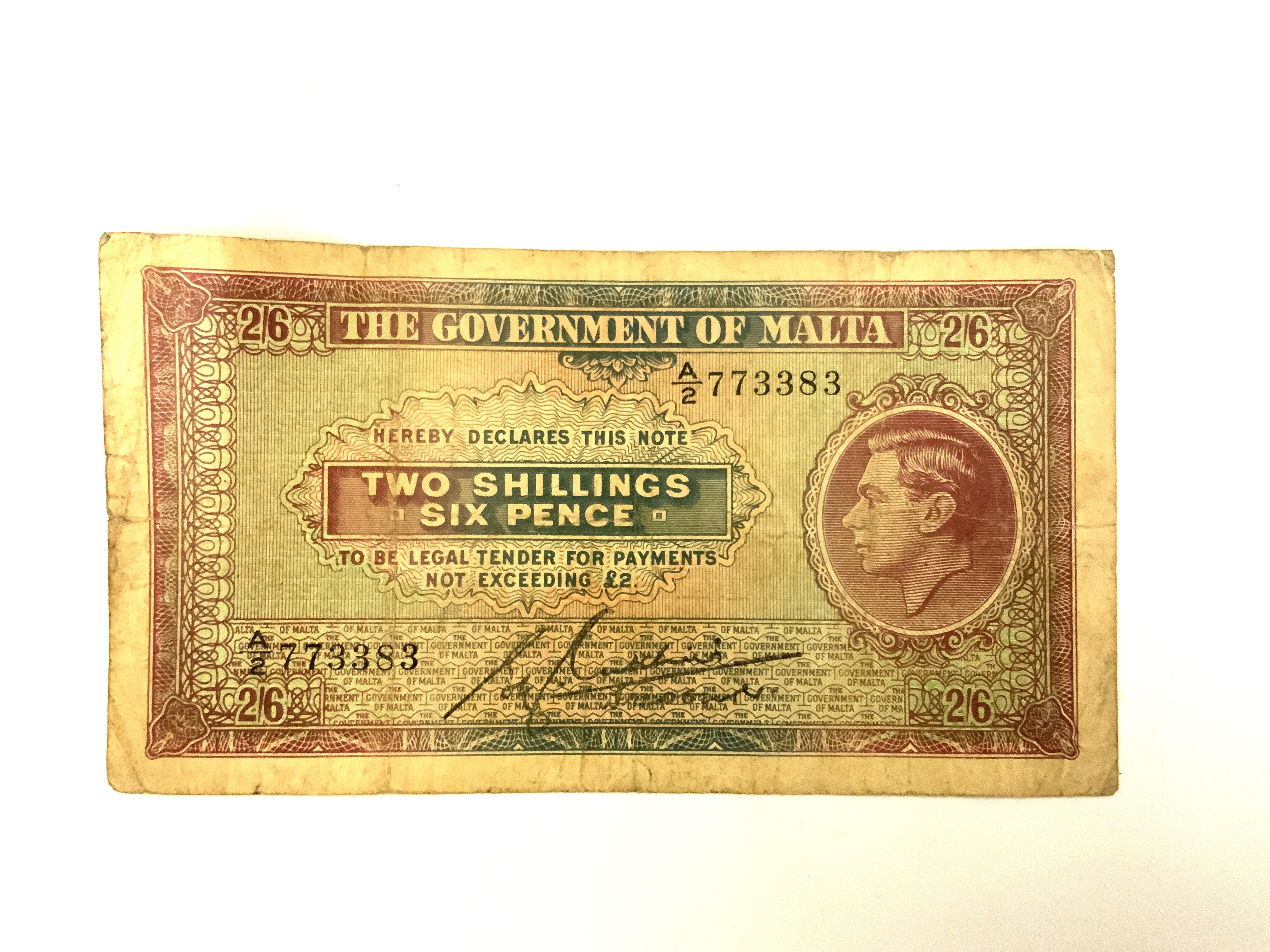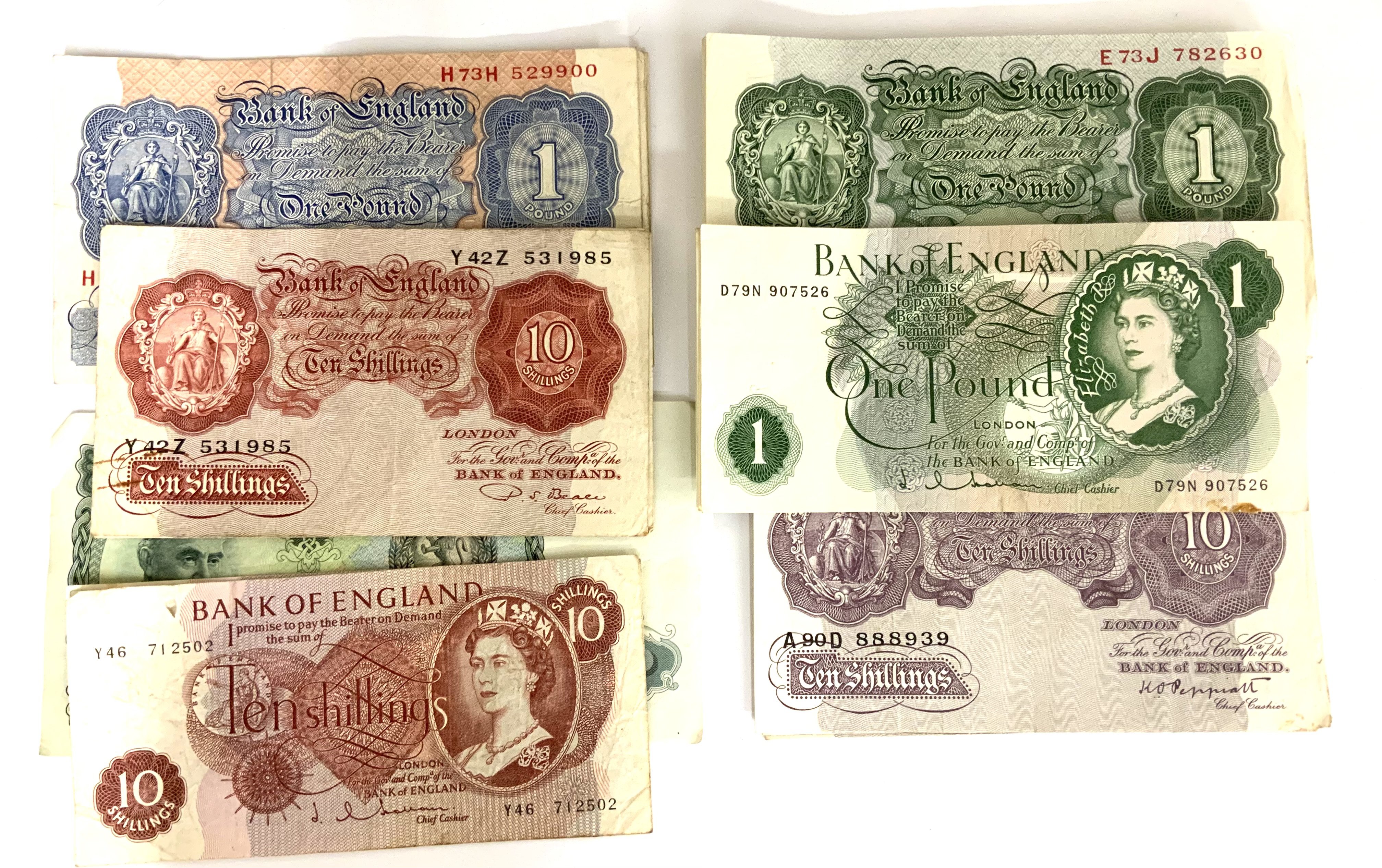 Mixed lot of British banknotes. 9 Blue Pound notes 1940-1948, 29 Green Pound notes 1939-49, 5 Ten Shilling notes Circa 1940, 4 Red Ten Shilling notes, Commonwealth - Goverment of Malta Two Shilling note.