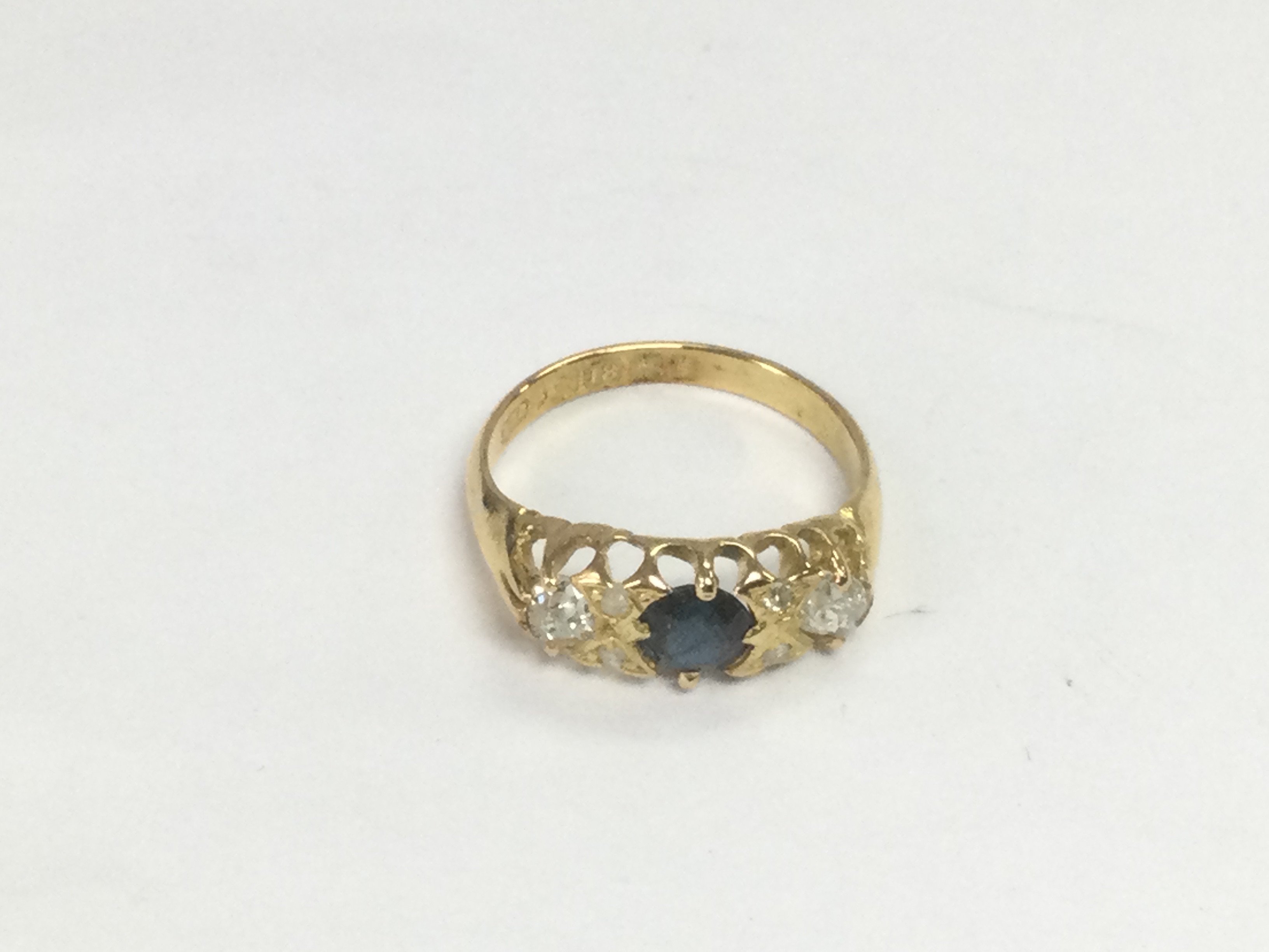 An 18ct gold, three stone diamond and sapphire ring, approx 2.9g and approx size K. Shipping category A.