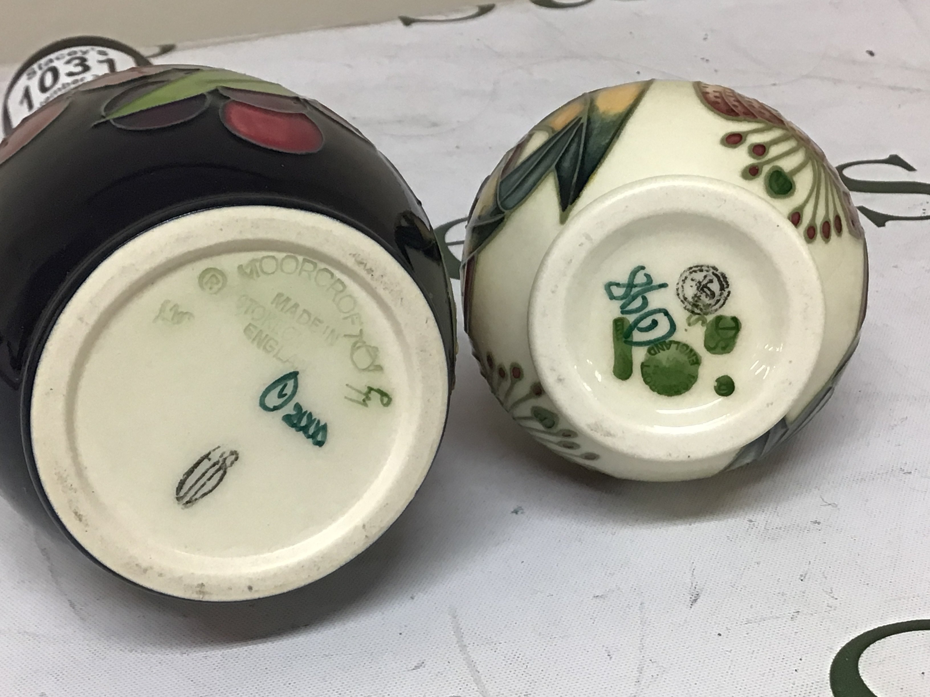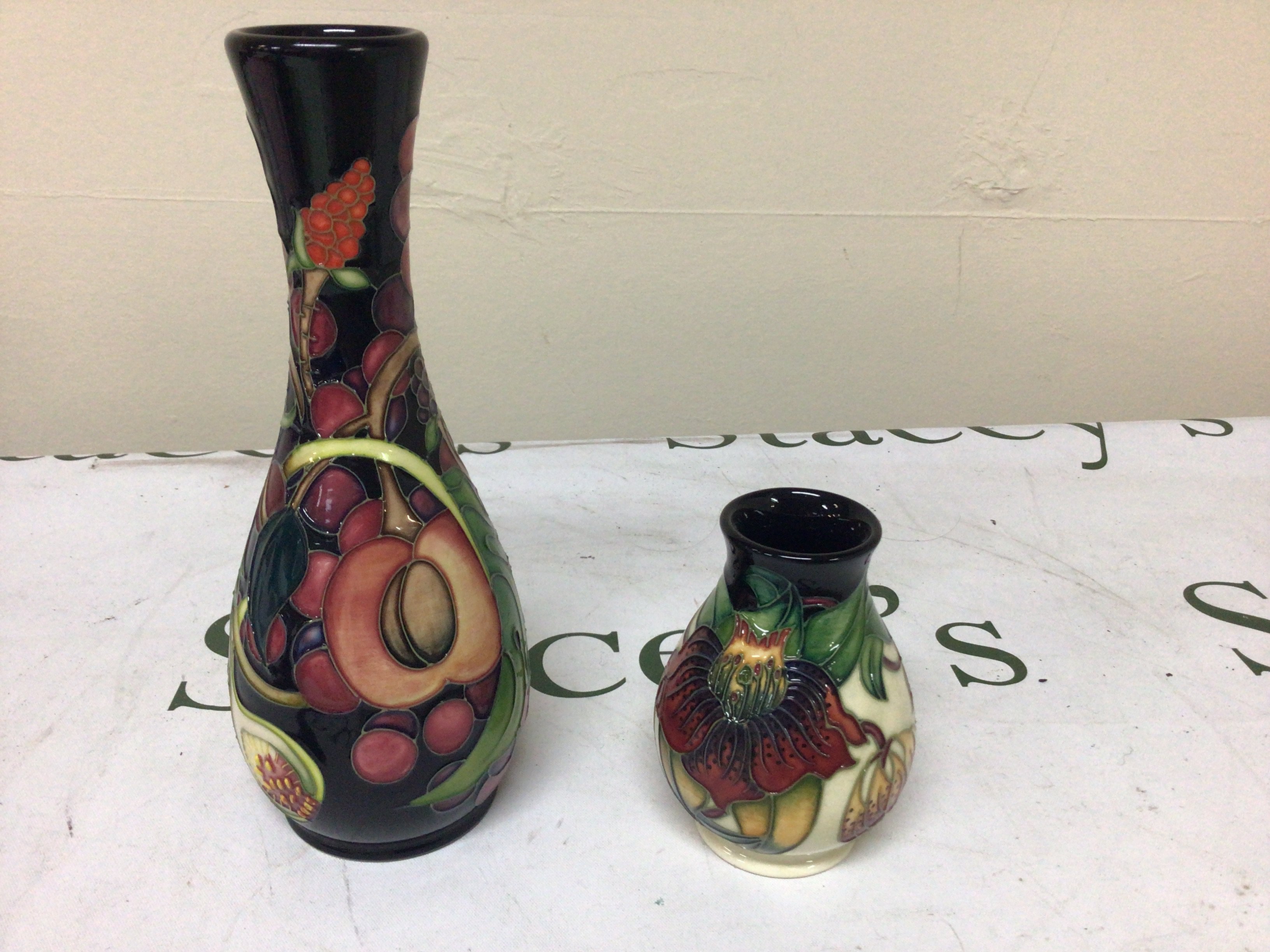 A Moorcroft vase decorated with pomegranate and other fruit and smaller Moorcroft vase. (2) No obvious damage vase height 21cm