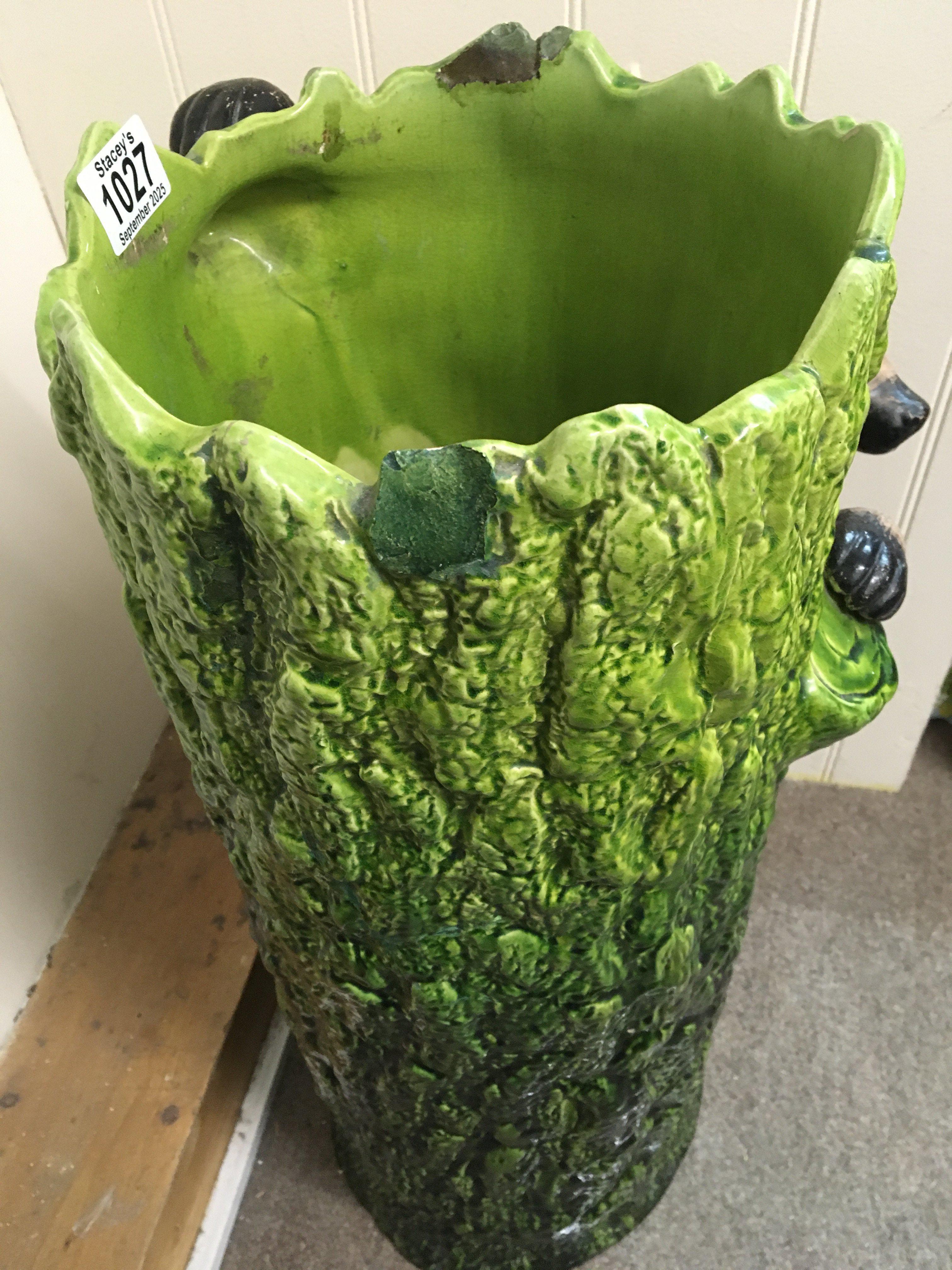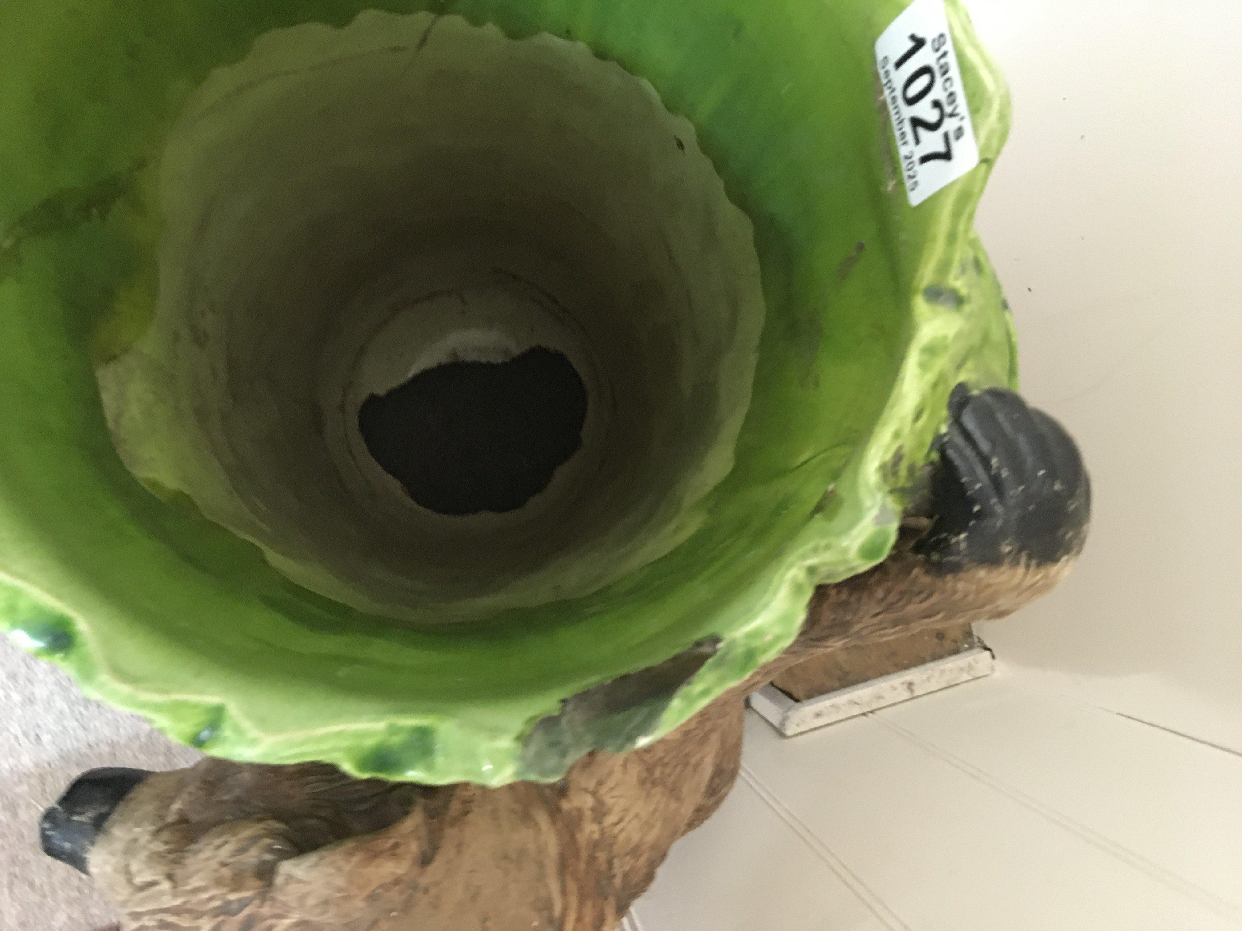 A Bretby stick stand in the form of a bear beside a tree trunk .