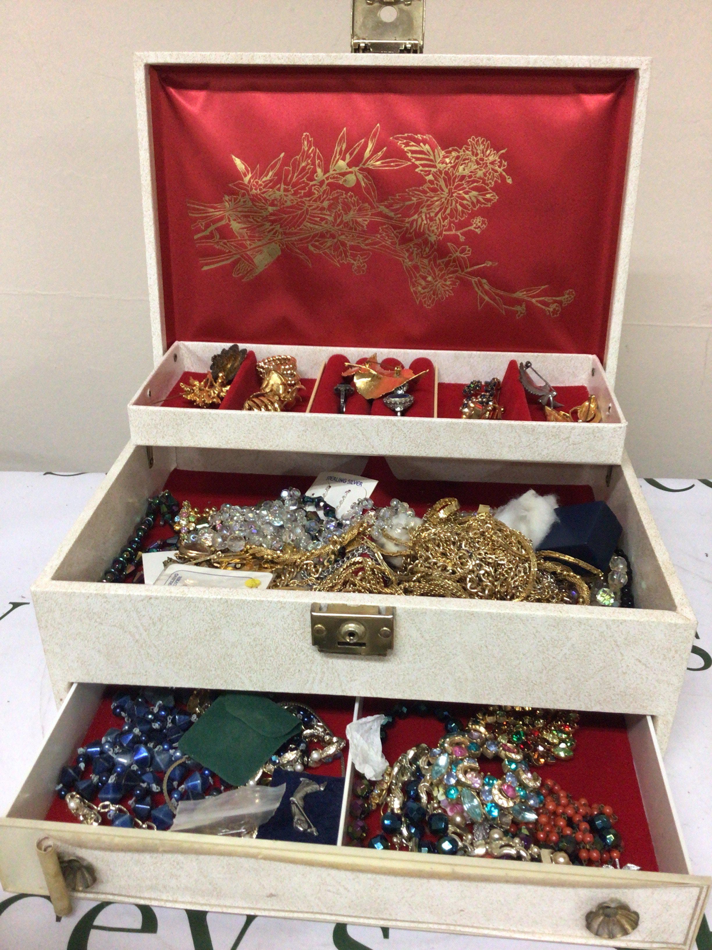 A box containing a collection of costume jewellery including brooches necklace and other oddments.