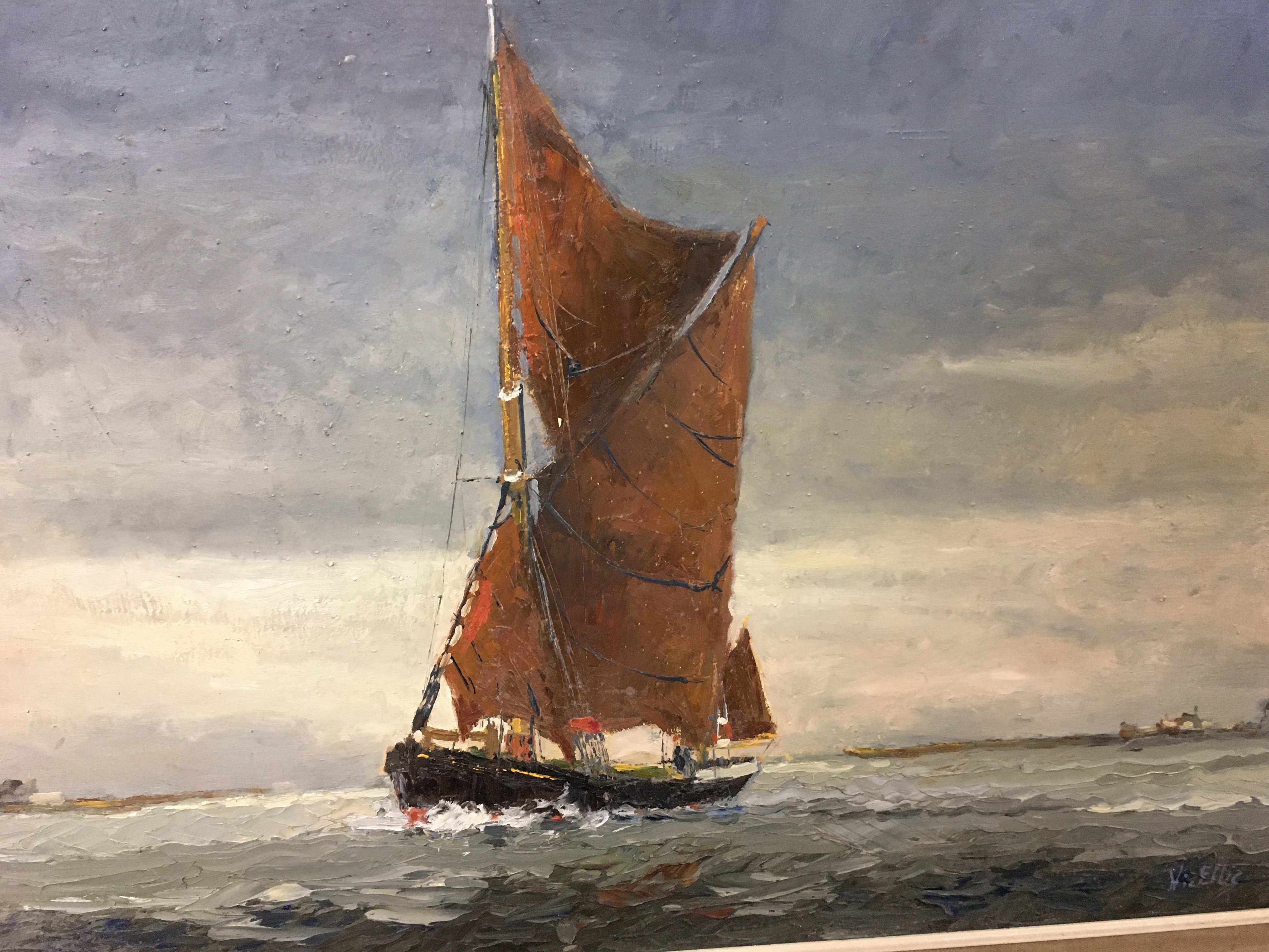 A framed vic ellis oil on canvas painting , Thames barge frame size 84x58cm