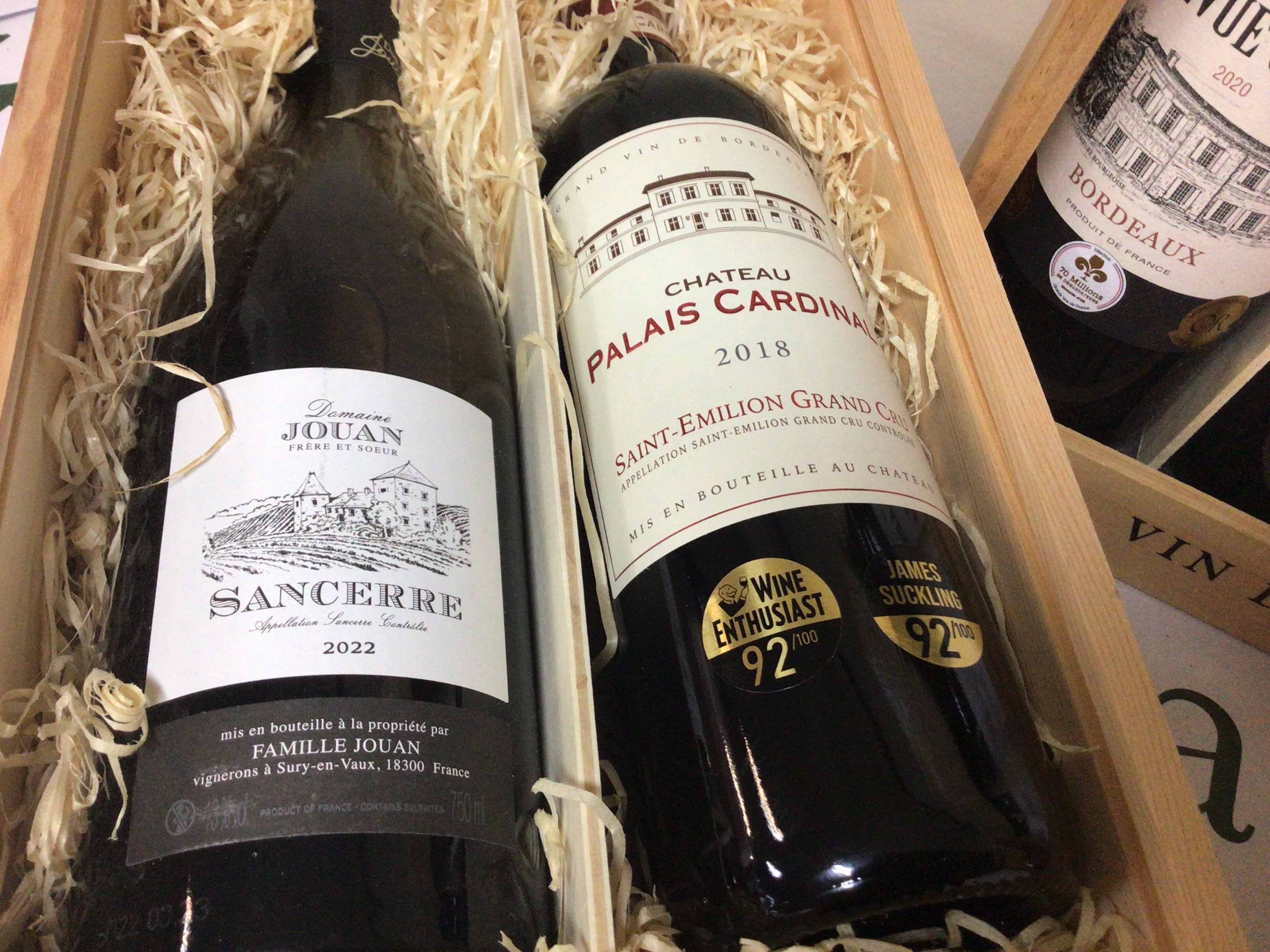 A collection of quality Vintage wines from the Bordeaux region and Saint-Emilio. some grand cru a bottle of Bollinger Champagne all well presented in wooden cases.