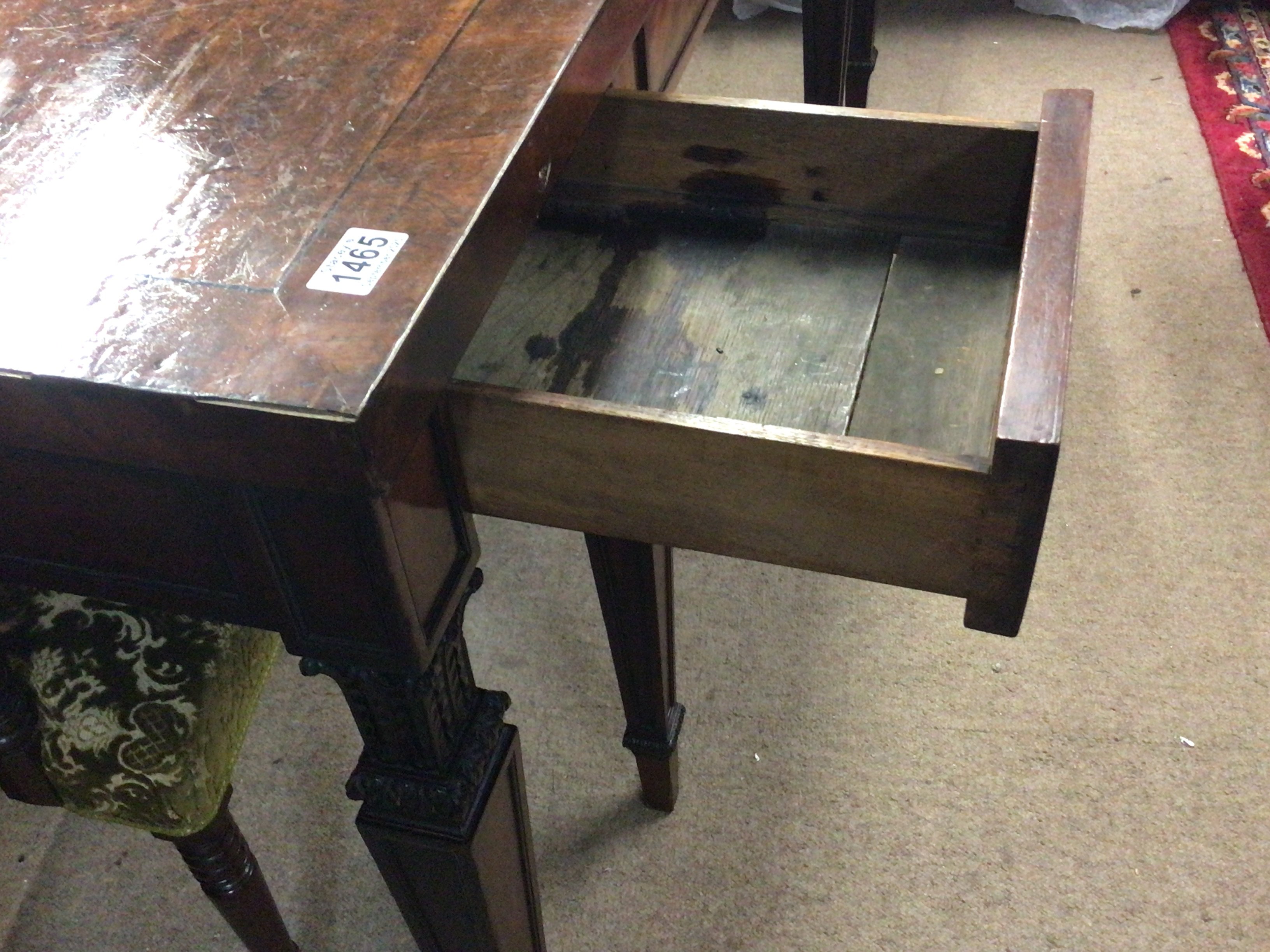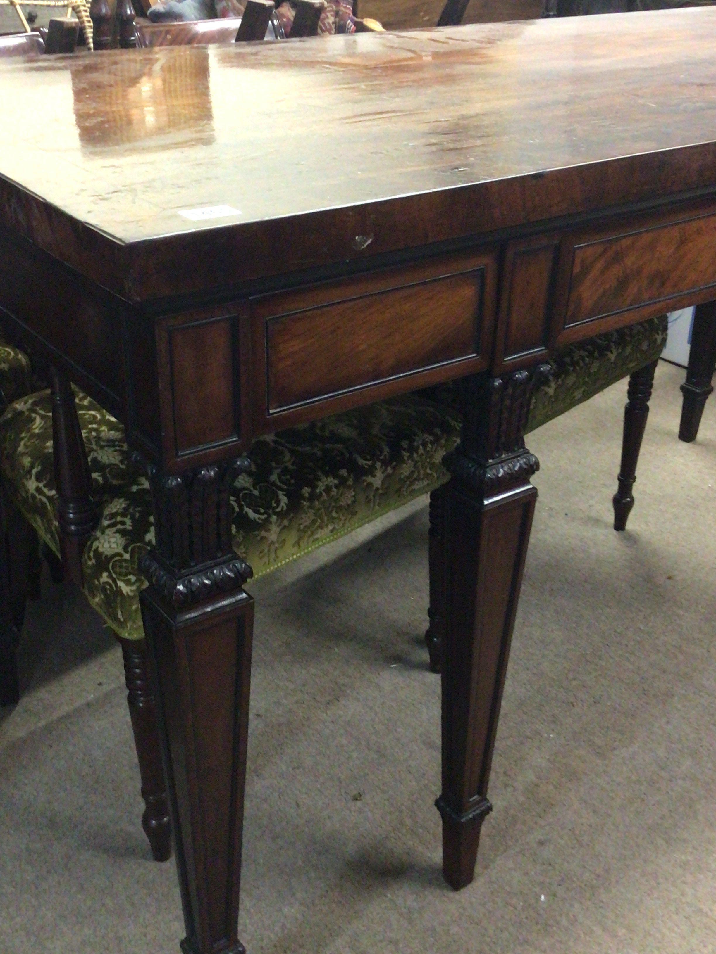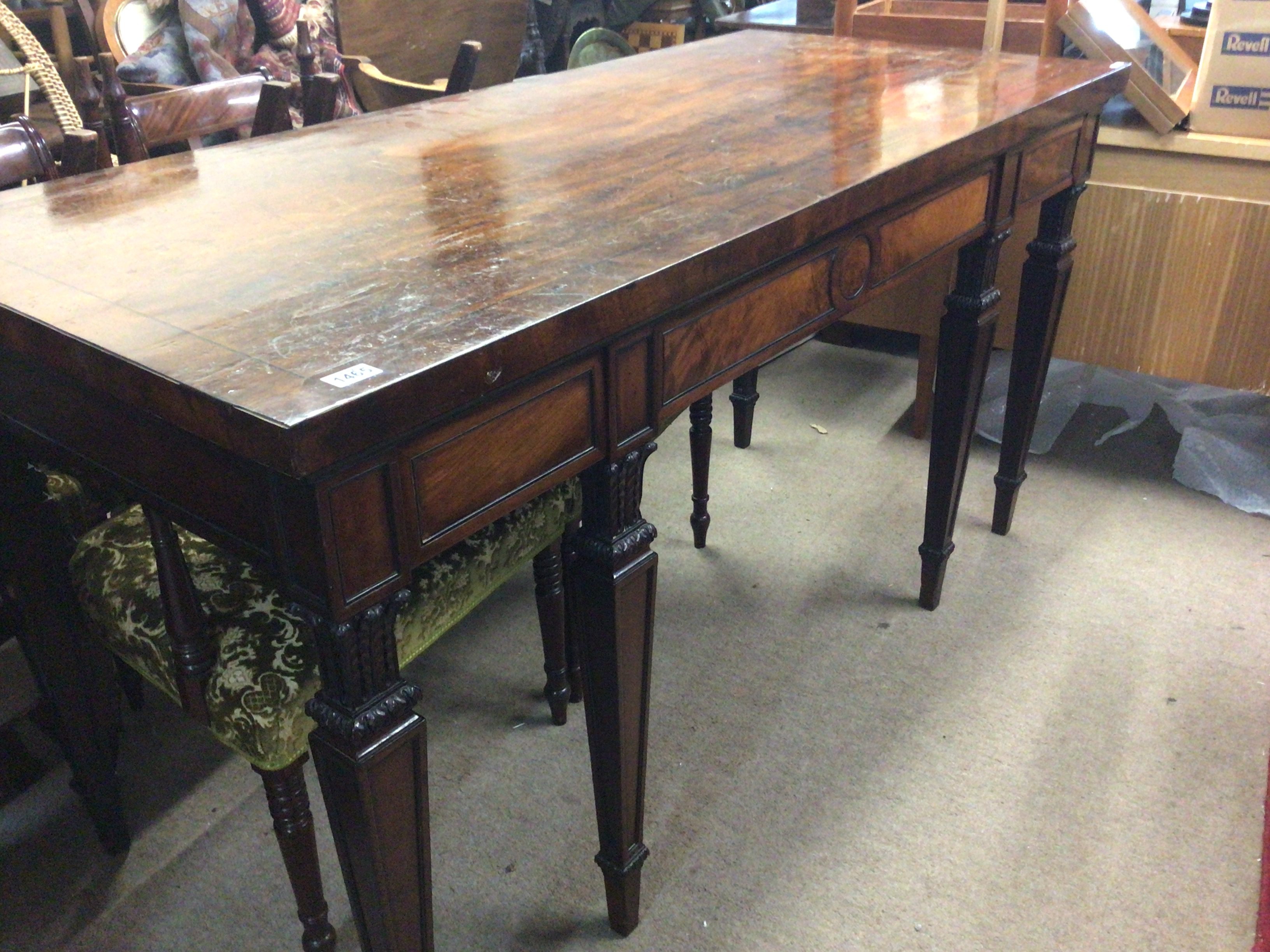 A quality George III Mahogany dining room serving table the rectangular top with an ebony banding above three drawers with four front tapering legs with stylised acanthus leave capitals 168cm long 88cm high 75cm deep.