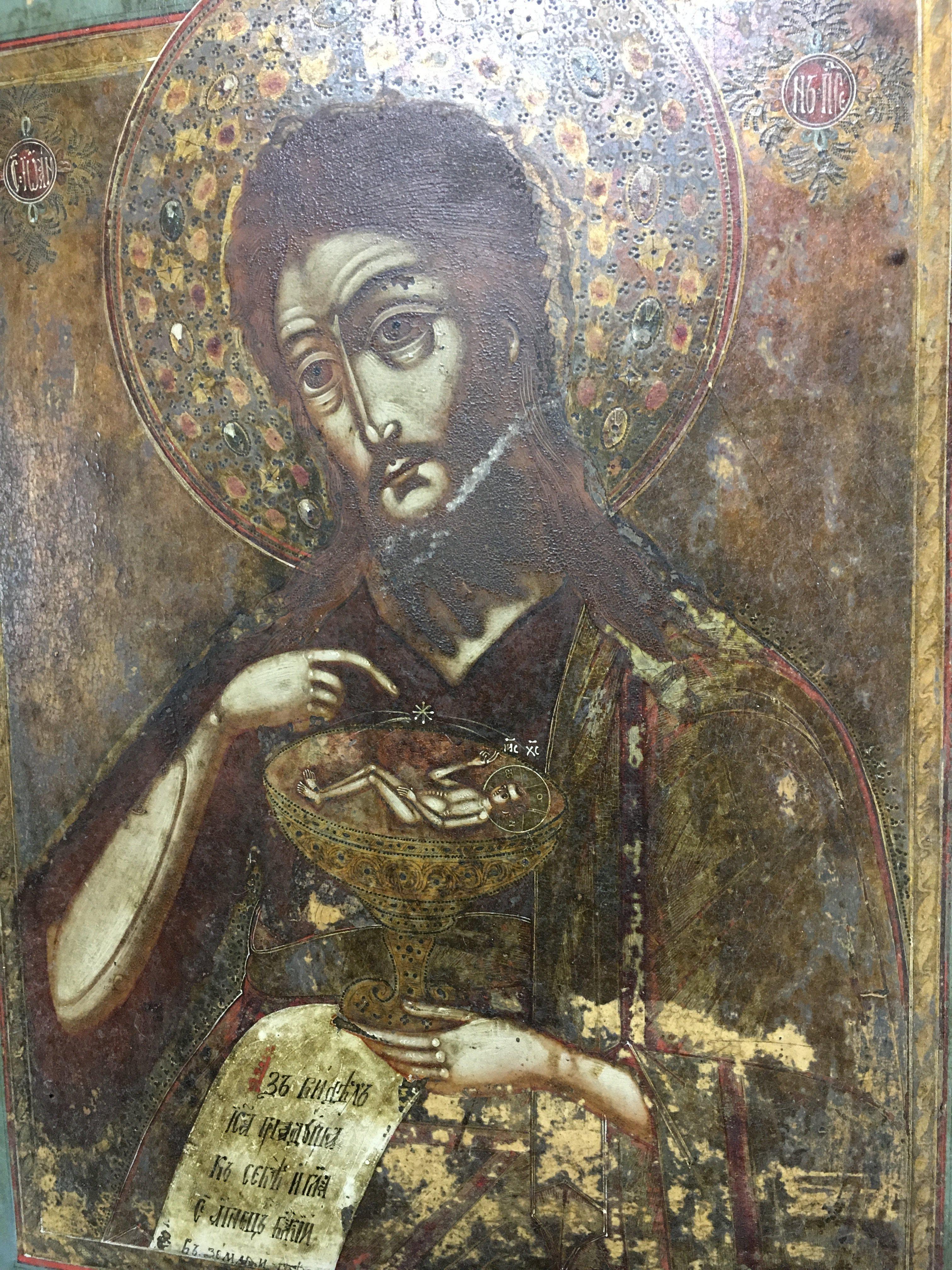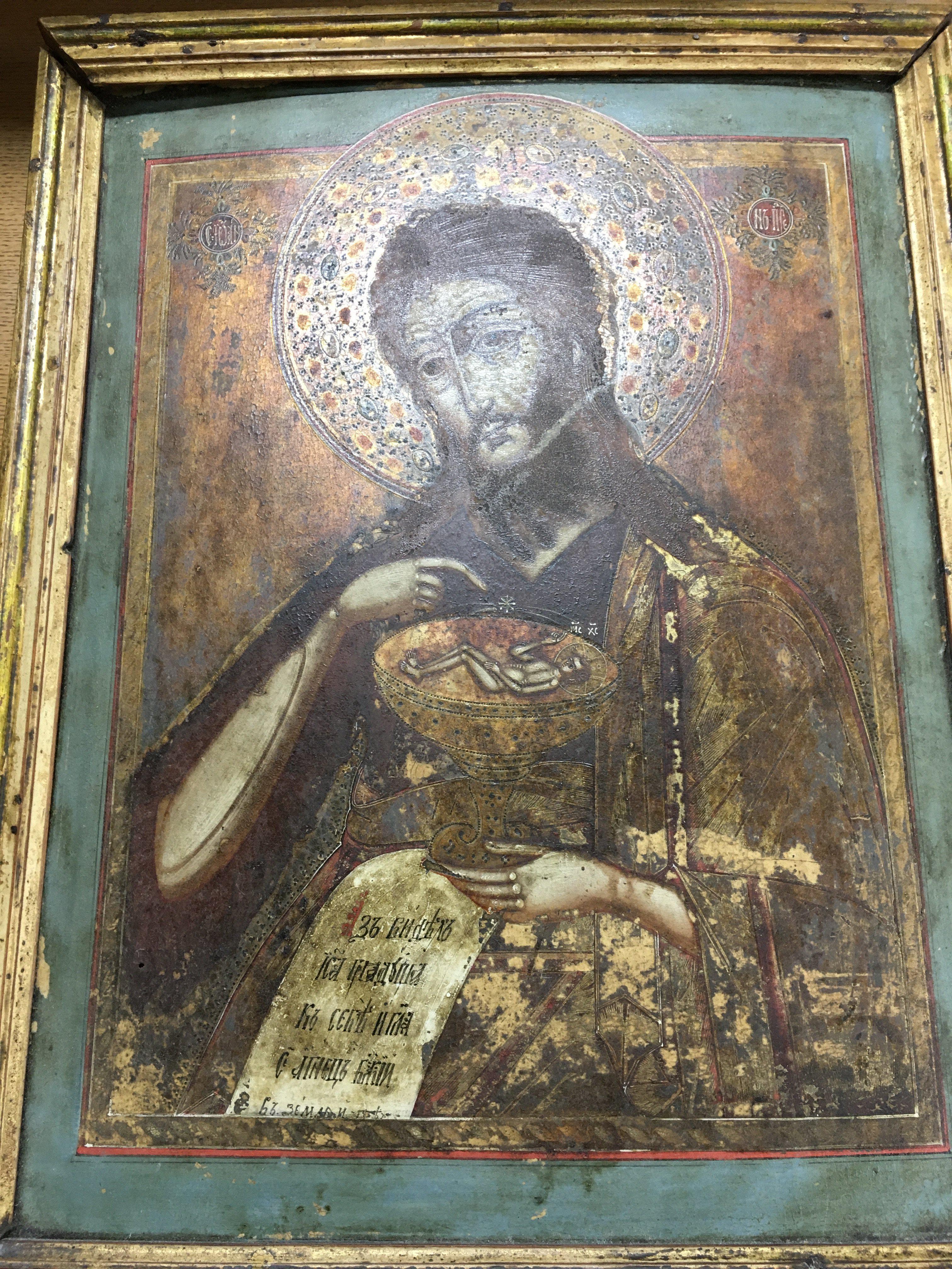 A framed tempera on wooden panel Russian Icon of God holding the Christ child and giving a benediction