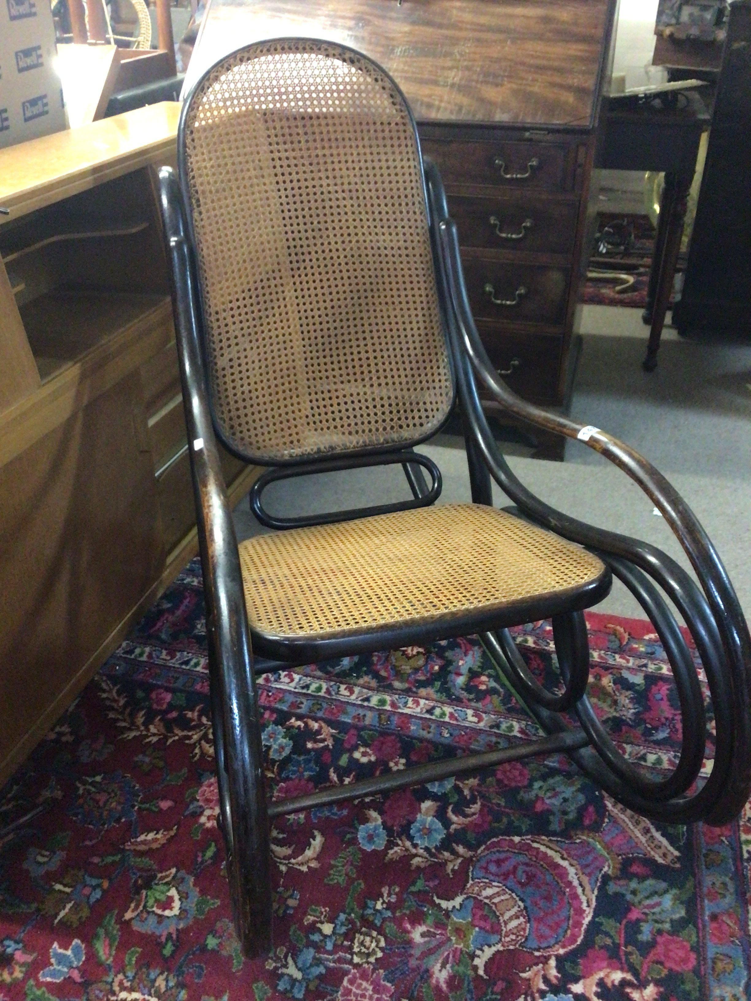 A pin early 20th century bentwood rocking chair with a burgere cane back and seat.
