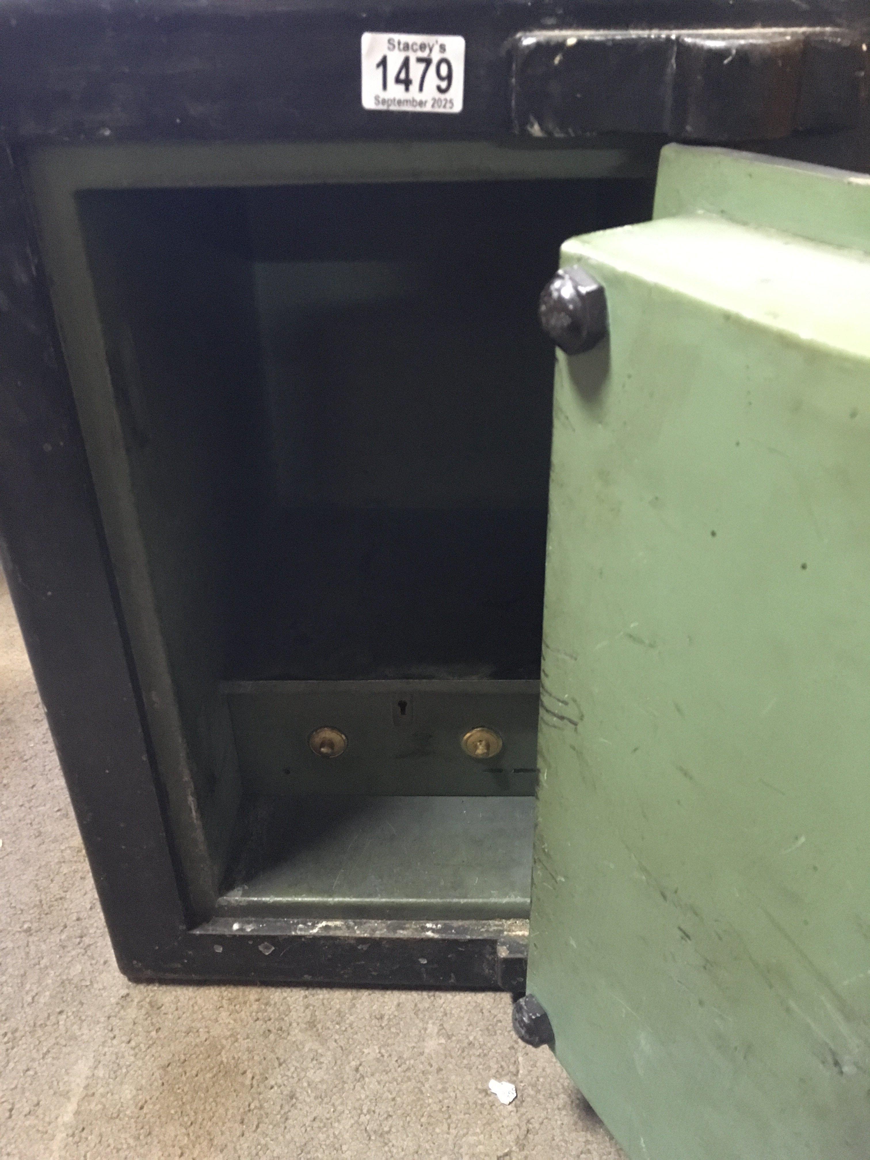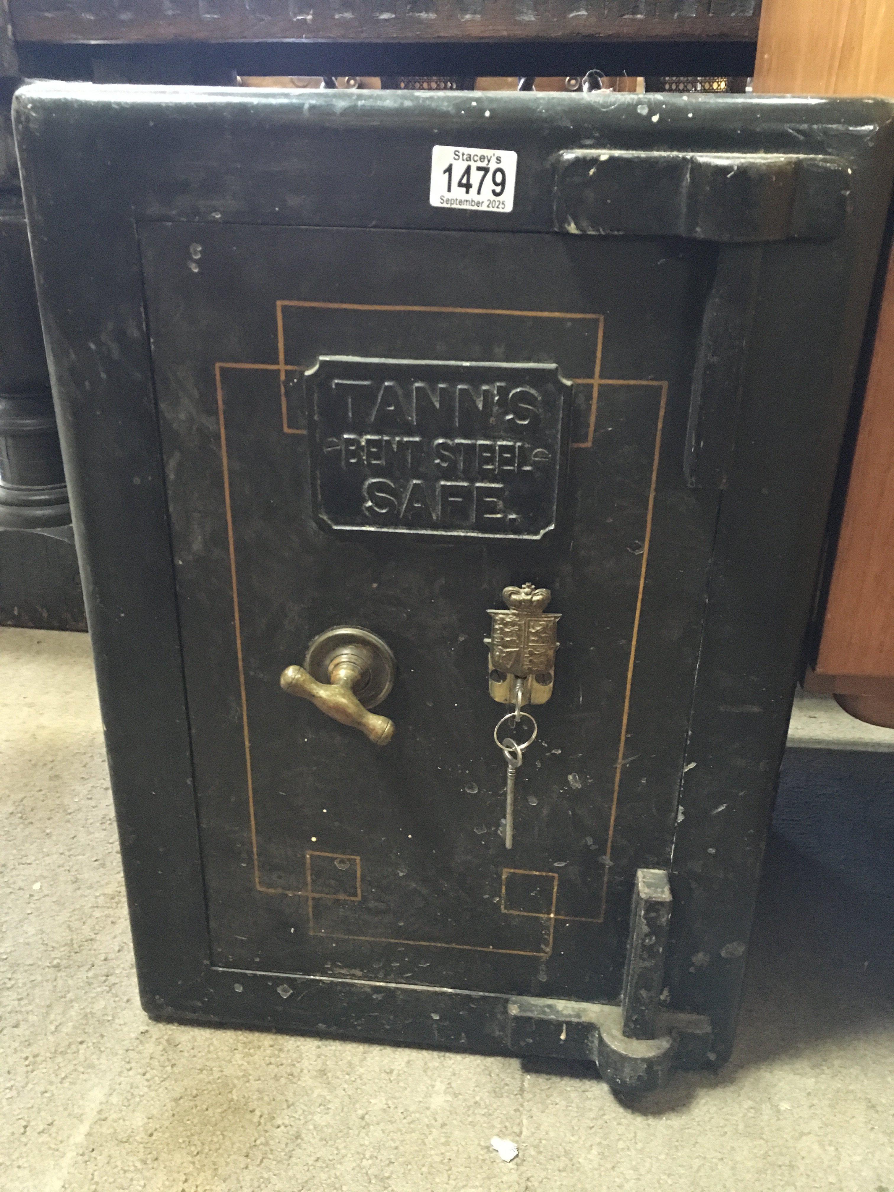 A Tanns bent steel Safe with key approximately 80cm tall 40cm wide