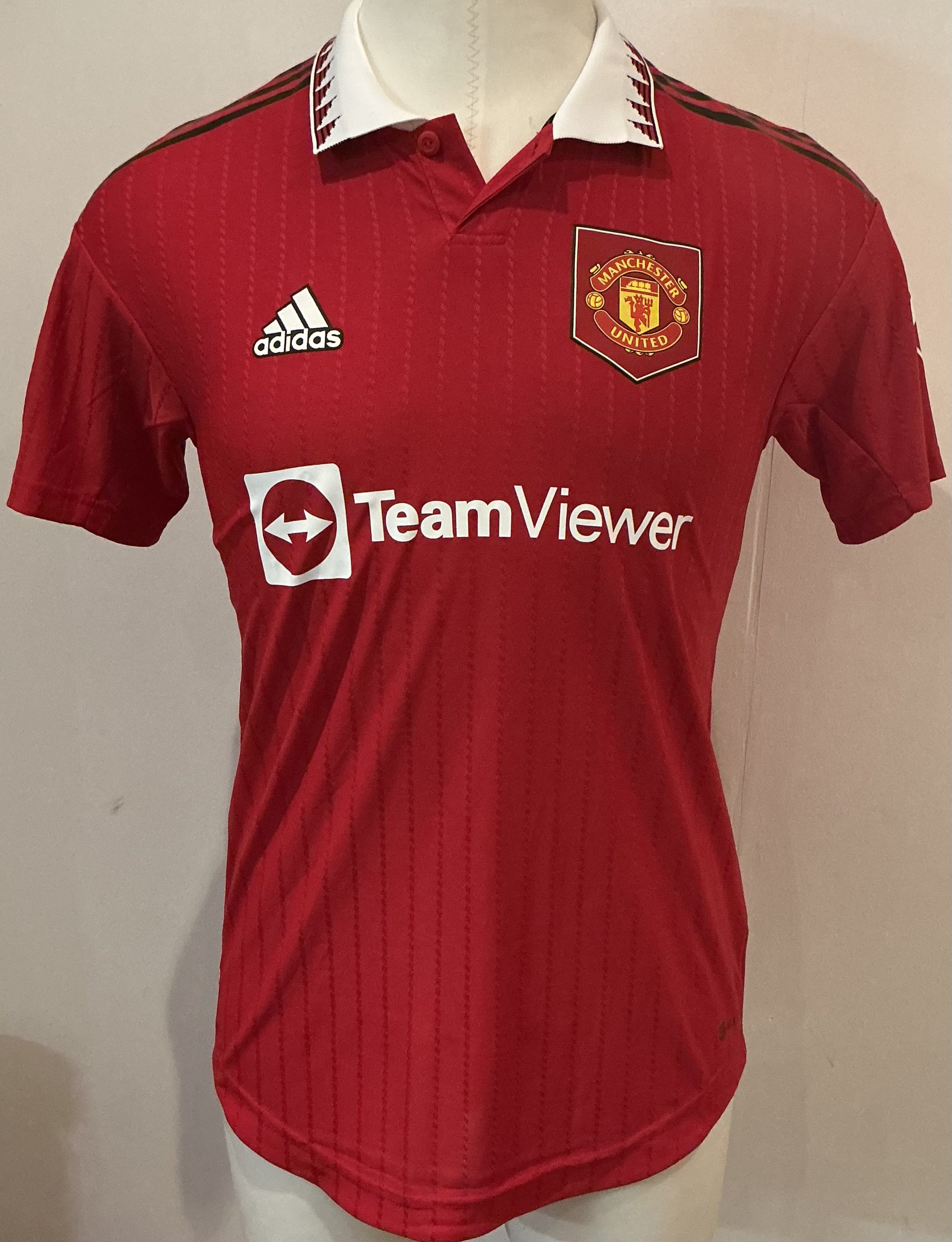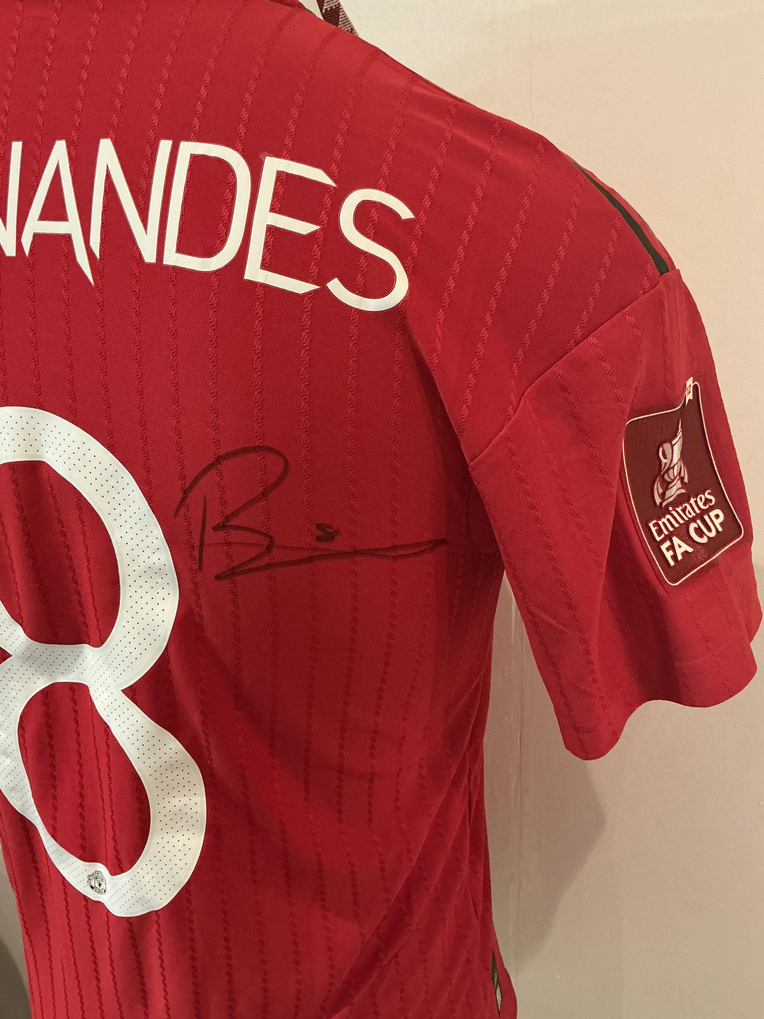 (Day Two 28 Oct 9am) Bruno Fernandes 2022 - 2023 Manchester United Match Worn Football Shirt: Red short sleeve number 8 with B.Fernandes to rear. Emirates FA Cup badging to sleeve. Swapped with Everton player after the match at Old Trafford. Signed to rear by Bruno. Manchester United went on to the final in this competition.