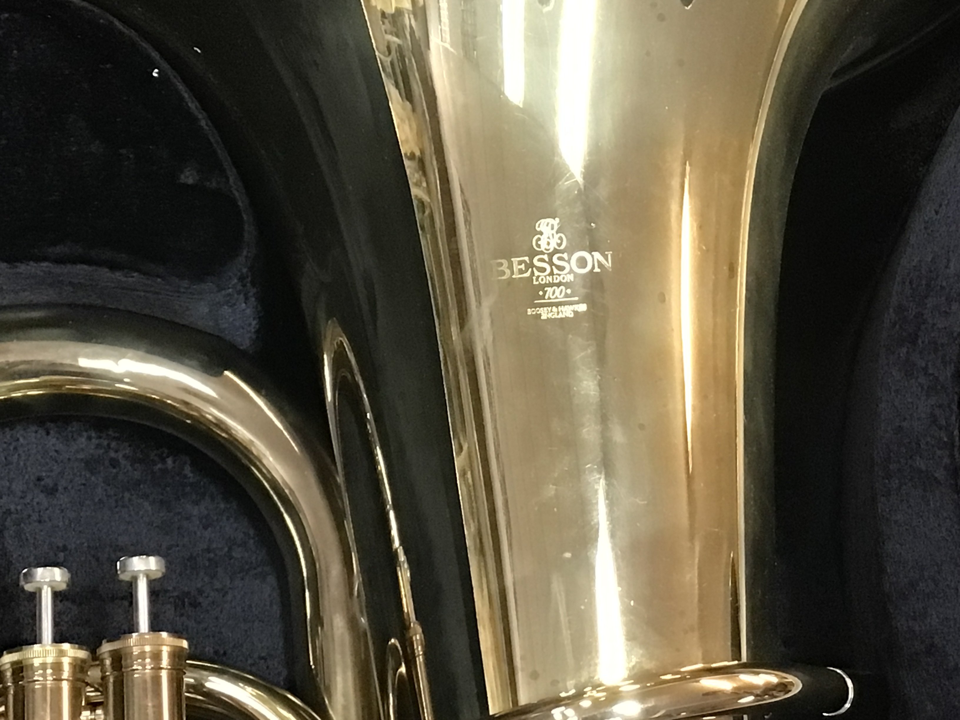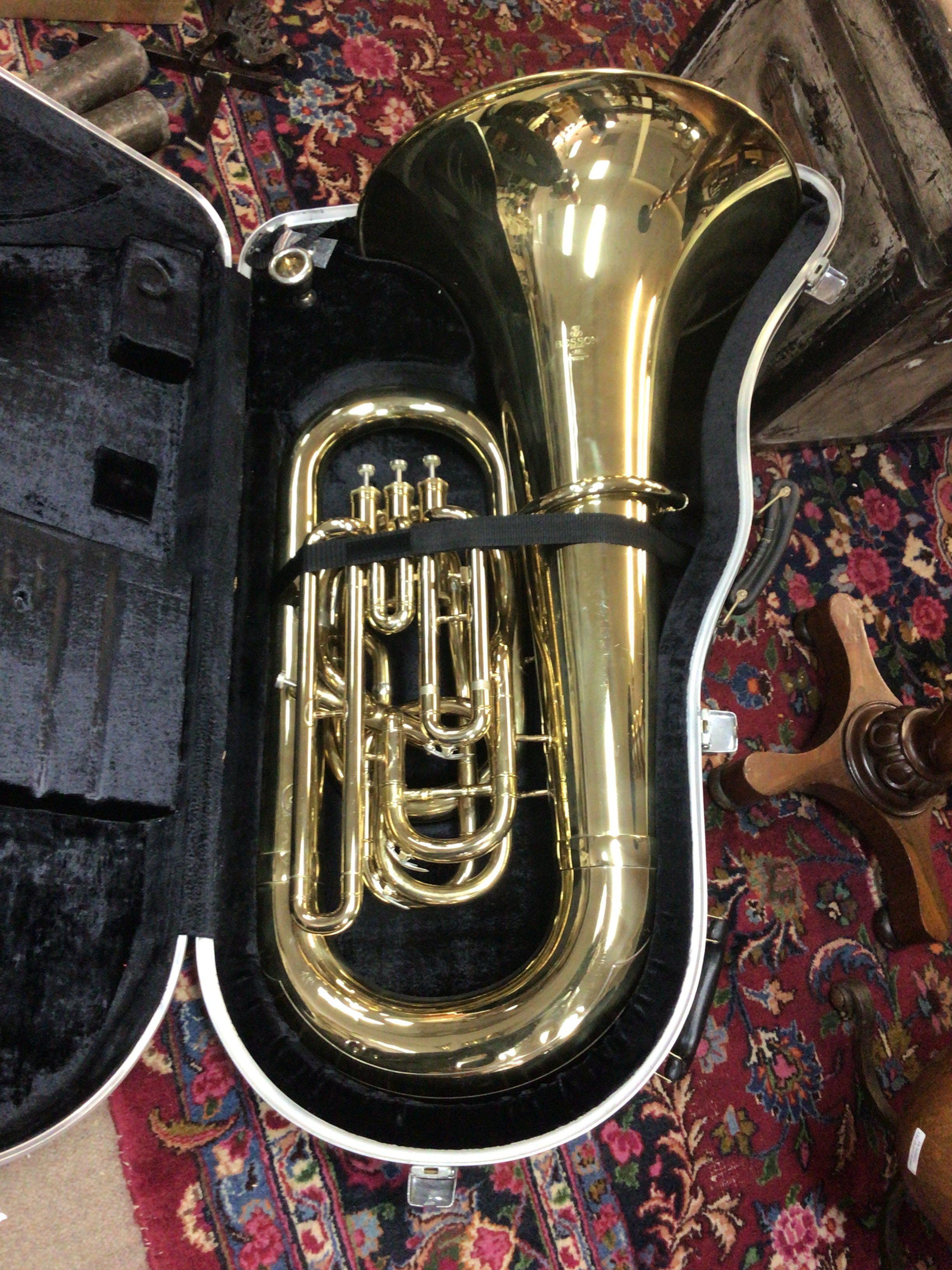 A quality lacquered brass Tuba in a fitted case maker Besson London 700. Condition few scratches and one small dent.