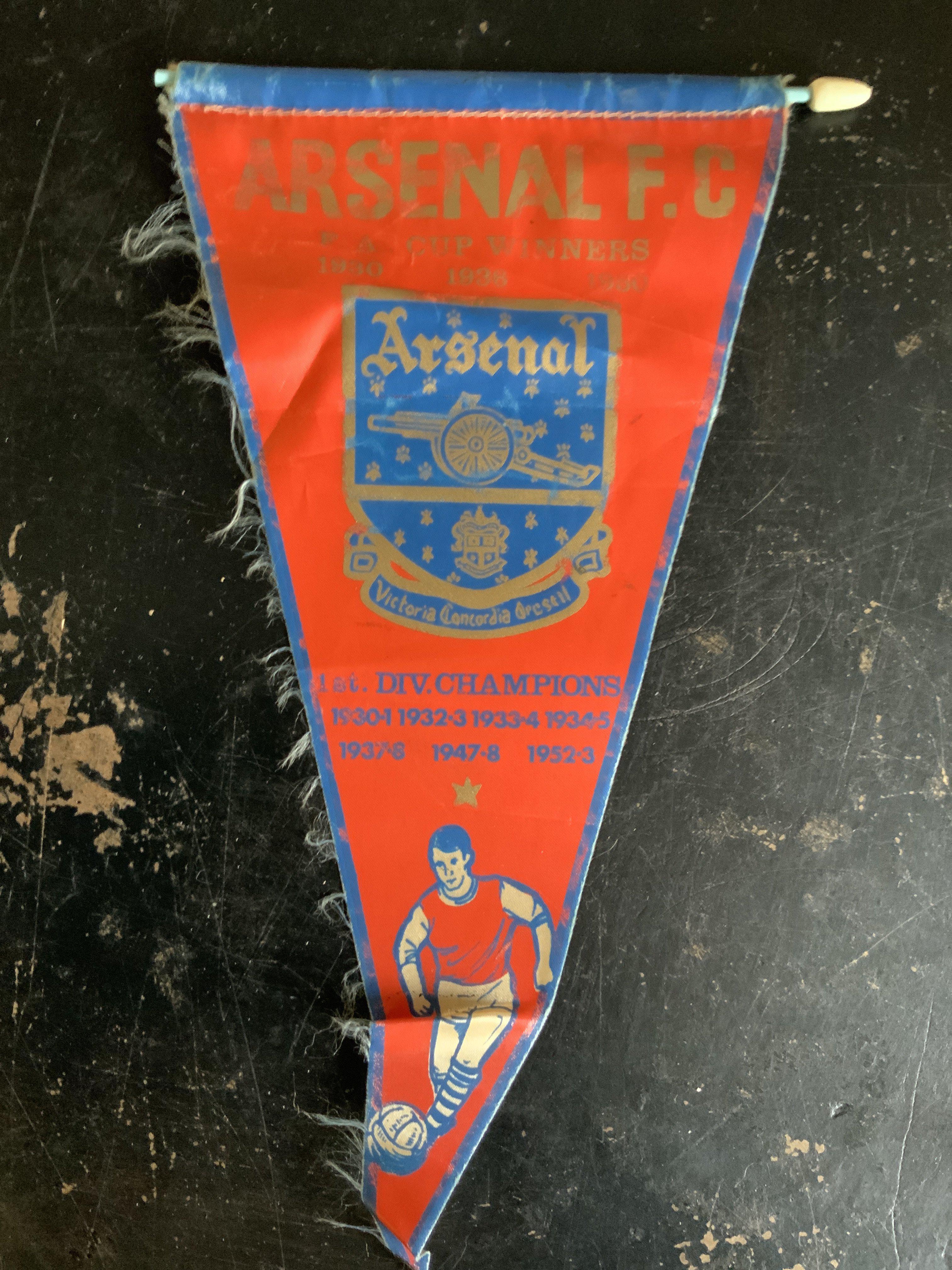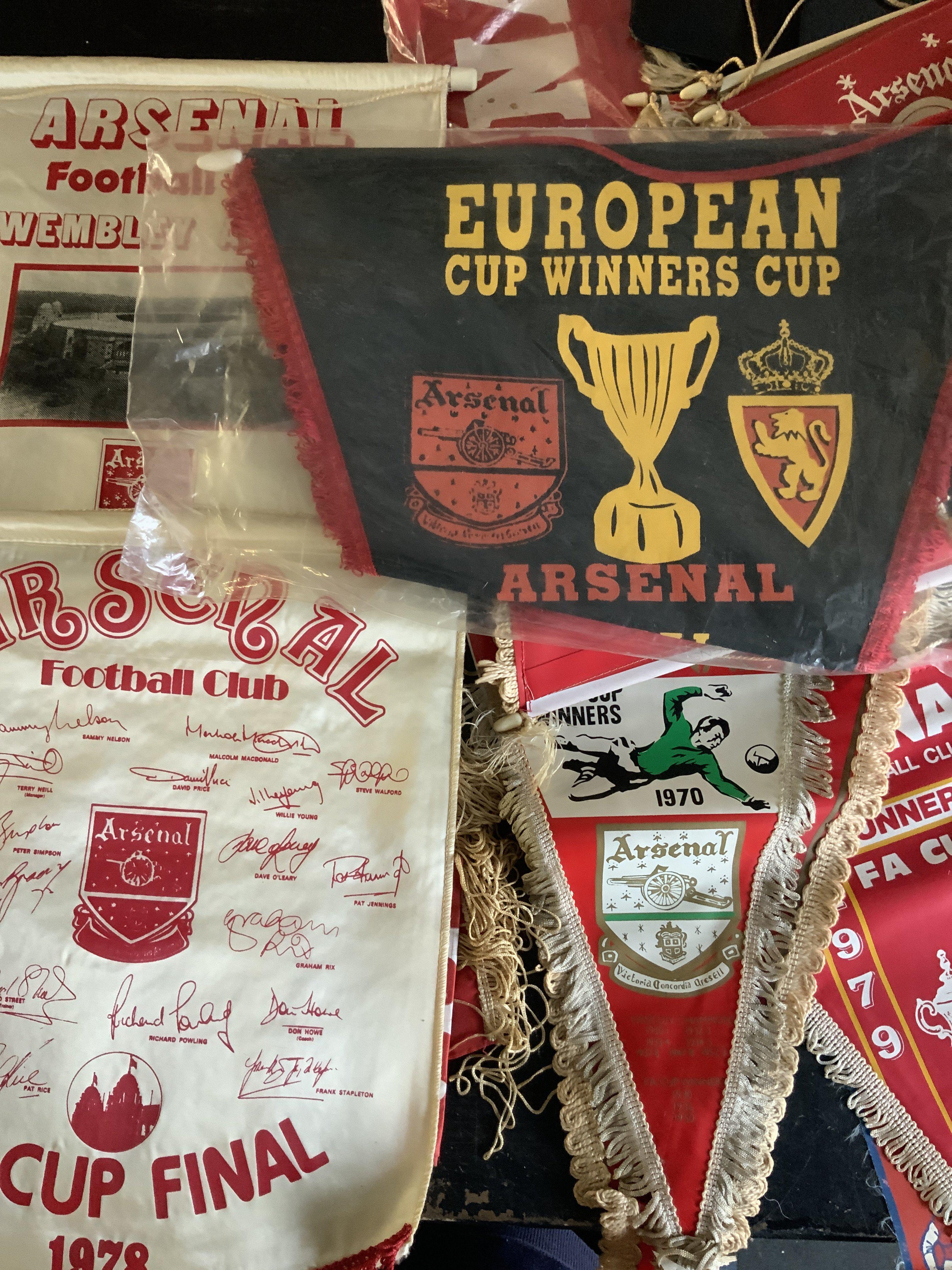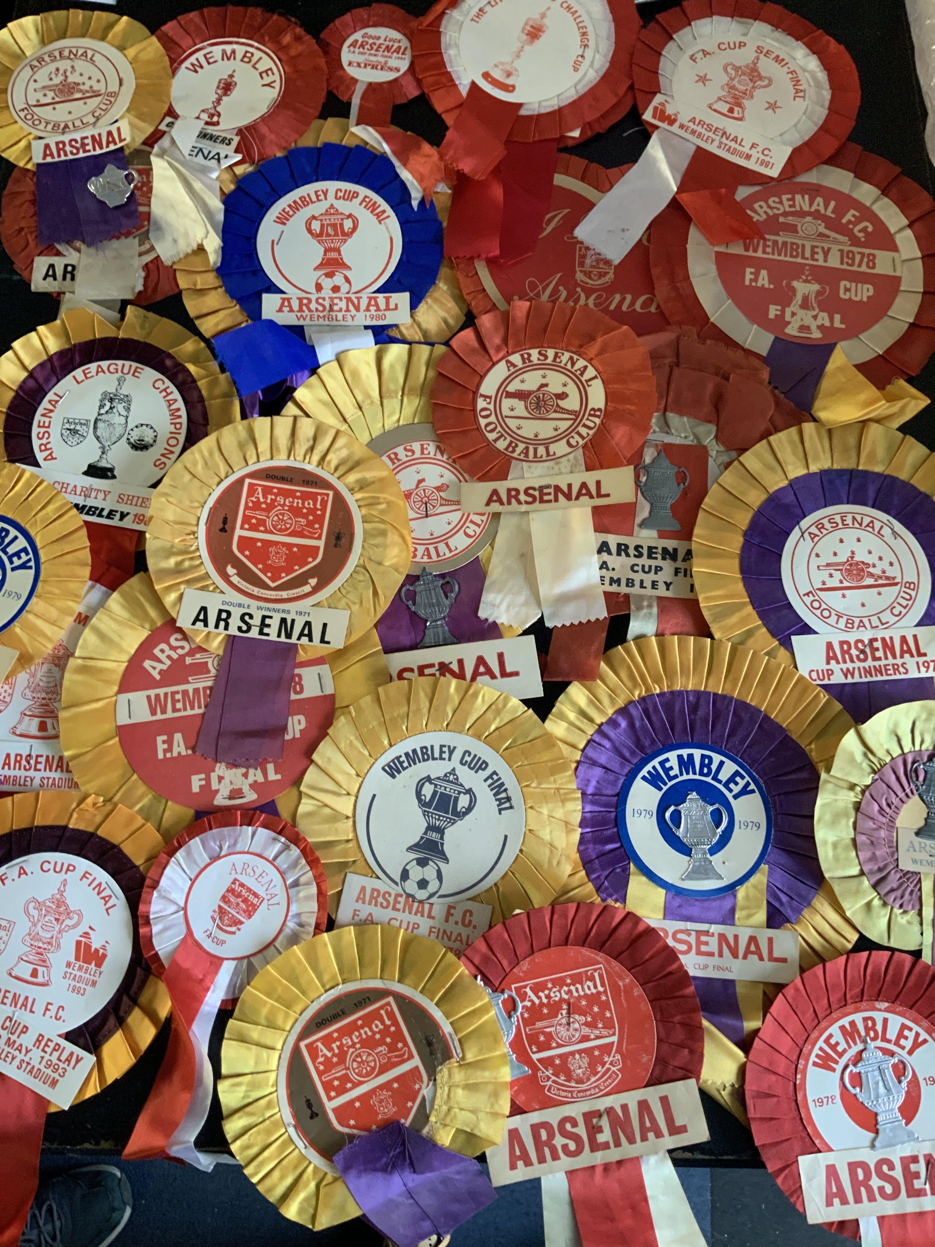 Arsenal Pennants + Rosettes: Superb collection not to be missed. Nice pennants include 1974 Armstrong Testimonial, Double Winners 70/71, Fairs Cup Winners, Cup Final 78, 60 consecutive years 1978 in top fight and many more. (17) C/W 27 rosettes including cup finals throughout the 70s.