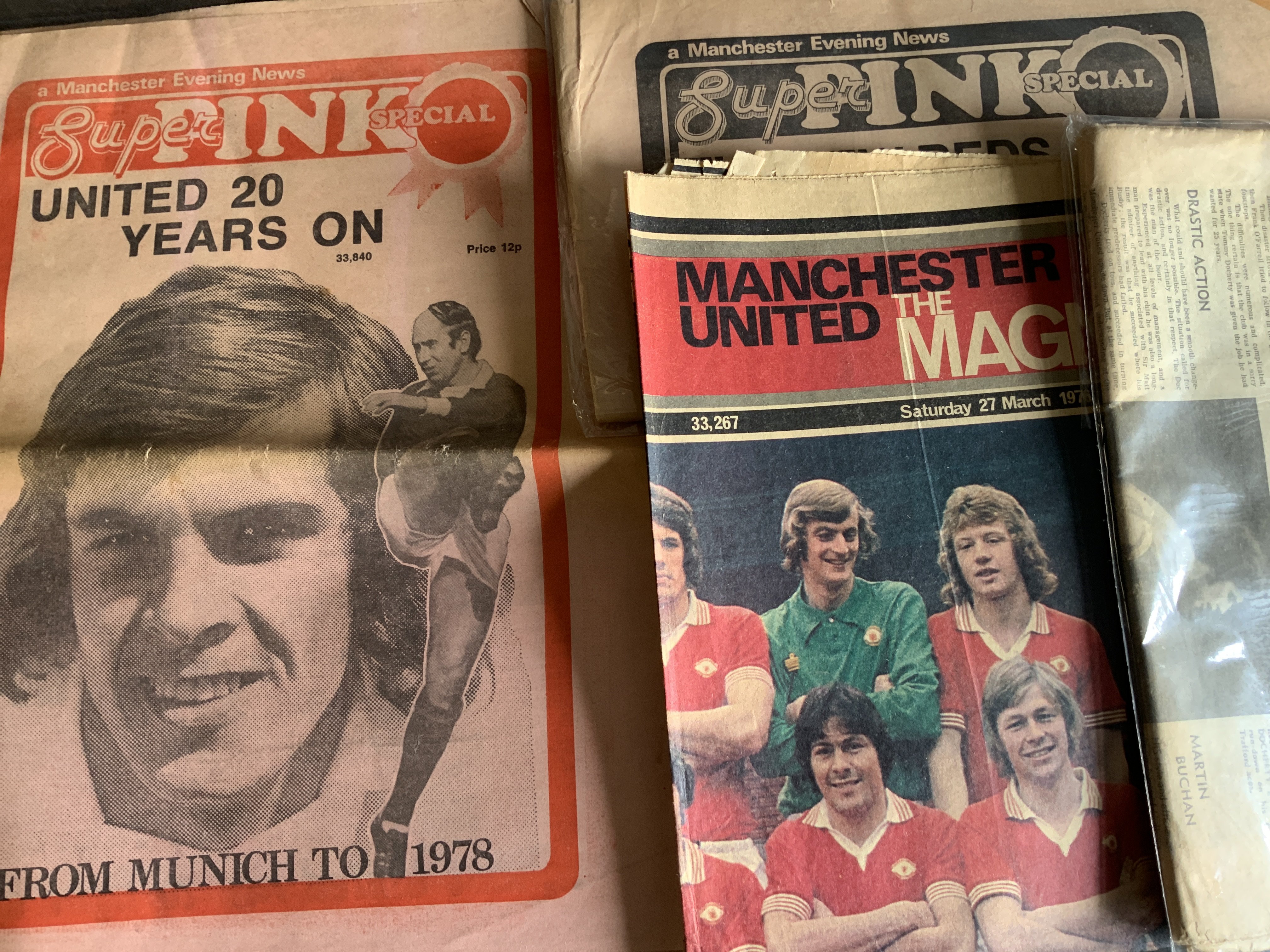 Manchester United Football Newspapers: Large box containing wide assortment with at least half featuring Man Utd in a few eras. (Box)