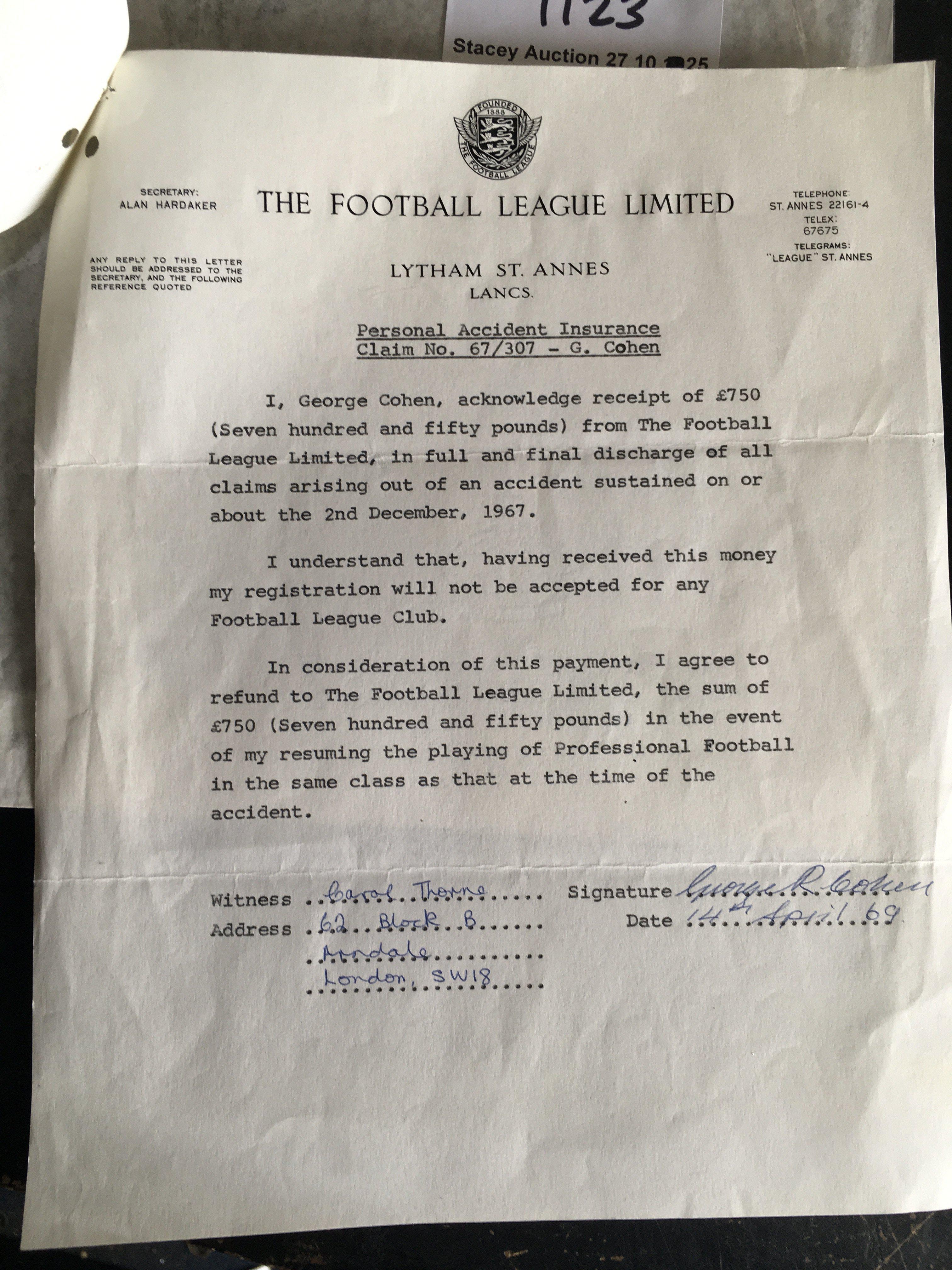George Cohen Personal Accident Football Letters: 1967 receipt from Fulham for 20k following a career ending knee injury in December 1967. A further letter on Football League headed paper signed by Cohen for receipt of 750 pounds. Interesting. (2)