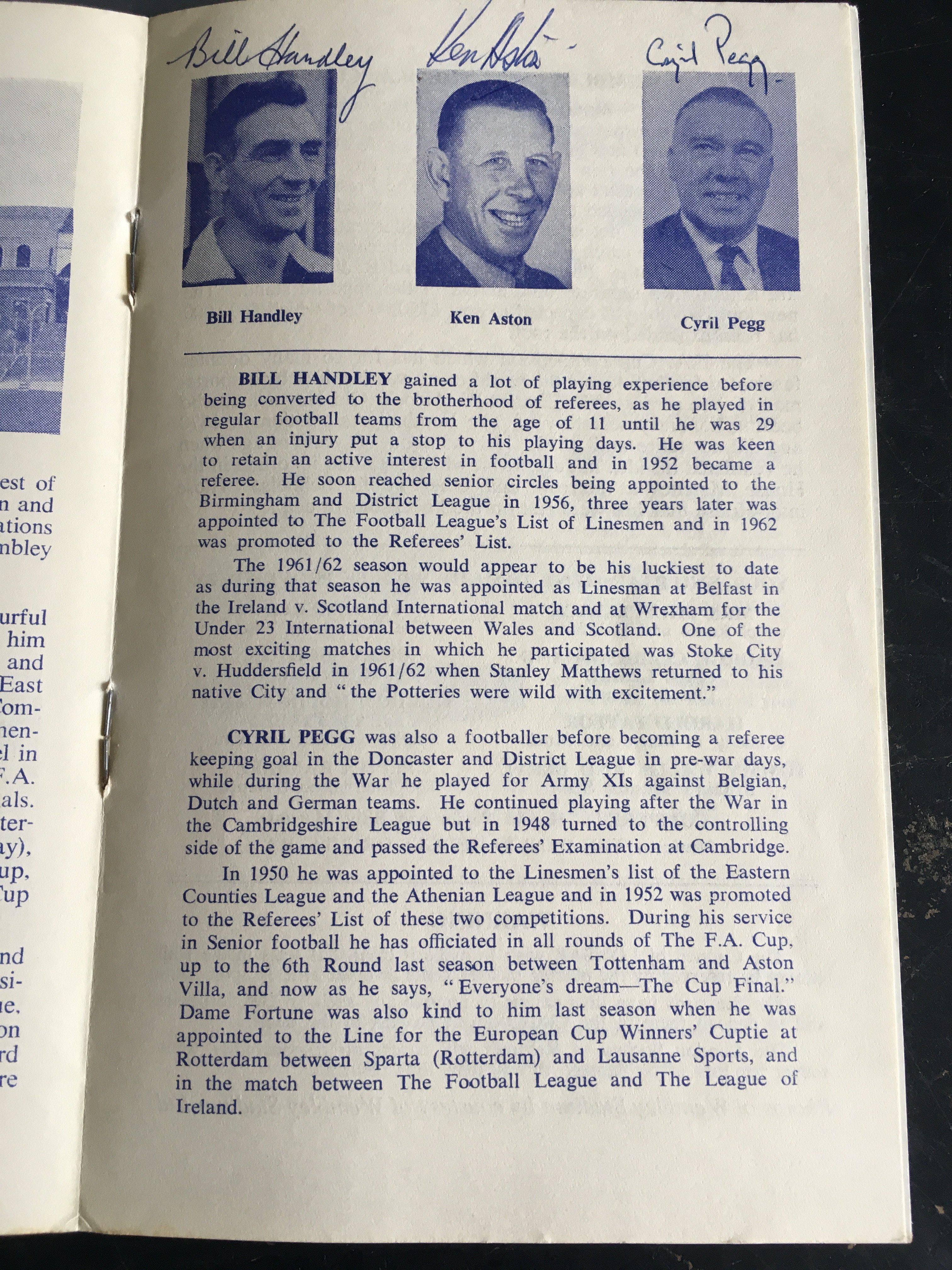 1963 Manchester United FA Cup Final Eve Of Rally: Traditional pre final rally to honour the cup final officials. Programme has been signed by the referee Ken Aston and both linesman. Aston famously refereed the Battle of Santiago World Cup match in 1962. He also introduced the use of Red and Yellow cards. Good condition.