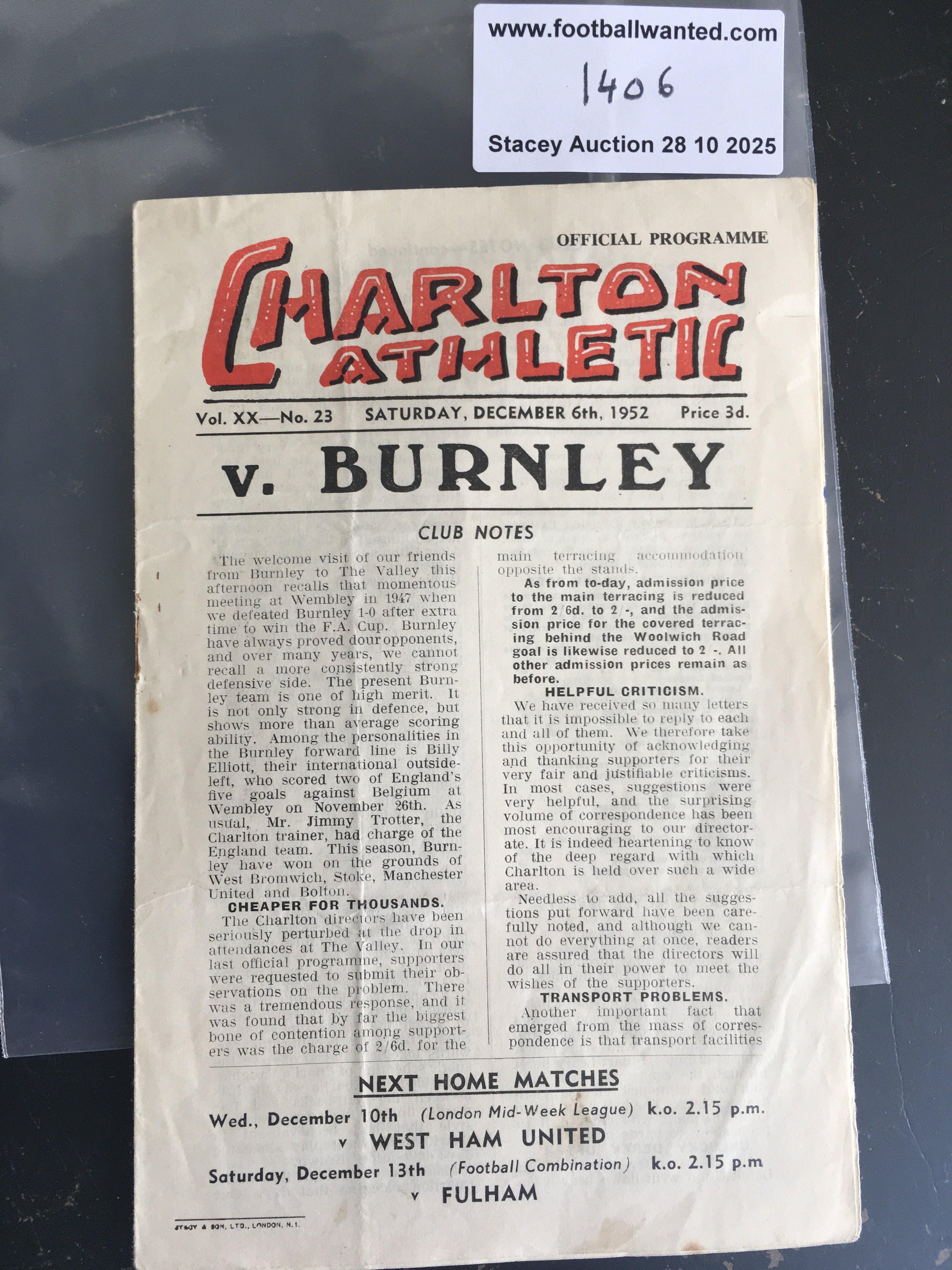52/53 Charlton v Burnley Postponed Football Programme: Dated 6 12 1952 in good condition with no team changes. Light fold.