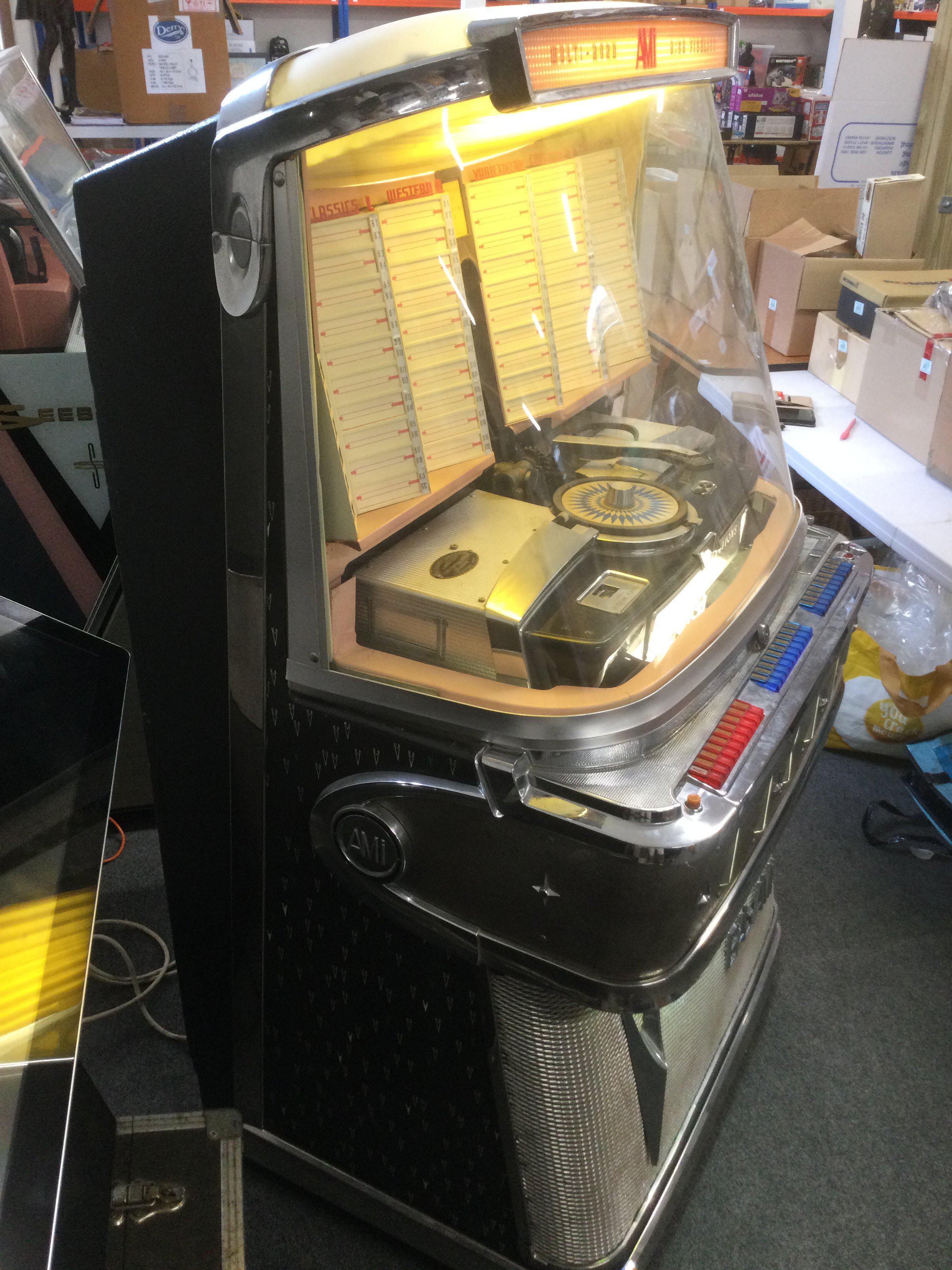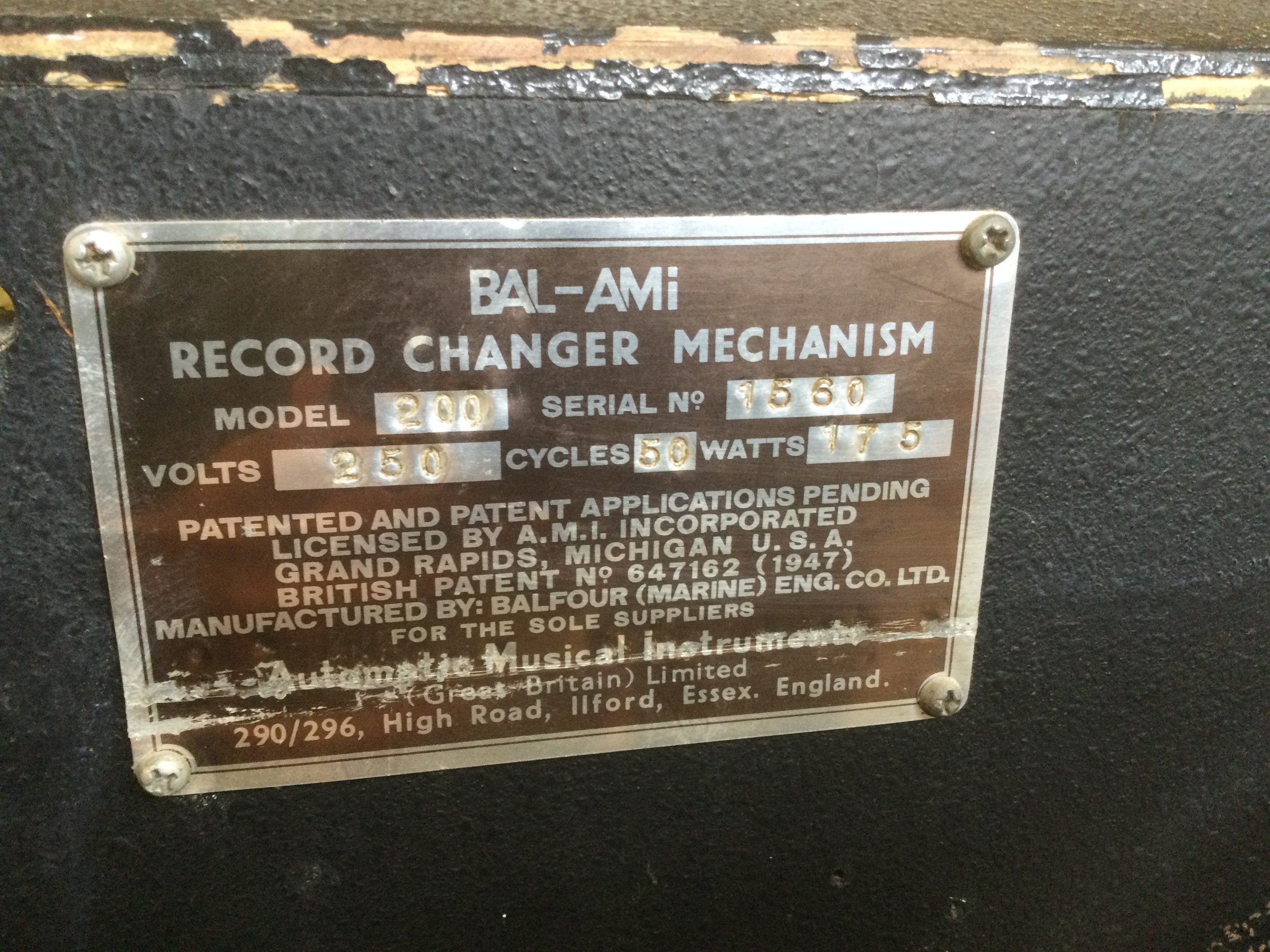 A Bal-Ami 200 jukebox. Powers up but not fully working, for restoration. No keys.