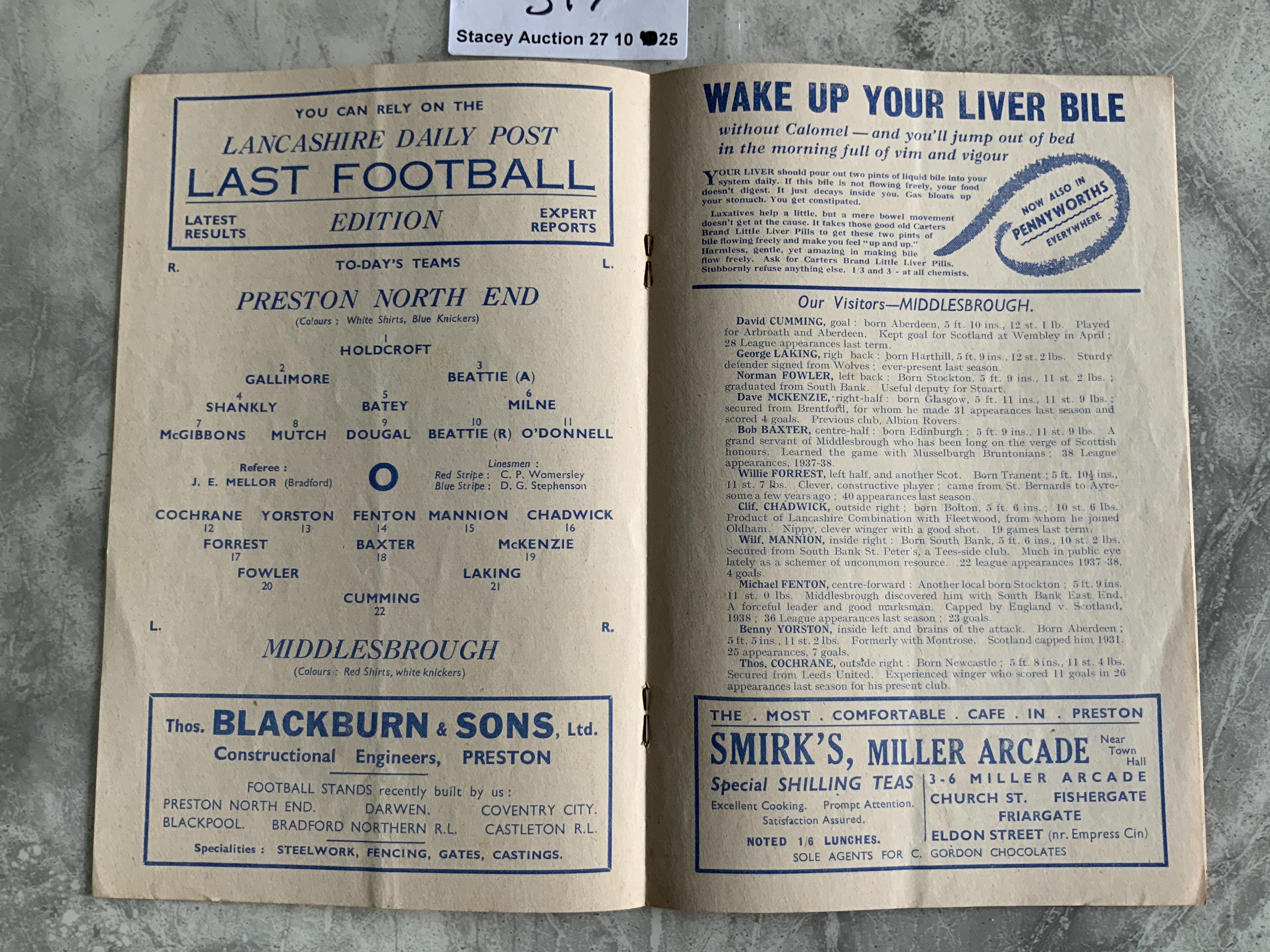 38/39 Preston v Middlesbrough Football Programme: 1st Division match in very good condition with no team changes.