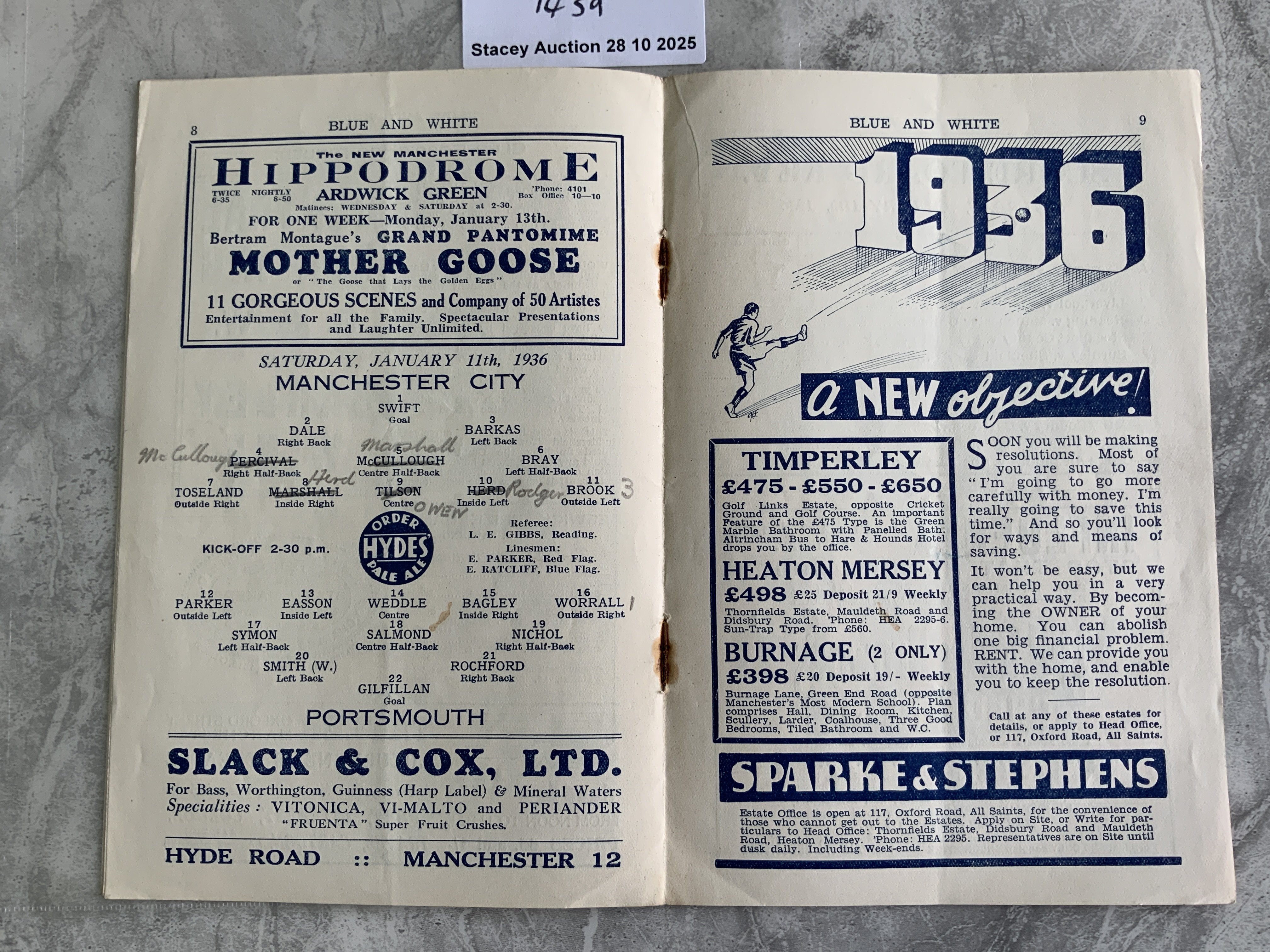 35/36 Manchester City v Portsmouth Football Programme: FA Cup match in good condition with pencilled team changes. Rusty staples holding firm.