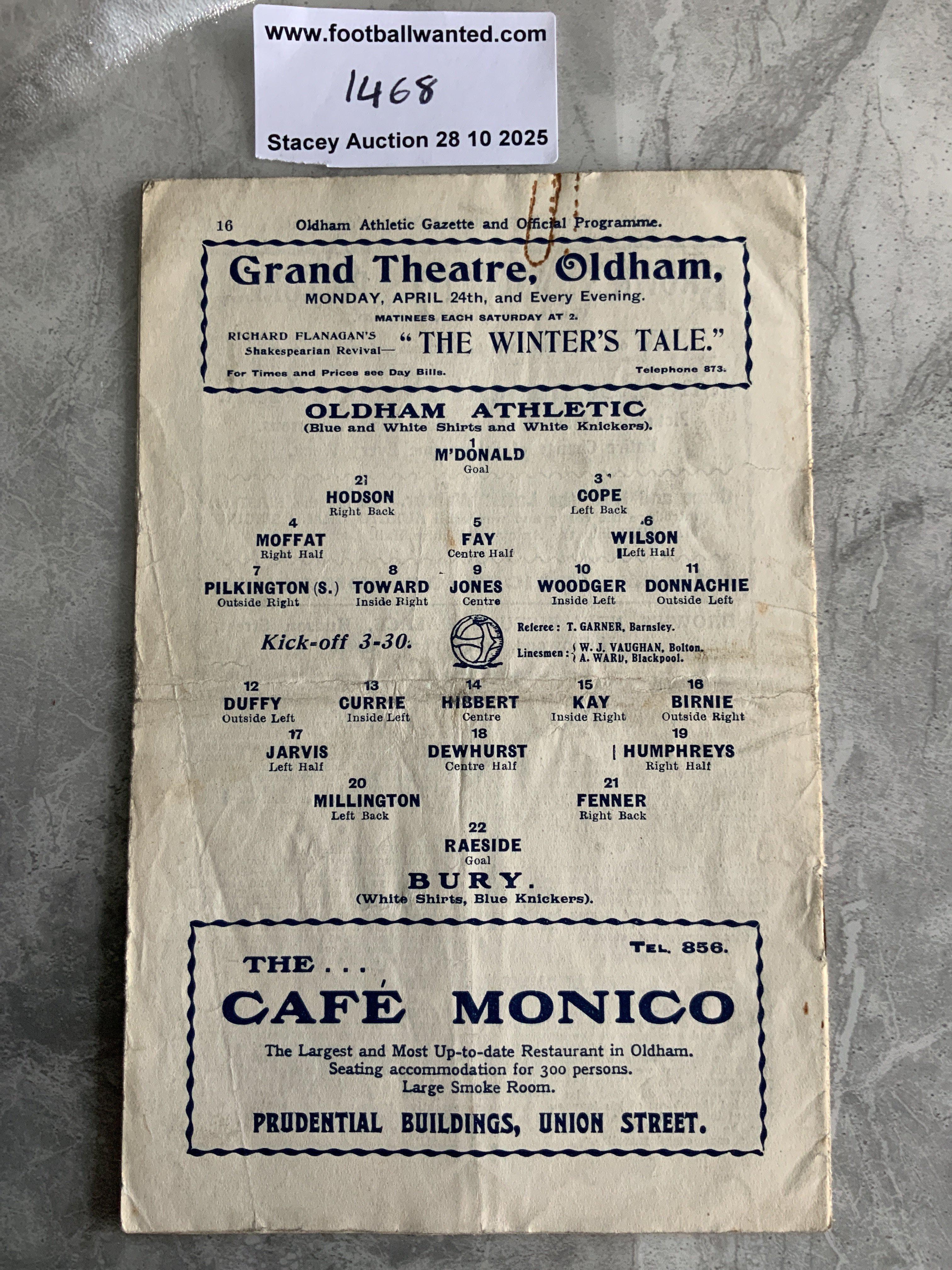 1910 - 1911 Oldham v Bury Football Programme: 1st Division match in very good condition with no team changes.