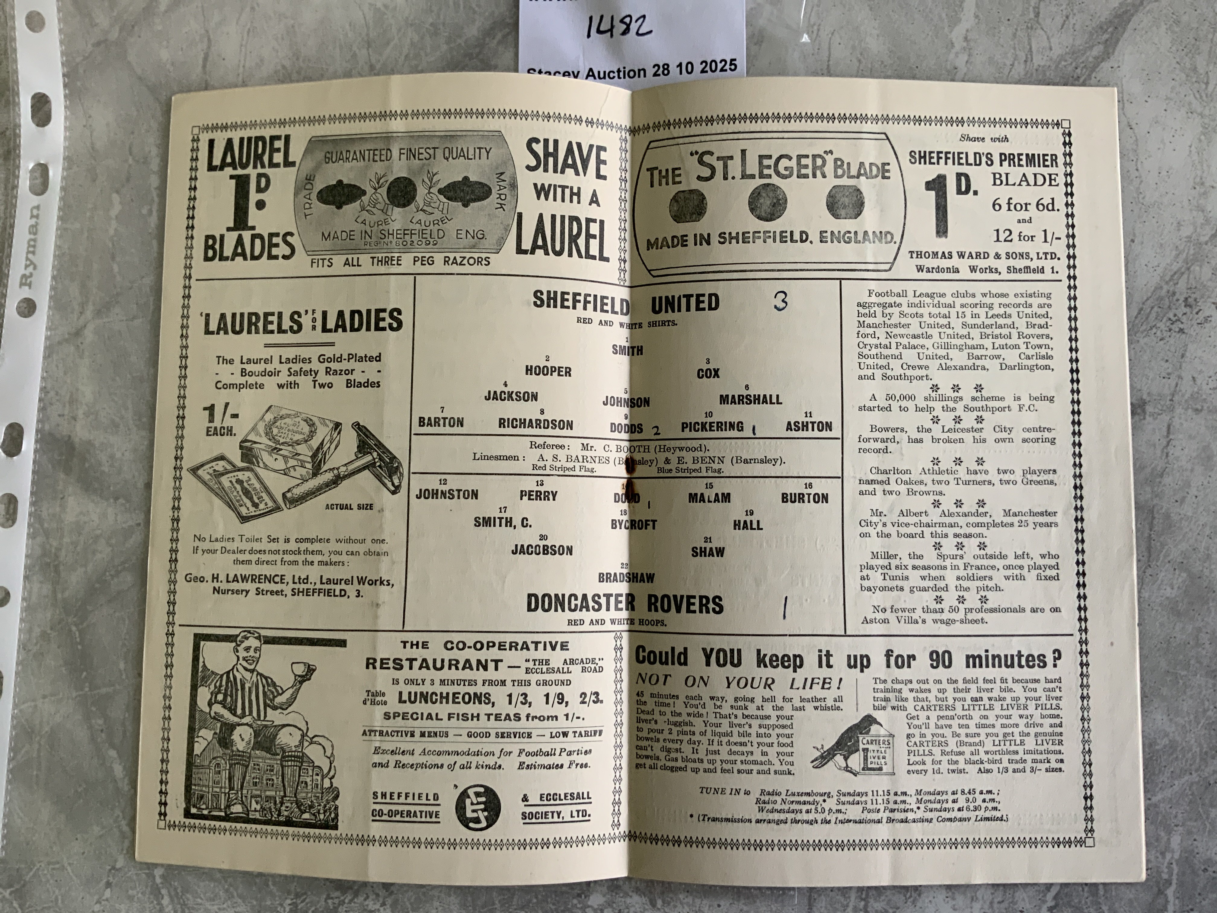 36/37 Sheffield United v Doncaster Rovers Football Programme: 2nd Division match in very good condition with no team changes. Rusty staple holding firm. Score to team page.